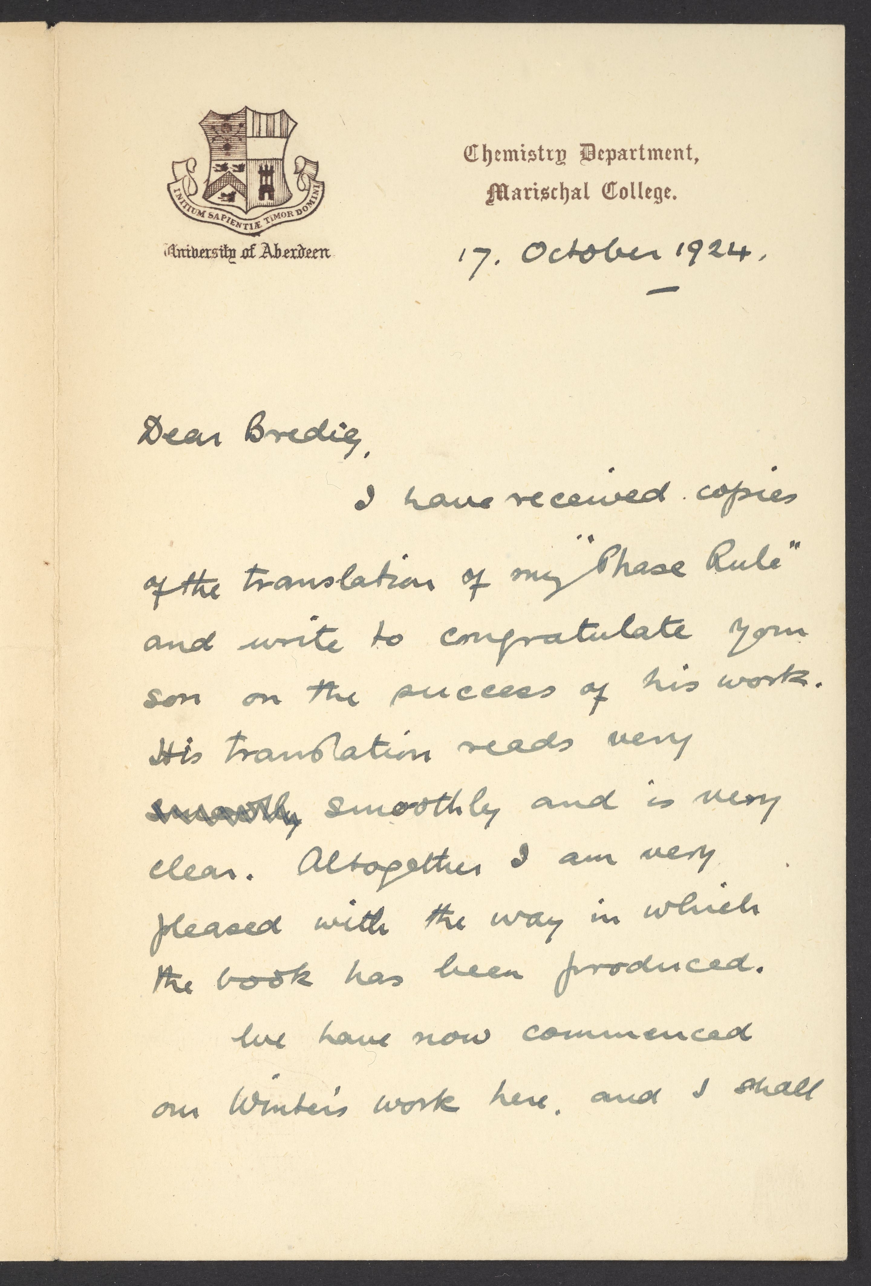 I have received copies of the translation of my “Phase Rule” and write to congratulate you son on the process of this work. This translation reads very smoothly and is very clear. Altogether I am very pleased with the way in which the book has been produced. We have now commenced on Winker’s work here and I shall