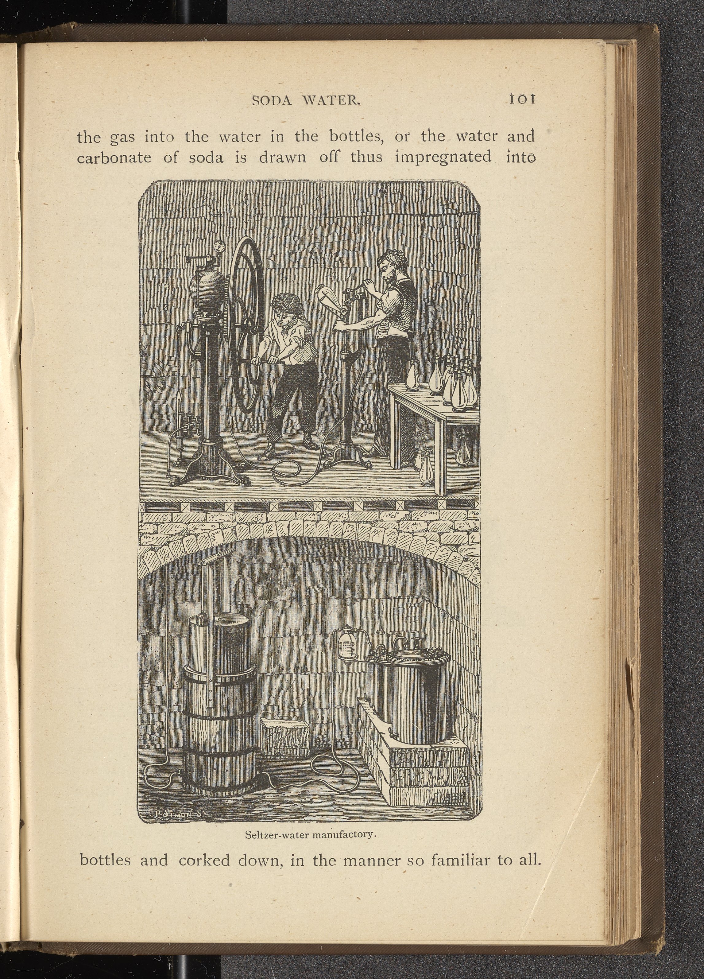 Ward, Lock. “Seltzer-Water Manufactory.” Wonders of Electricity and the Elements, Being a Popular Account of Modern Electrical and Magnetic Discoveries, Magnetism and Electric Machines, the Electric Telegraph and the Electric Light, and the Metal Bases, Salt, and Acids. London, England, 1870–1900. https://digital.sciencehistory.org/works/yqlk21f.