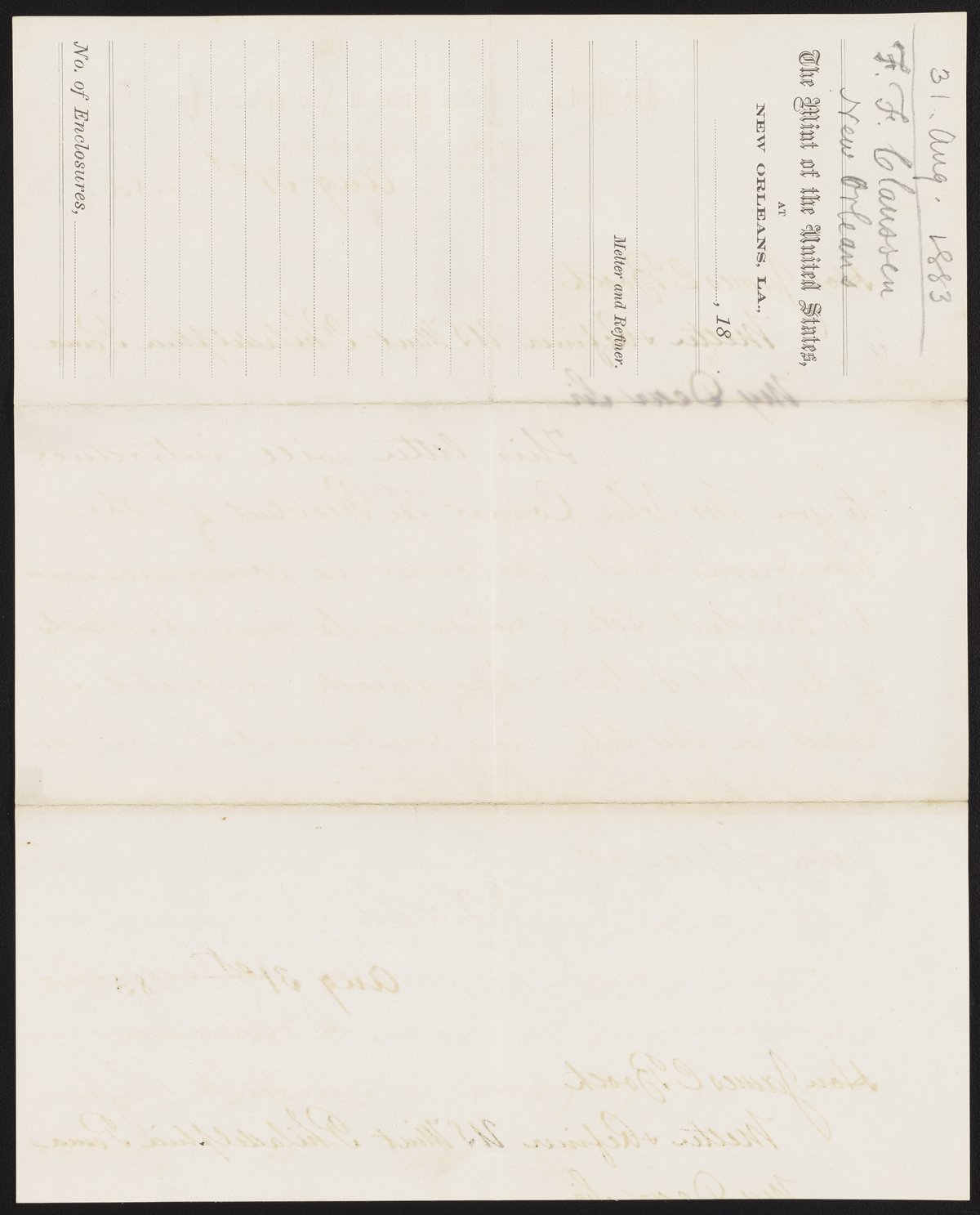 Small JPG1200 x 1484px — 233 KBLarge JPG2880 x 3561px — 1.1 MBFull-sized JPG5266 x 6512px — 3.2 MBOriginal fileTIFF — 5266 x 6512px — 98.2 MBFrancis F. Claussen, assayer of the United States Mint at New Orleans, La., writes to James Curtis Booth (1810-1888) to request that a Mr. Connor, who is minting coins for Honduras, be allowed to tour the Mint’s facilities in Philadelphia.