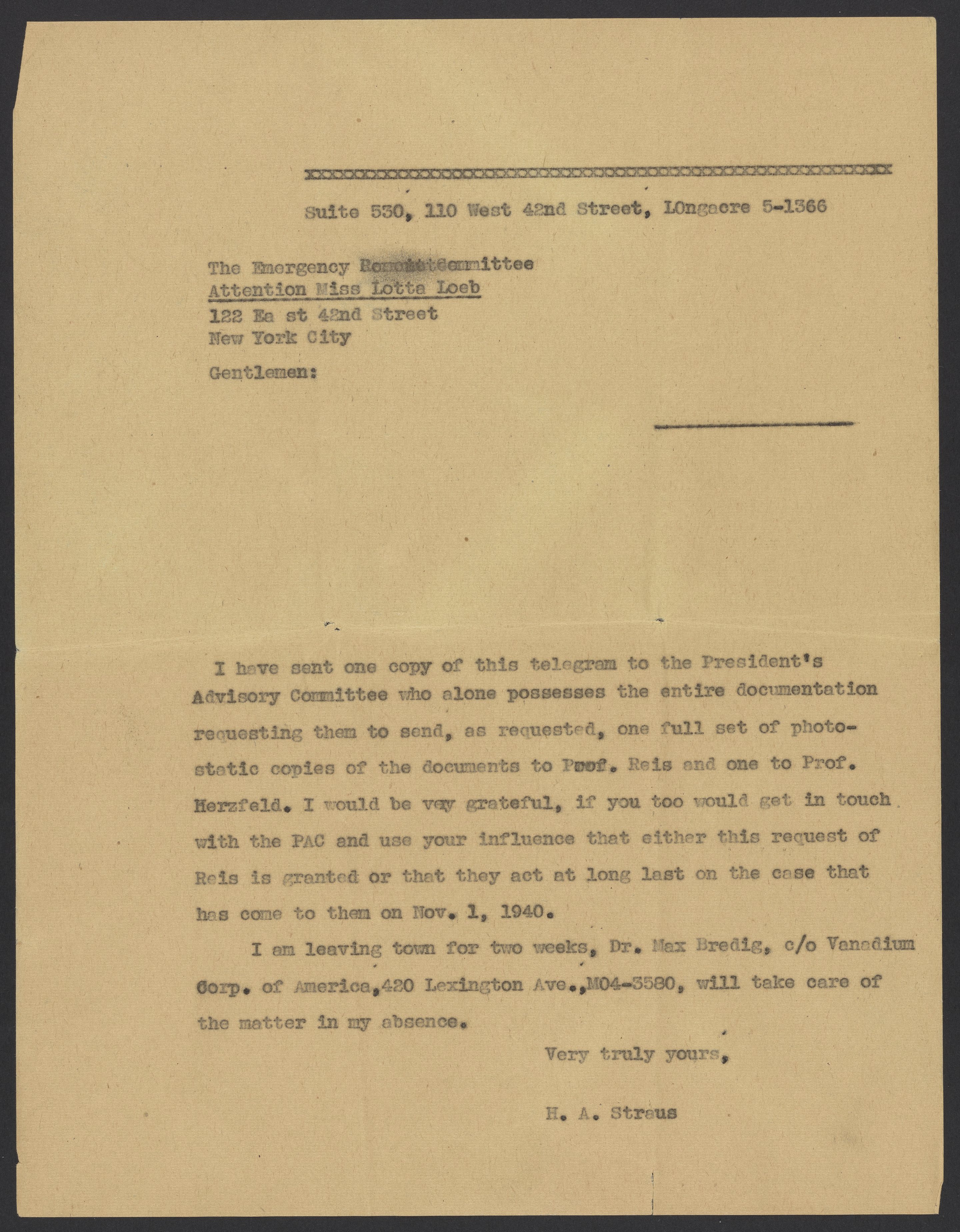 Letter from H. A. Straus to The Emergency Rescue Committee