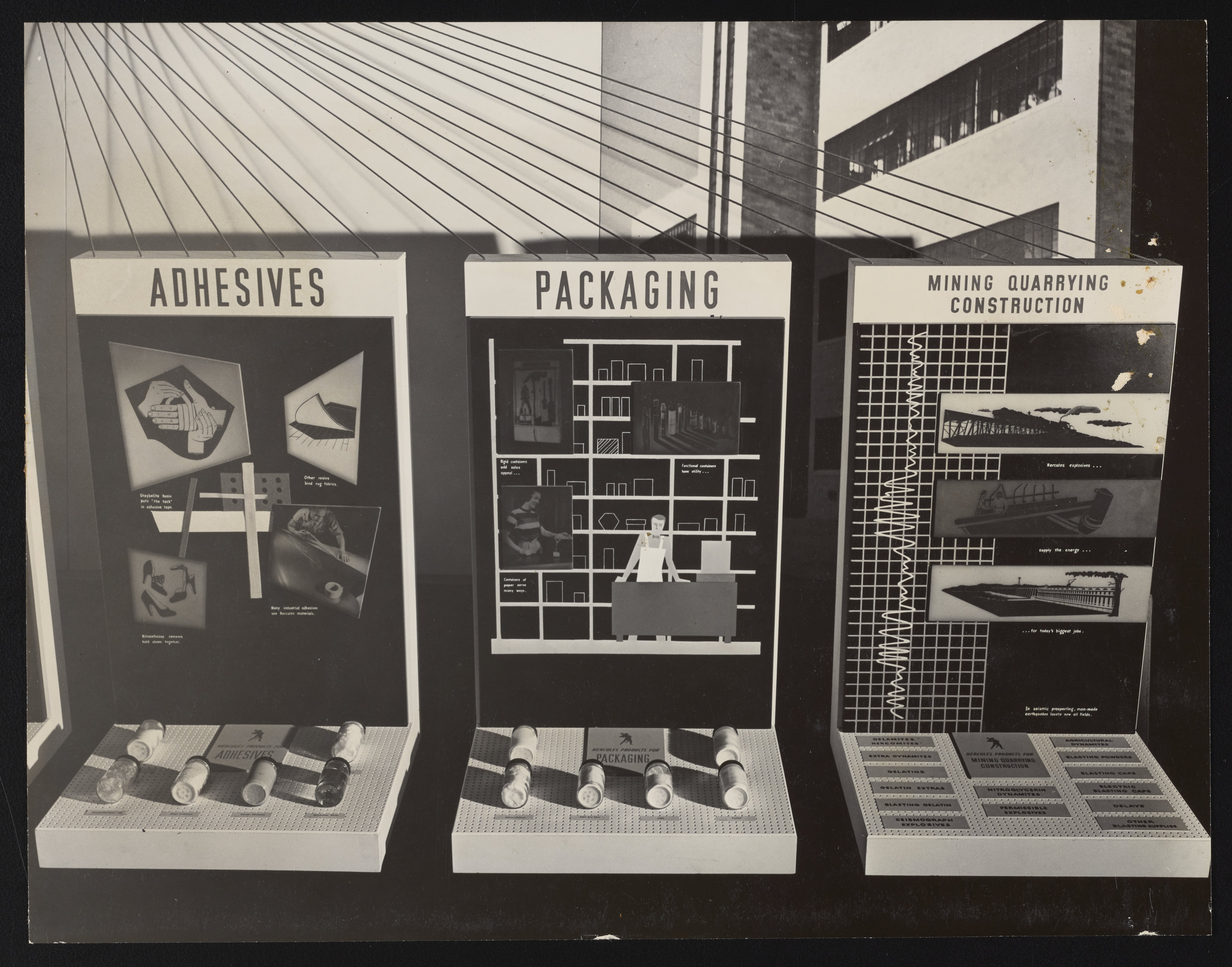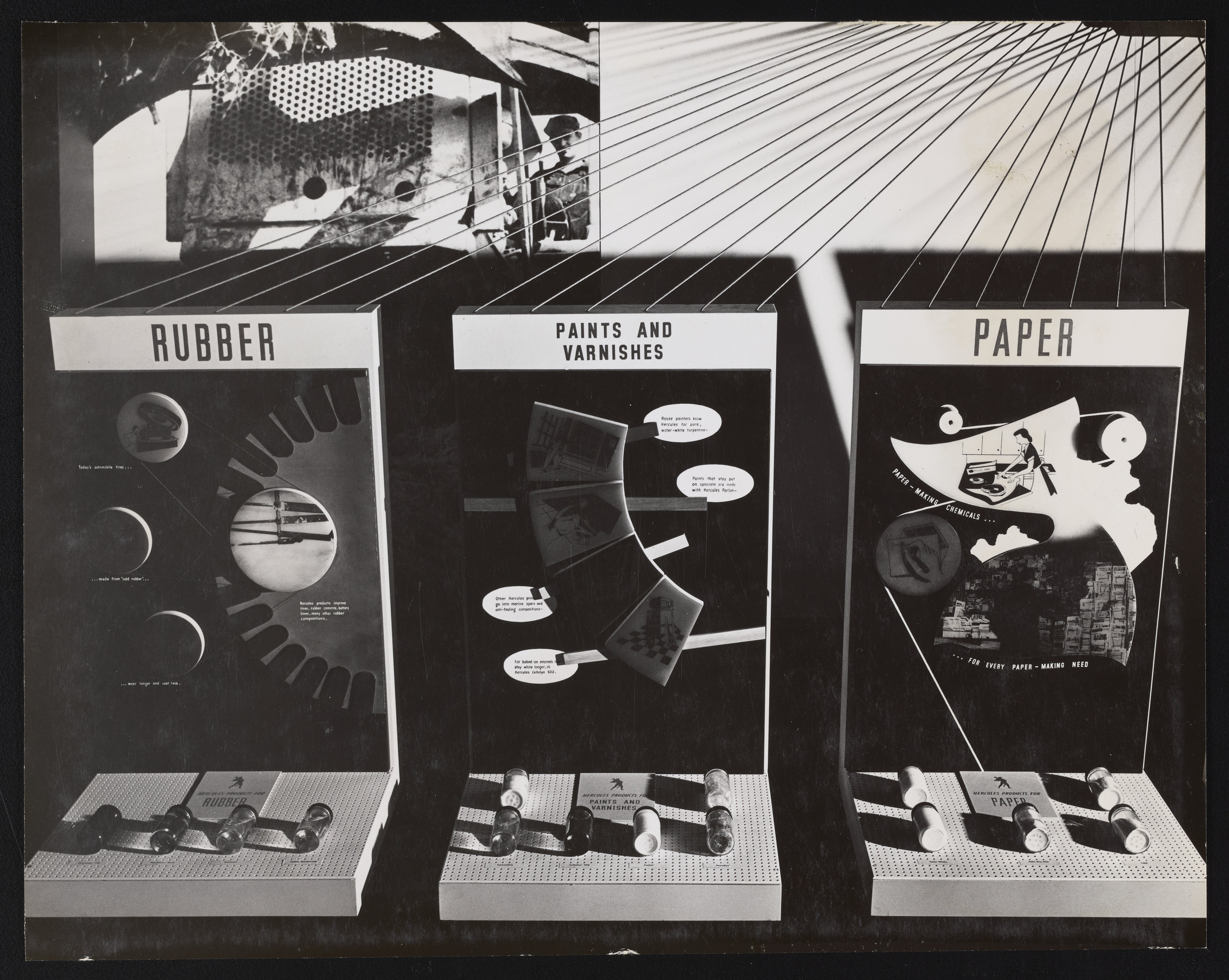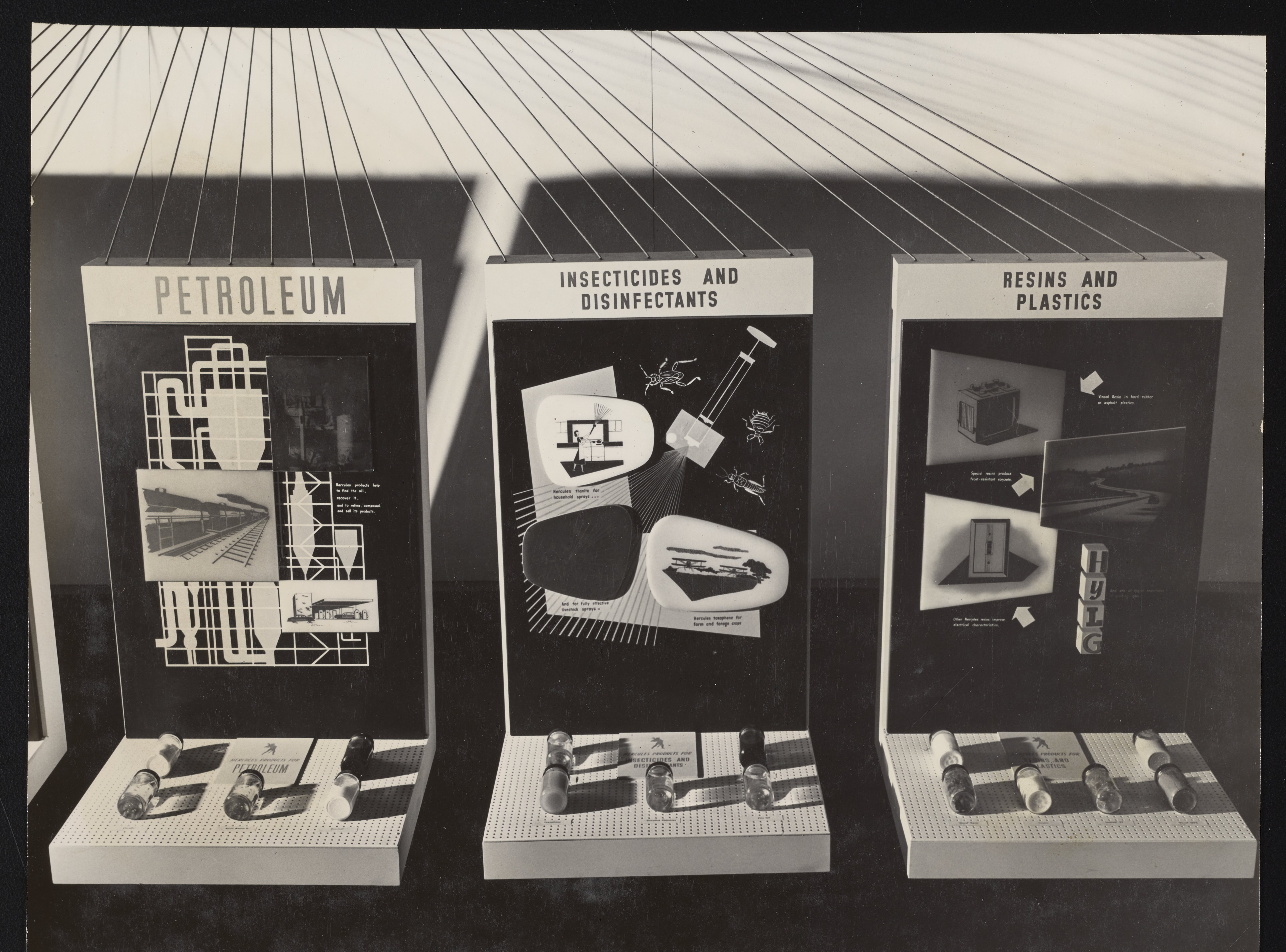 Small JPG1200 x 957px — 215 KBLarge JPG2880 x 2297px — 985 KBFull-sized JPG6218 x 4960px — 3.5 MBOriginal fileTIFF — 6218 x 4960px — 88.3 MBSeries of photographs depicting exhibition display panels showcasing various industrial applications of chemicals manufactured and sold by the Hercules Powder Company.