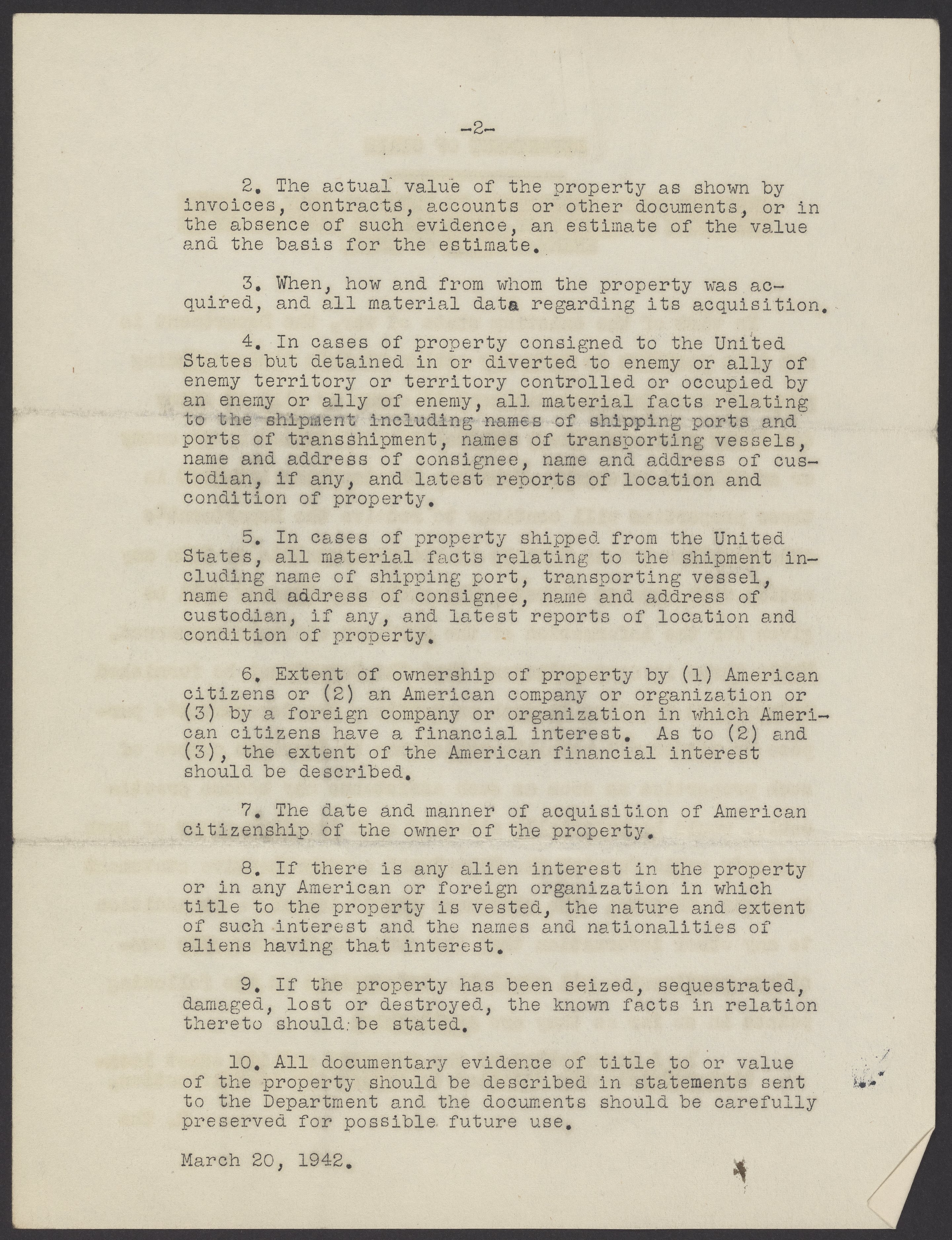 United States. Department of State. “American-Owned Properties in Enemy or Ally of Enemy Territory or Territory Controlled or Occupied by an Enemy or Ally of Enemy,” March 20, 1942. Ernst Berl Papers, Box 2, Folder 46. Science History Institute. Philadelphia. https://digital.sciencehistory.org/works/yzax1c1.