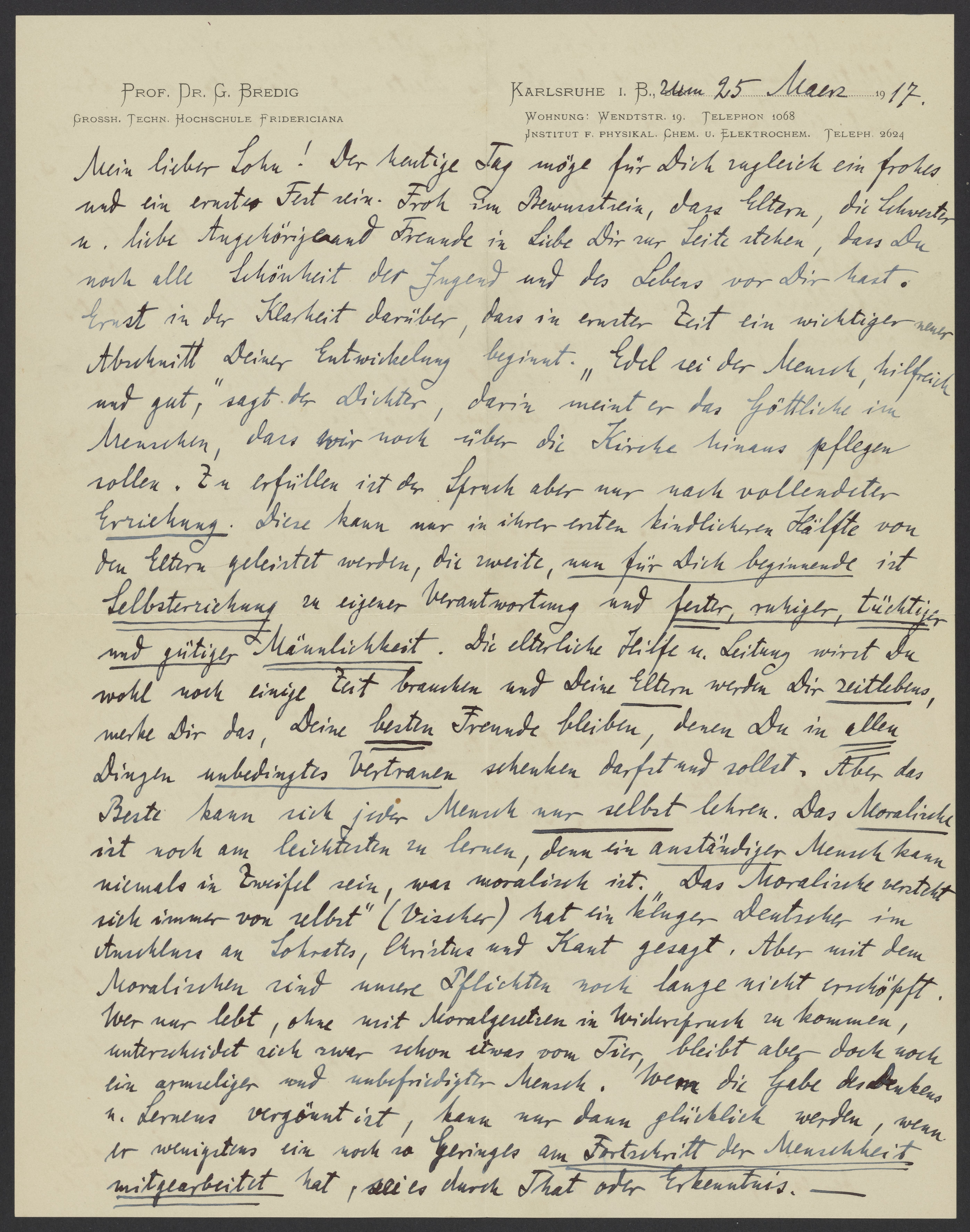 Mein lieber Sohn! Der heutige Tag möge für Dich zugleich ein frohes und ernstes Fest rein. Froh im Bewusstsein, dass Eltern, die Schwester, u. liebe Angehörige und Freund in Liebe Dir zur Seite stehen, dass Du noch alle Schönheit der Jugend und des Lebens vor Dir hast. Ernst in der Klarheit darüber, dass in erster Zeit ein wichtiger neuer Abschnitt Deiner Entwicklung beginnt. „Edel sei der Mensch, hilfreich und gut,“ sagt der Dichter, darin meint er das Göttliche im Menschen, dass wir noch über die Kirche hinaus pflegen sollen. Zu erfüllen ist der Spruch aber nur nach vollendeter Erziehung. Diese kann nur in ihrer ersten kindlichen Hälfte von den Eltern geleistet werden, die zweite nun für Dich beginnend ist Selbsterziehung zu eigener Verantwortung und fester, ruhiger, tüchtiger und gütiger Männlichkeit. Die elterliche Hilfe u. Leitung wirst Du wohl noch einige Zeit brauchen und Deine Eltern werden Dir zeitlebens, merke Dir das, Deine besten Freunde bleiben, denen Du in allen Dingen unbedingtes Vertrauen schenken darfst und sollst. Aber das Beste kann sich jeder Mensch nur selbst lehren. Das Moralische ist noch am leichtesten zu lernen, denn ein anständiger Mensch kann niemals in Zweifel sein, was moralisch ist. „Das Moralische versteht sich immer von selbst“ (Zischer) hat ein klüger Deutscher im Anschluss an Sokrates, Christus und Kant gesagt. Aber mit dem Moralischen sind unsere Pflichten noch lange nicht erschöpft. Wer nur lebt, ohne mit Moralgesetzen in Widerspruch zu kommen, unterscheidet sich zwar schon etwas von Tier, bleibt aber doch noch ein armseliger und unbefriedigter Mensch. Wenn die Gabe des Denkens u. Lernens vergönnt ist, kann nur dann glücklich werden, wenn er wenigstens ein noch so Geringes am Forschritt der Menschheit mitgearbeitet hat, sei es durch That oder Erkenntnis.