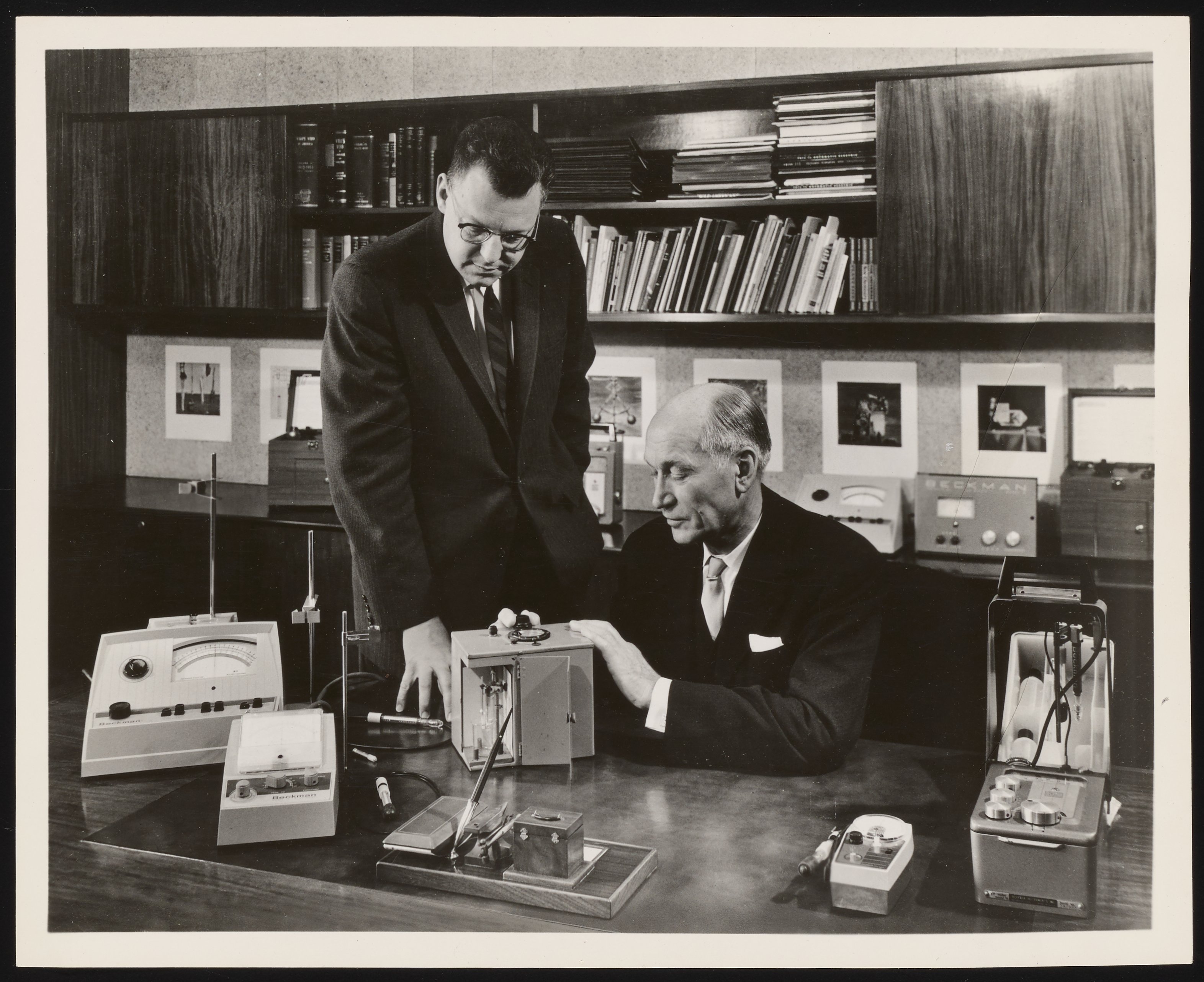 “Arnold O. Beckman and an Unidentified Man with Beckman Instruments Products,” n.d. Beckman Historical Collection, Box 55, Folder 2. Science History Institute. Philadelphia. https://digital.sciencehistory.org/works/z029p479v.