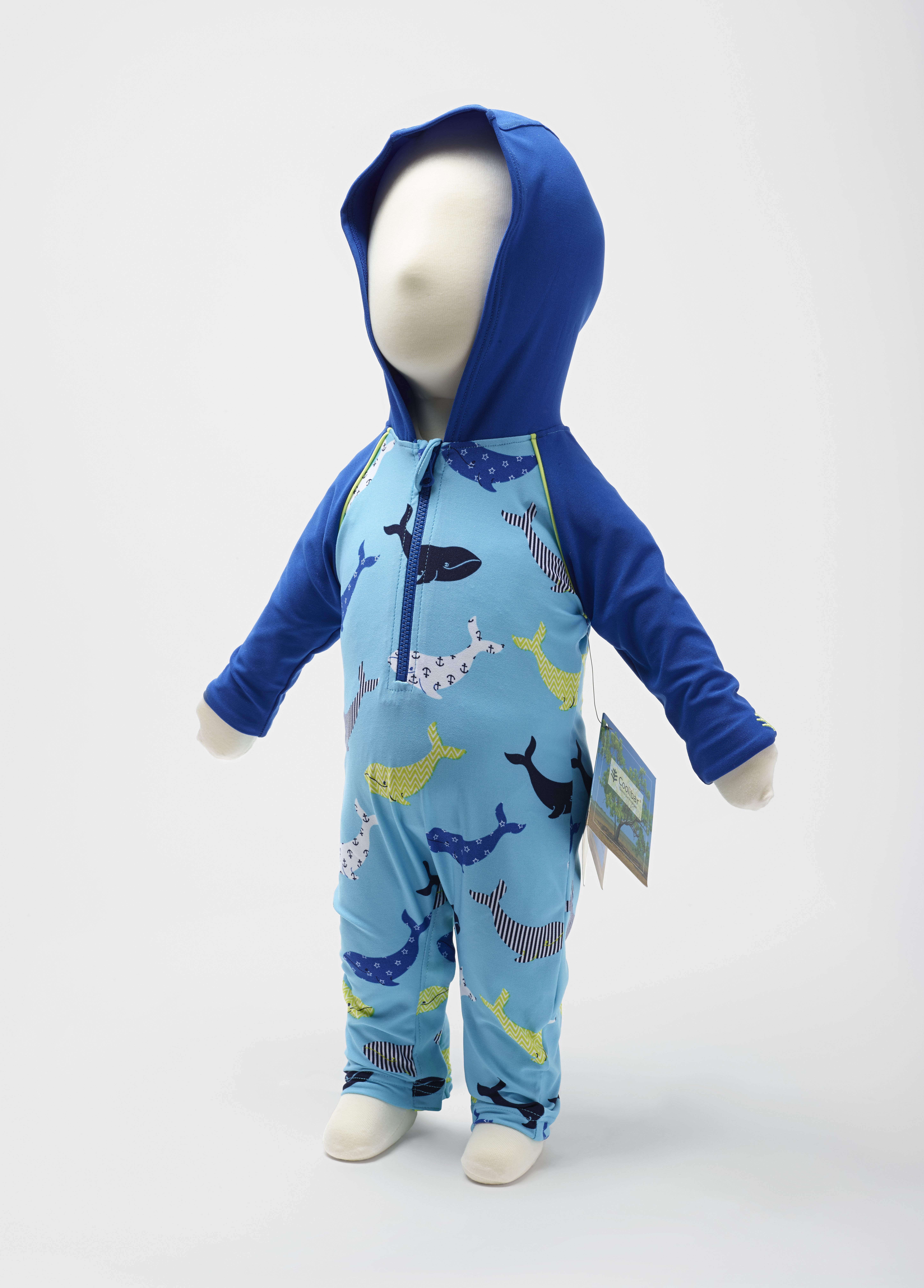 The Coolibar hooded one-piece swimsuit for a small child is constructed with four-way stretch knit (polyester and spandex). The hood protects the infant's neck and head while the zipper and snap buttons eases putting on and taking off the garment as well as changing the infant's diaper. The fibers used in the garment are embedded with zinc oxide or titanium dioxide which allows for protection against the sun's UV rays and are tightly woven. The garment offers UPF 50+ coverage. Machine wash, line dry recommended for care.