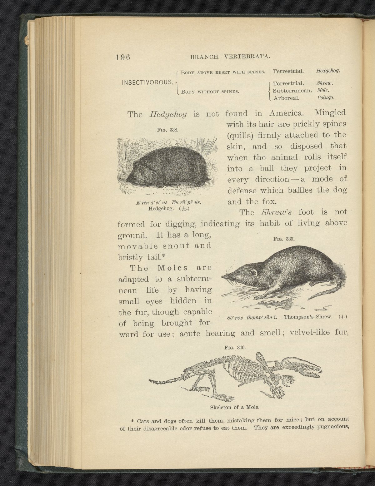Steele, Joel Dorman, and Jenks, J. W. P. (John Whipple Potter). “Figure 338. Hedgehog. Figure 339. Thompson's Shrew. Figure 340. Skeleton of a Mole.” Popular Zoology. New York, New York: Chautauqua Press, 1887. https://digital.sciencehistory.org/works/z0r9htb.