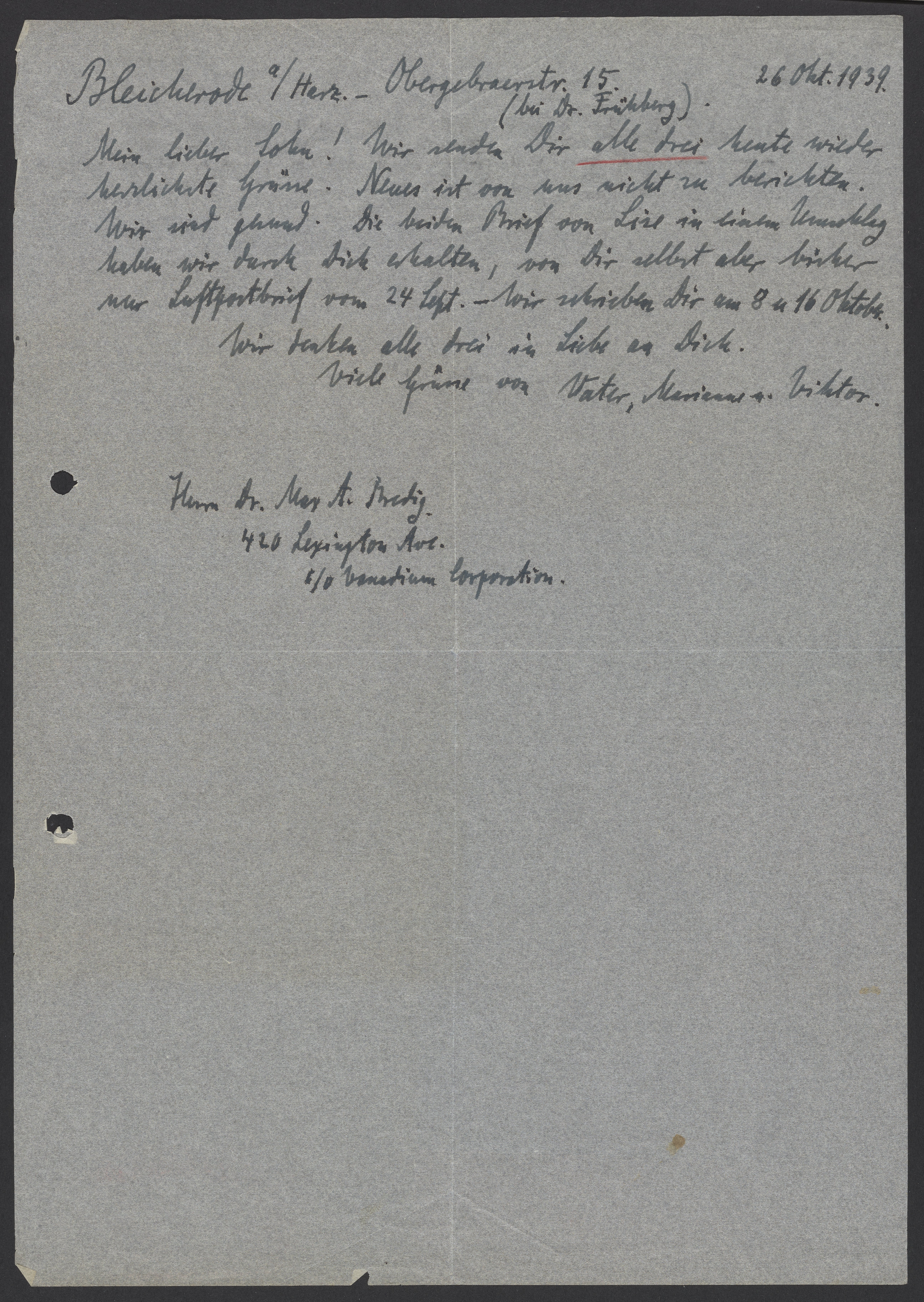 Letter from Georg Bredig to Max Bredig, October 26, 1939