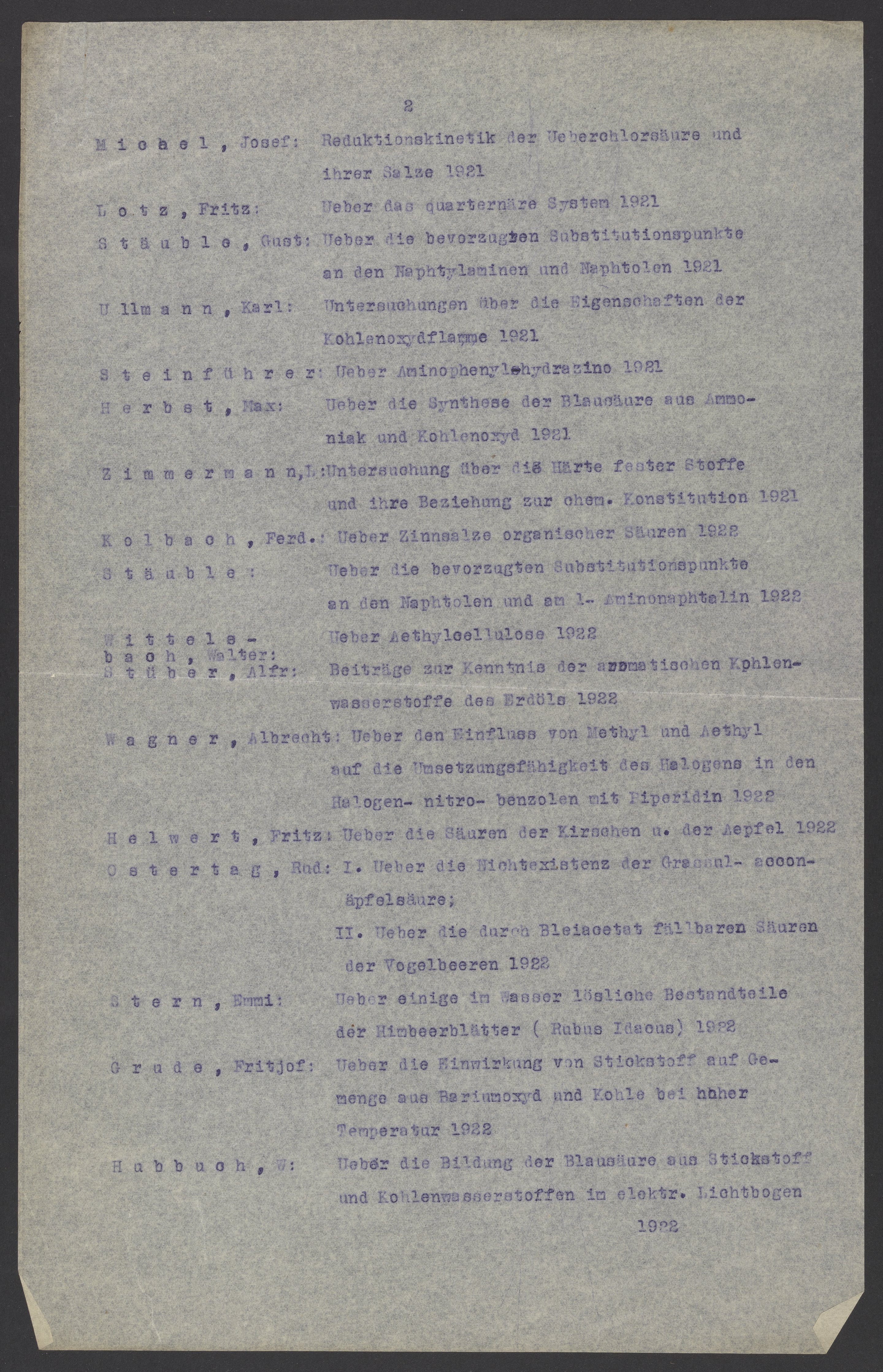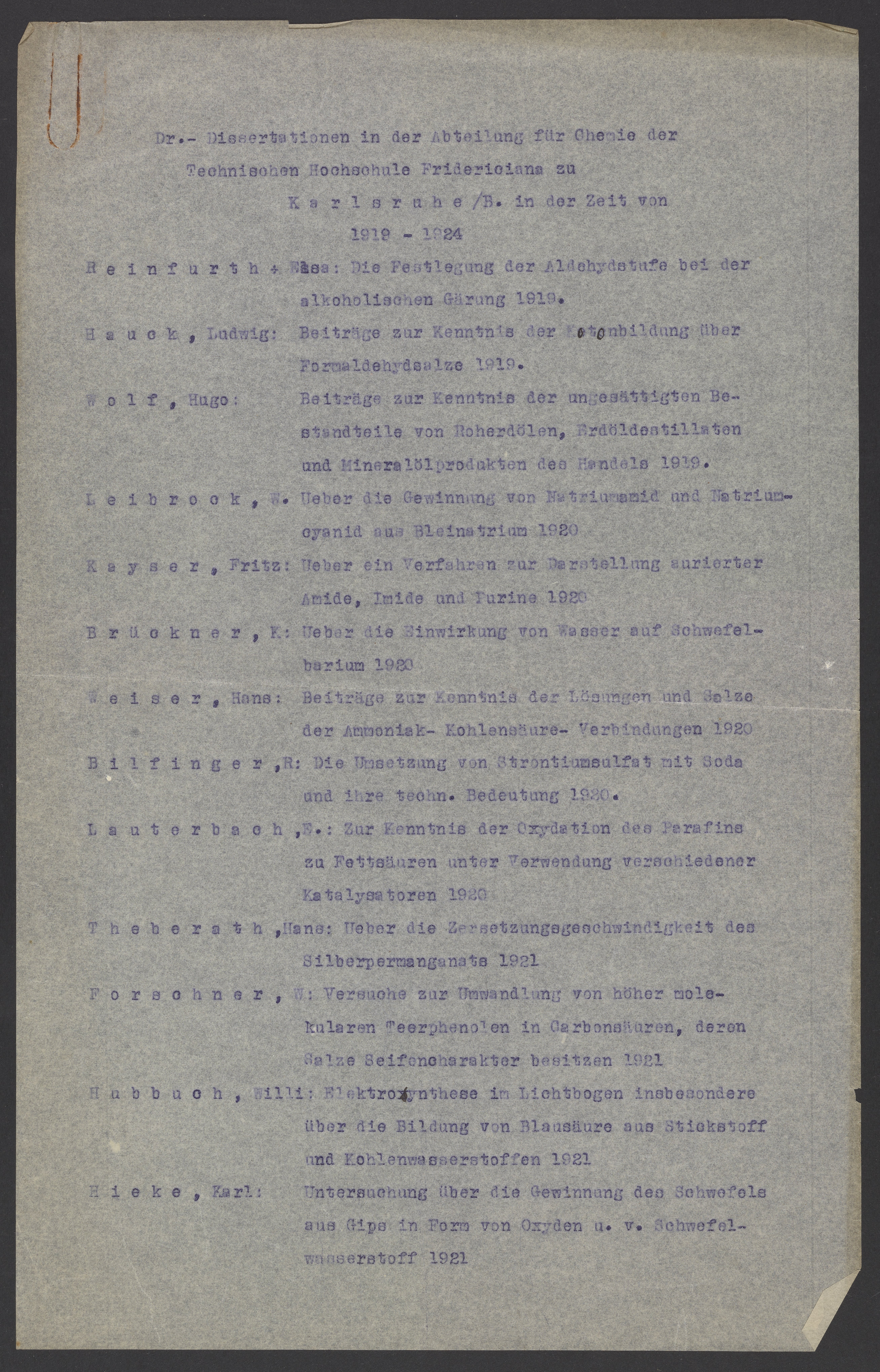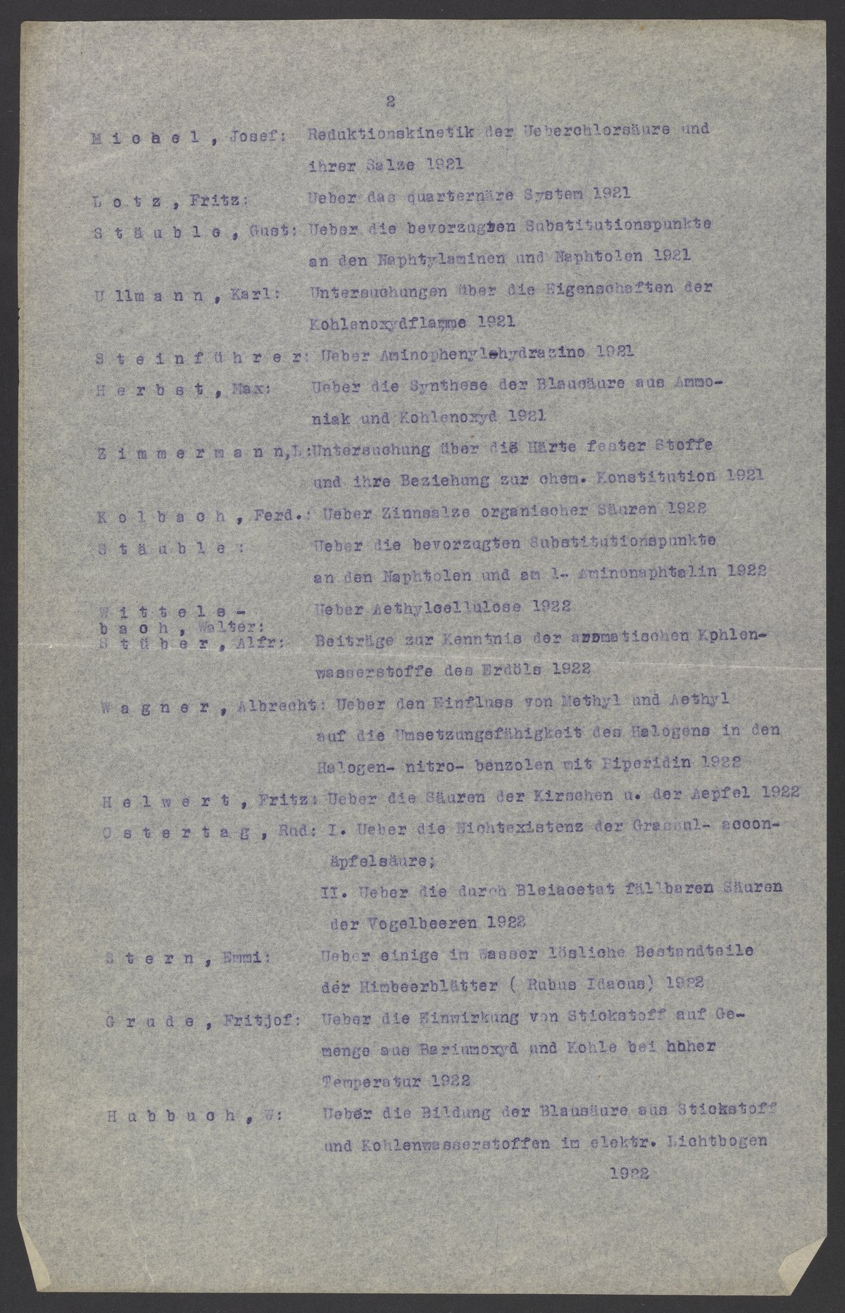 Technische Hochschule Karlsruhe. “List of Dissertations in the Department of Chemistry at Karlsruhe Technical University, 1919-1925,” circa 1925. Papers of Georg and Max Bredig, Box 3, Folder 27. Science History Institute. Philadelphia. https://digital.sciencehistory.org/works/z1wmnto.