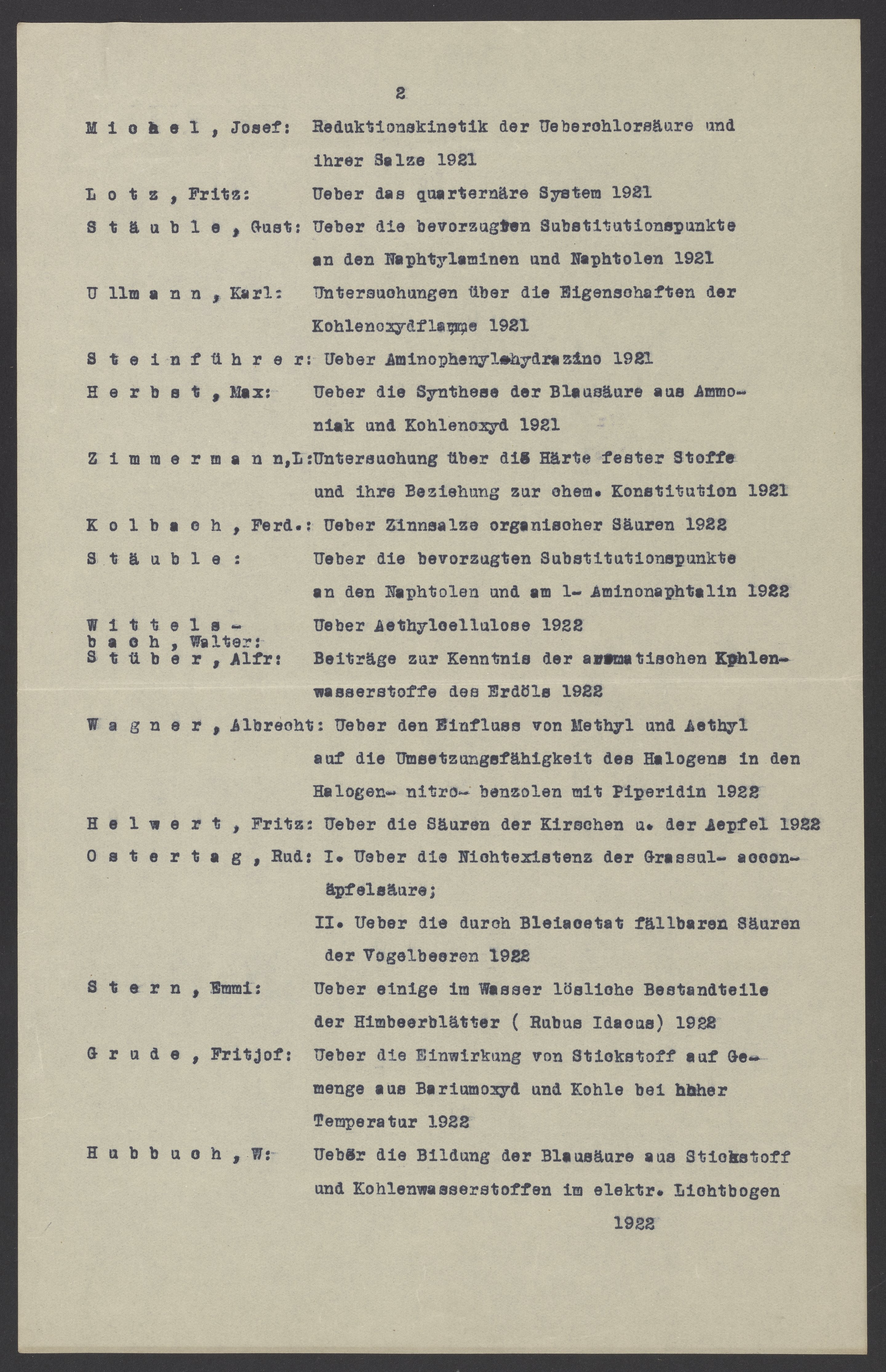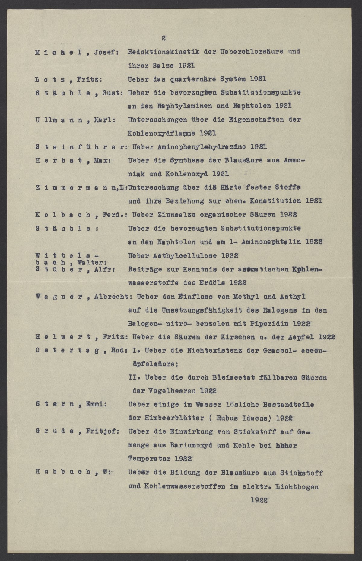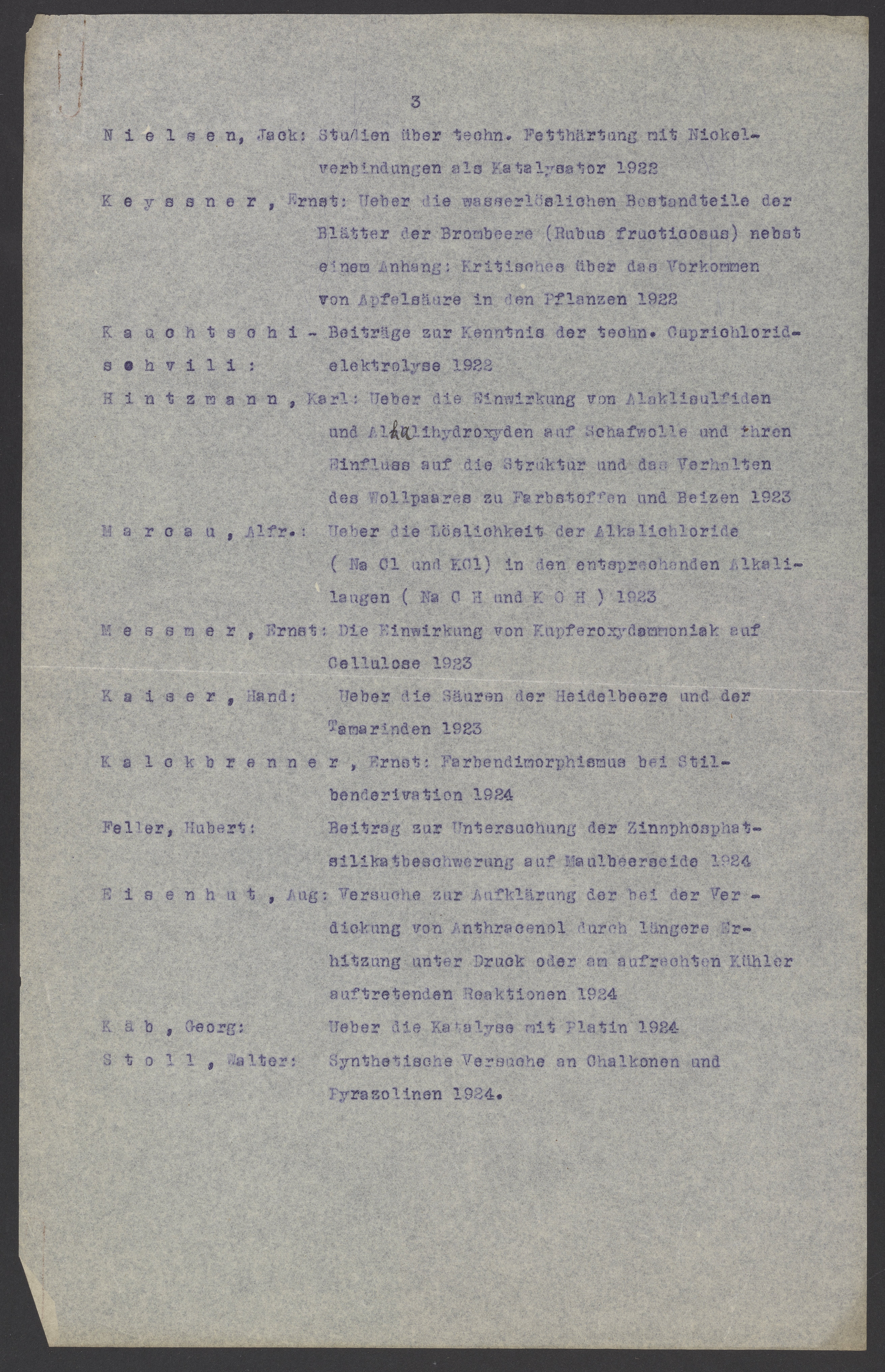 Technische Hochschule Karlsruhe. “List of Dissertations in the Department of Chemistry at Karlsruhe Technical University, 1919-1925,” circa 1925. Papers of Georg and Max Bredig, Box 3, Folder 27. Science History Institute. Philadelphia. https://digital.sciencehistory.org/works/z1wmnto.