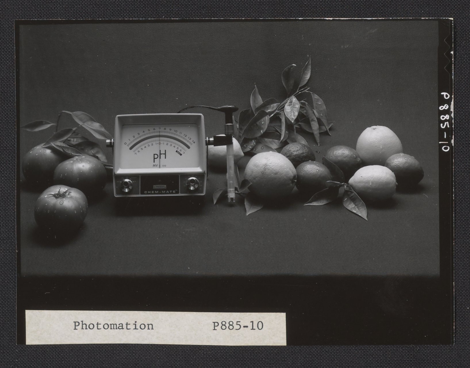 Photomation. “Beckman Chem-Mate PH Meter with Fruit,” circa 1975. Beckman Historical Collection, Box 86. Science History Institute. Philadelphia. https://digital.sciencehistory.org/works/z316q1946.