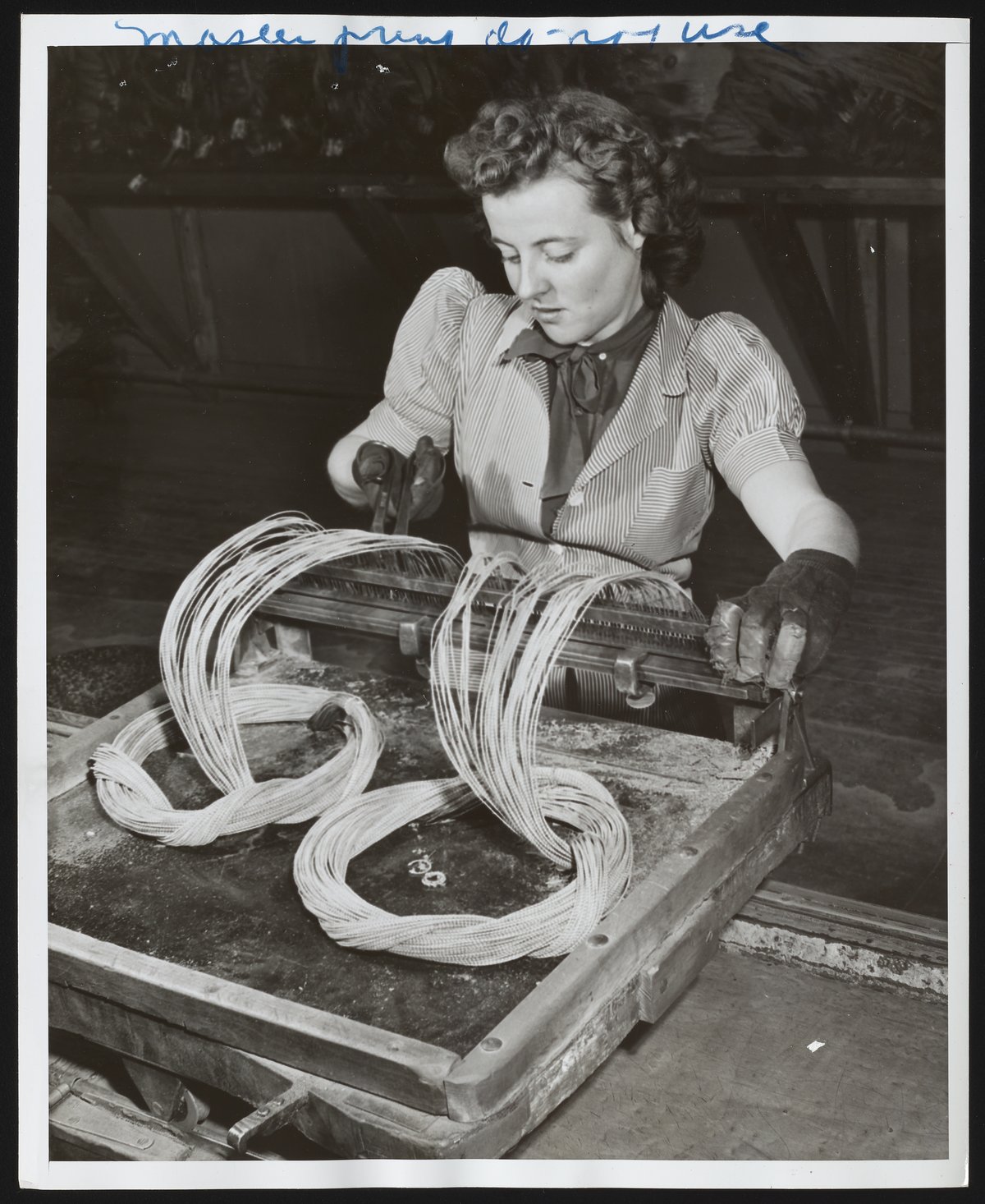 Hercules Incorporated. “Employee Trimming Bridge Wires at Hercules Port Ewen Plant,” circa 1955. Photographs from the Records & Ephemera of Hercules Incorporated, Box 2, Folder 37. Science History Institute. Philadelphia. https://digital.sciencehistory.org/works/z316q202p.