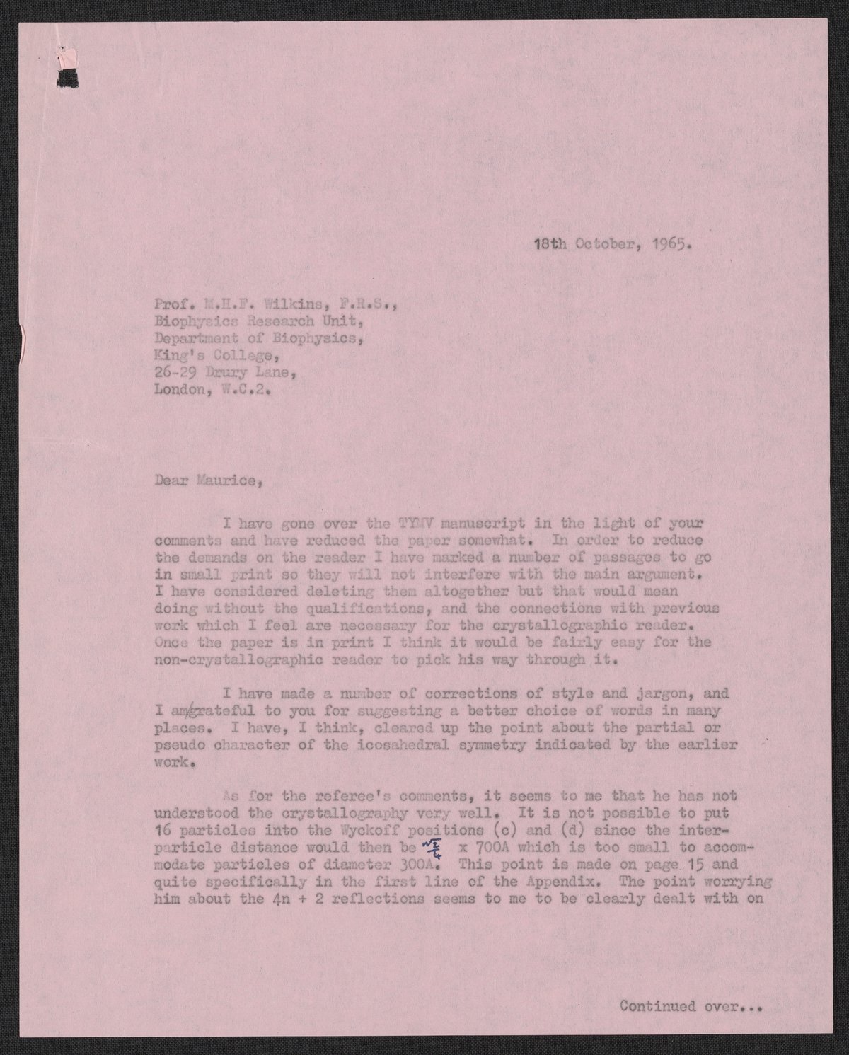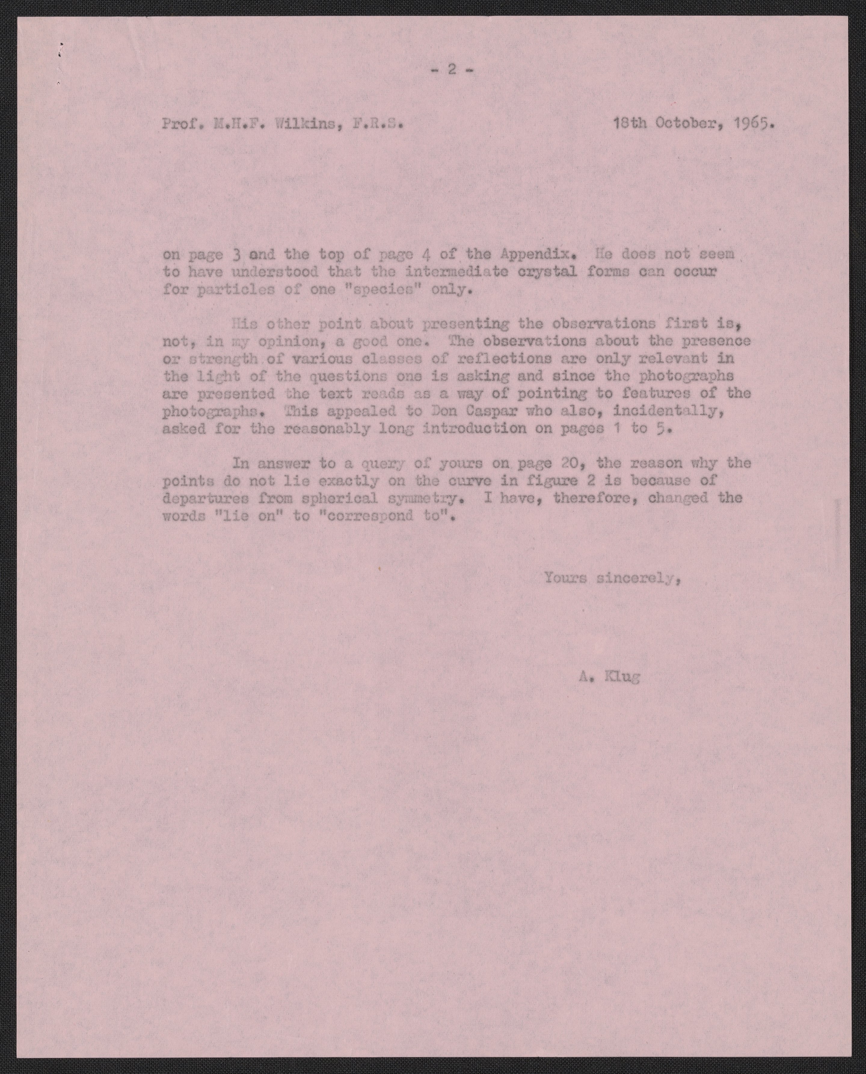 Letter from Aaron Klug to Maurice Wilkins, October 18, 1965