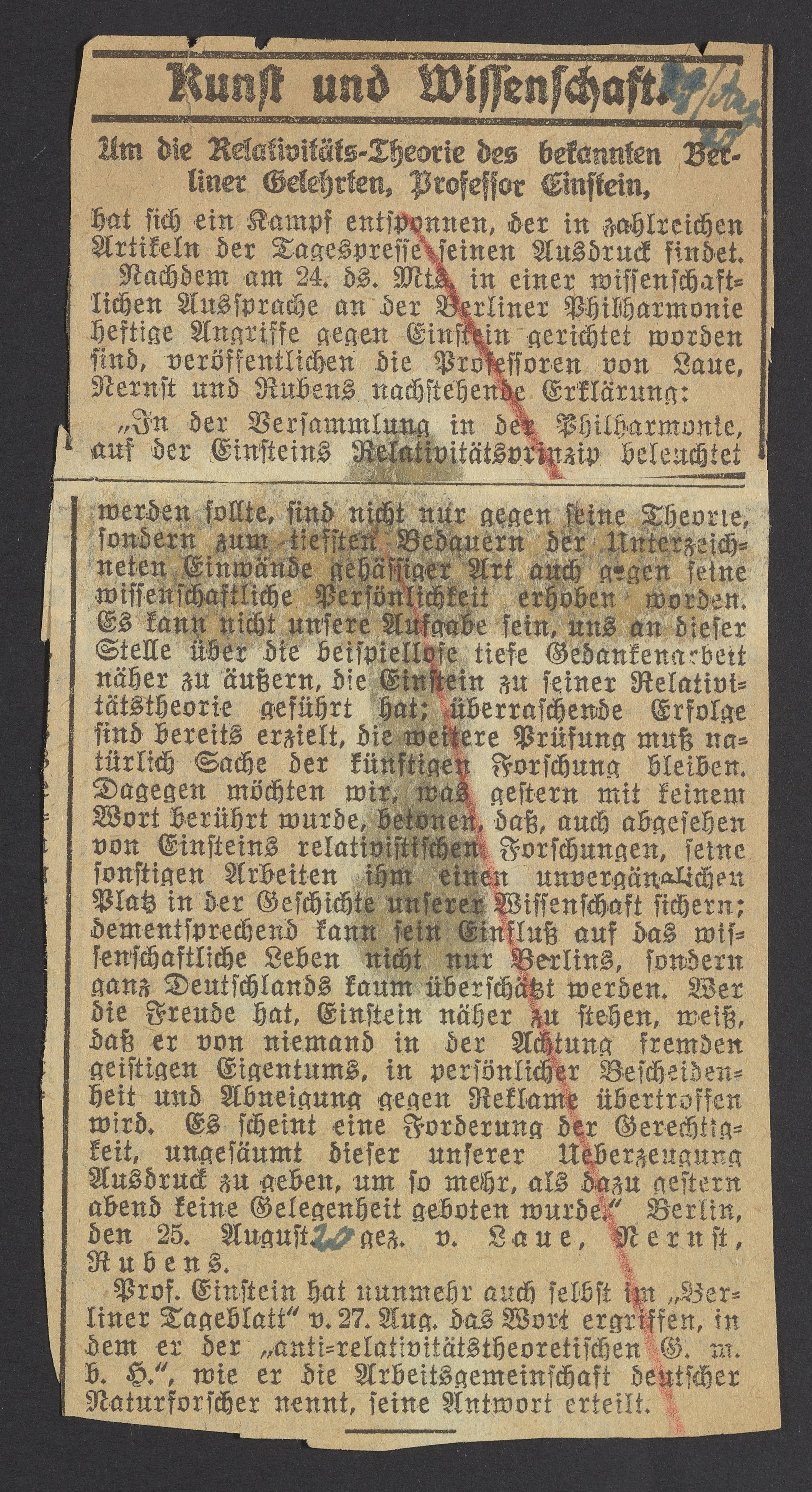 “Um Die Relativitäts-Theorie Des Bekannten Berliner Gelehrten, Professor Einstein,” August 29, 1930. Papers of Georg and Max Bredig, Box 4, Folder 13. Science History Institute. Philadelphia. https://digital.sciencehistory.org/works/z4n0ebv.