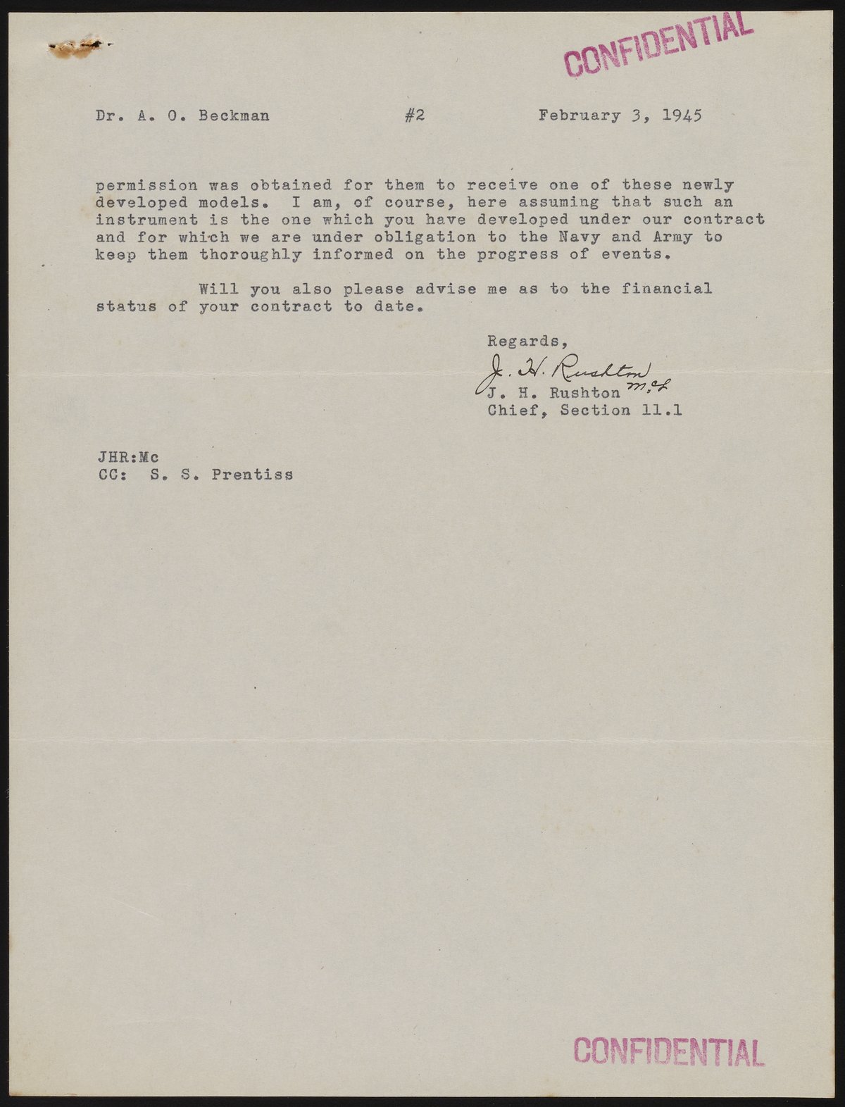 Rushton, J. H. “Letter from J. H. Rushton to Arnold O. Beckman,” February 3, 1945. Beckman Historical Collection, Box 19, Folder 8. Science History Institute. Philadelphia. https://digital.sciencehistory.org/works/z603qx87v.