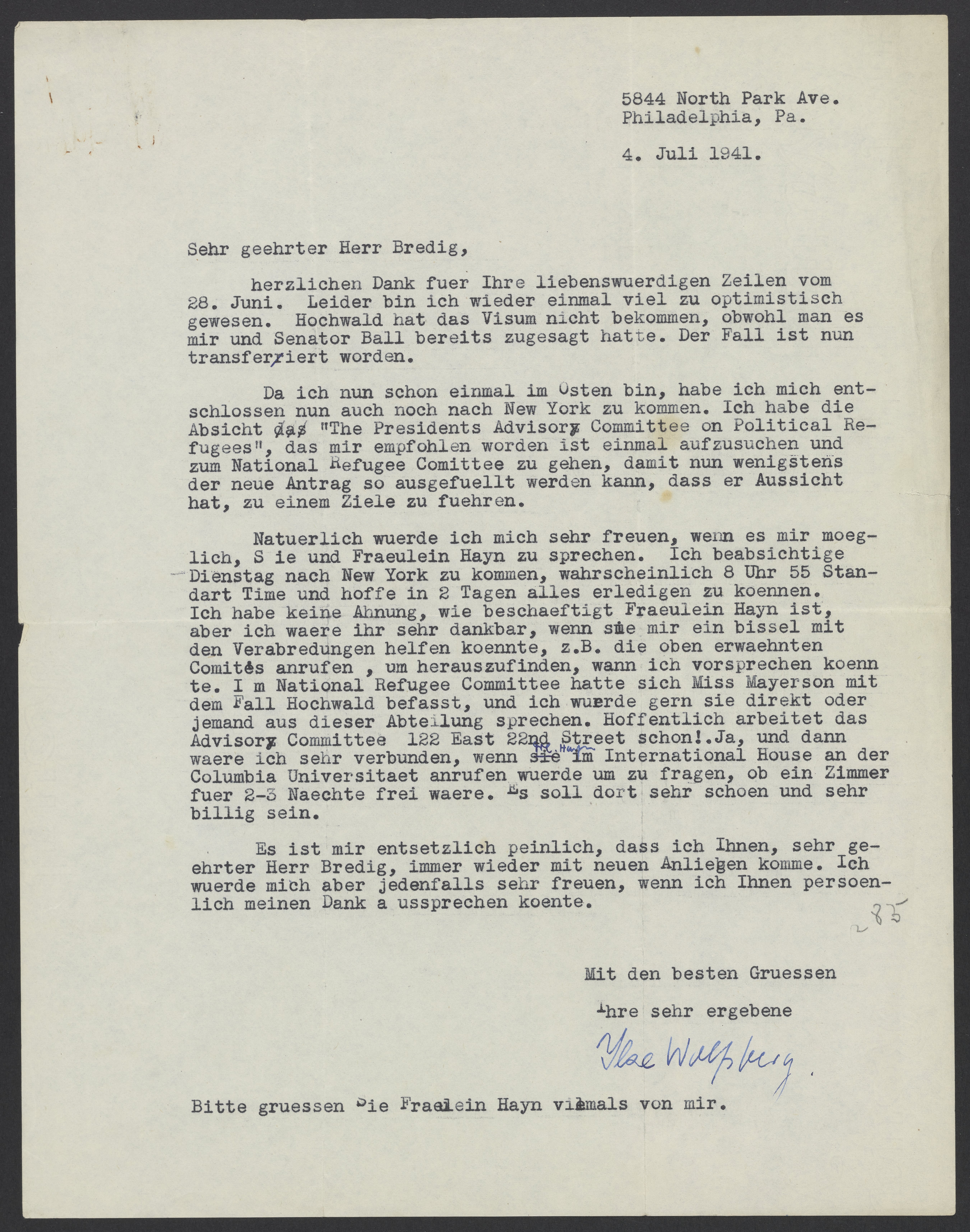 Letter from Ilse Wolfsberg to Max Bredig, July 4, 1941
