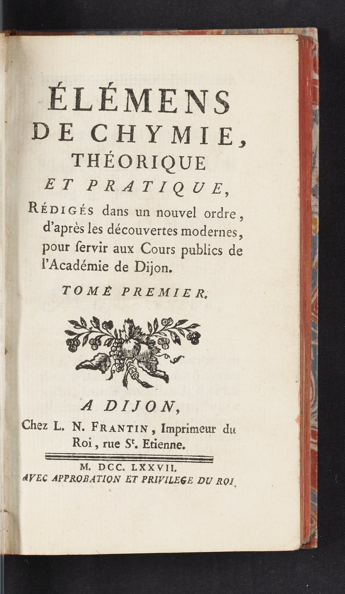 Morveau, Louis-Bernard Guyton de. Élémens De Chymie, Théorique Et Pratique. Dijon, France: L. N. Frantin, 1777–1778. https://digital.sciencehistory.org/works/z74nidq.