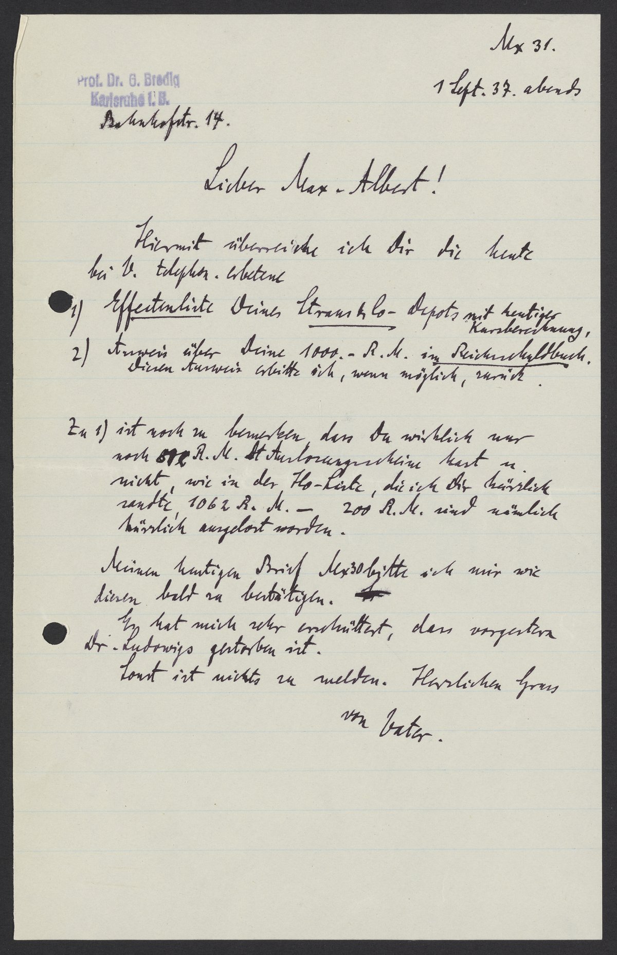 Georg Bredig (1868-1944) updates his son, Max Bredig (1902-1977), on family financial matters.