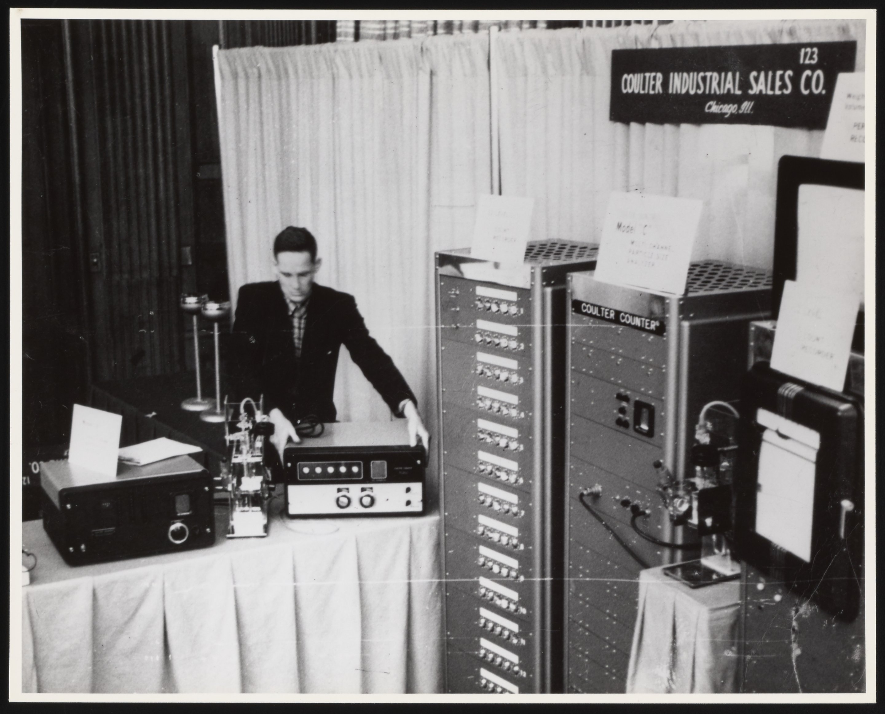 Small JPG1200 x 982px — 89.7 KBLarge JPG2880 x 2357px — 374 KBFull-sized JPG3170 x 2594px — 436 KBOriginal fileTIFF — 3170 x 2594px — 23.6 MBBased on the Coulter principle, the Coulter Counter quantifies and sizes particles suspended in a fluid, like blood cells, bacteria, and a wide variety of other substances. The instrument works by drawing liquid containing the particles through a channel, where each particle releases an electrical charge that is measured and counted. The Coulter principle was discovered by Wallace H Coulter in the late 1940s and patented in 1953. The Coulter counter was manufactured by Coulter Corporation until 1997, when the company was acquired by Beckman Instruments and became known as Beckman Coulter, Inc.