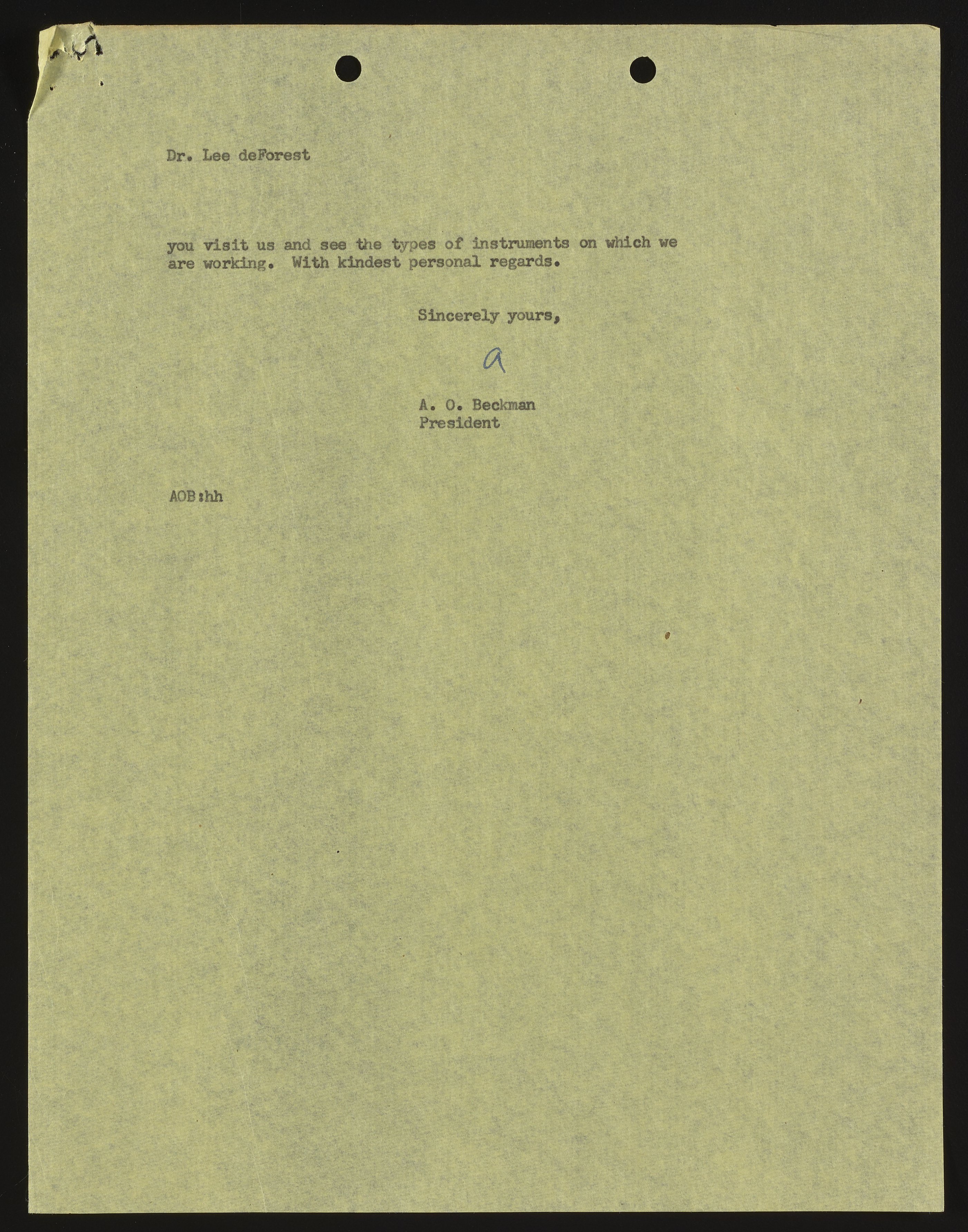 Beckman, Arnold O. “Letter from Arnold O. Beckman to Lee De Forest,” January 7, 1953. Beckman Historical Collection, Box 1, Folder 18. Science History Institute. Philadelphia. https://digital.sciencehistory.org/works/z890rv07b.