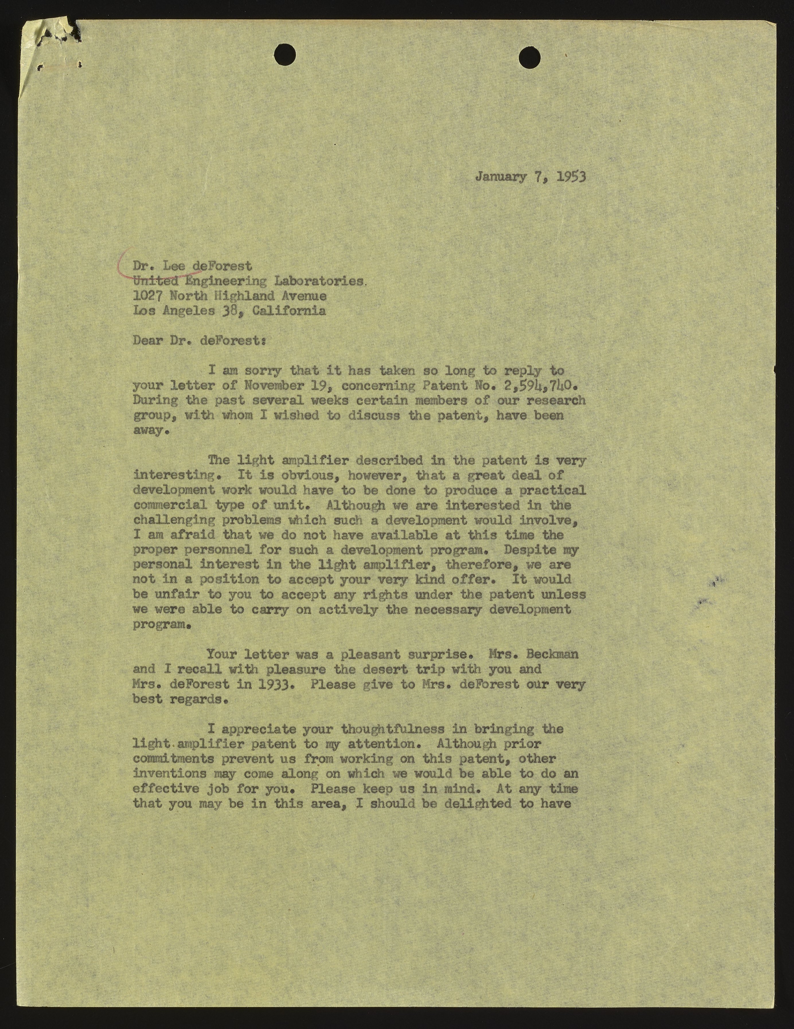 Small JPG1200 x 1554px — 362 KBFull-sized JPG2769 x 3585px — 1.7 MBOriginal fileTIFF — 2769 x 3585px — 28.5 MBIn this letter, Beckman declines to develop de Forest's light amplifier.