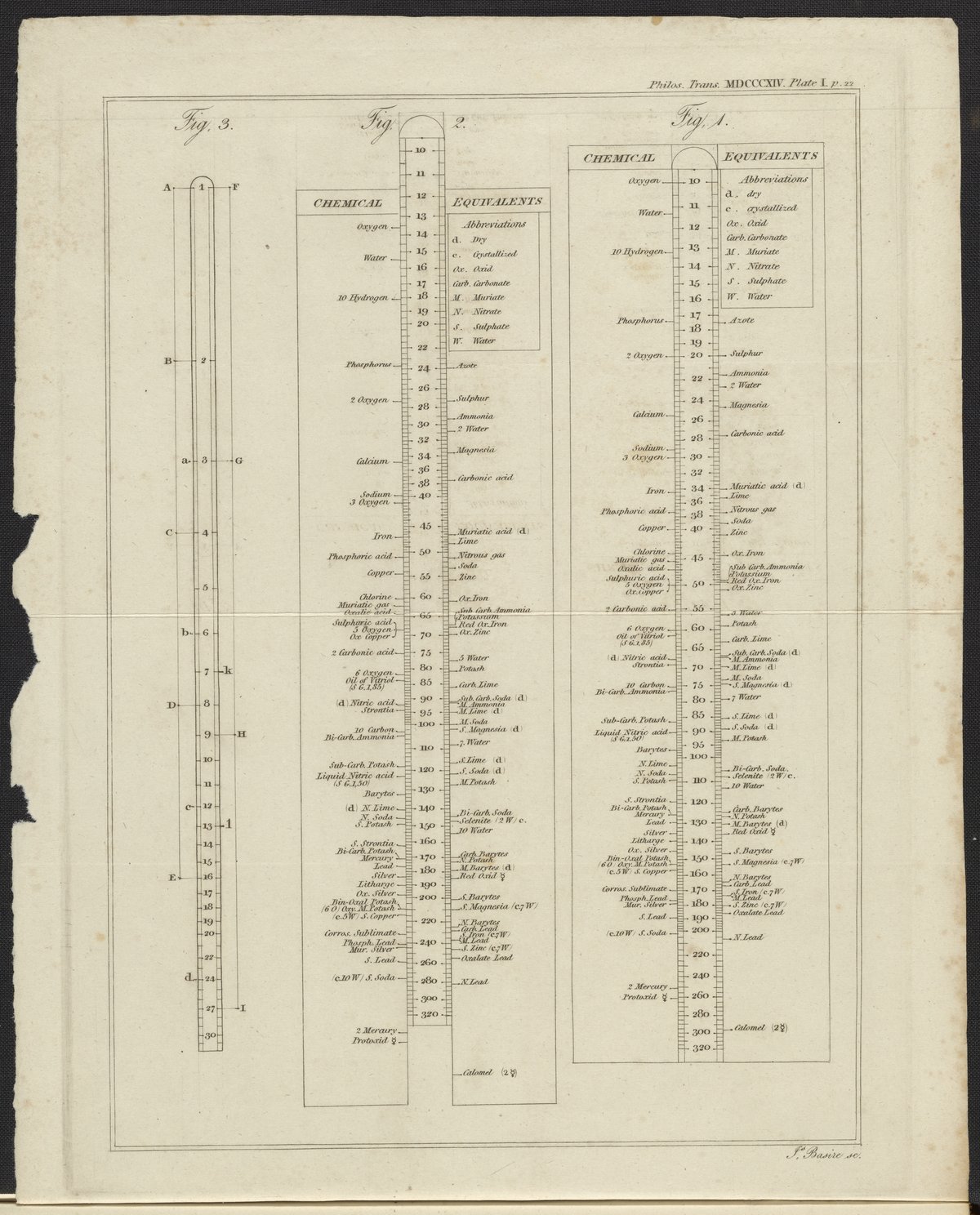 English chemist William Hyde Wollaston invented the Scale of Chemical Equivalents which is explained in this publication along with a foldout plate illustrating Dr. Wollaston's Synoptic Scale of Chemical Equivalents. Used as a pedagogical tool in the teaching of chemistry, this redesigned scale features Hydrogen as the "radix of unity." The scale assists in identifying the proportions of the constituents of a compound of known weight.