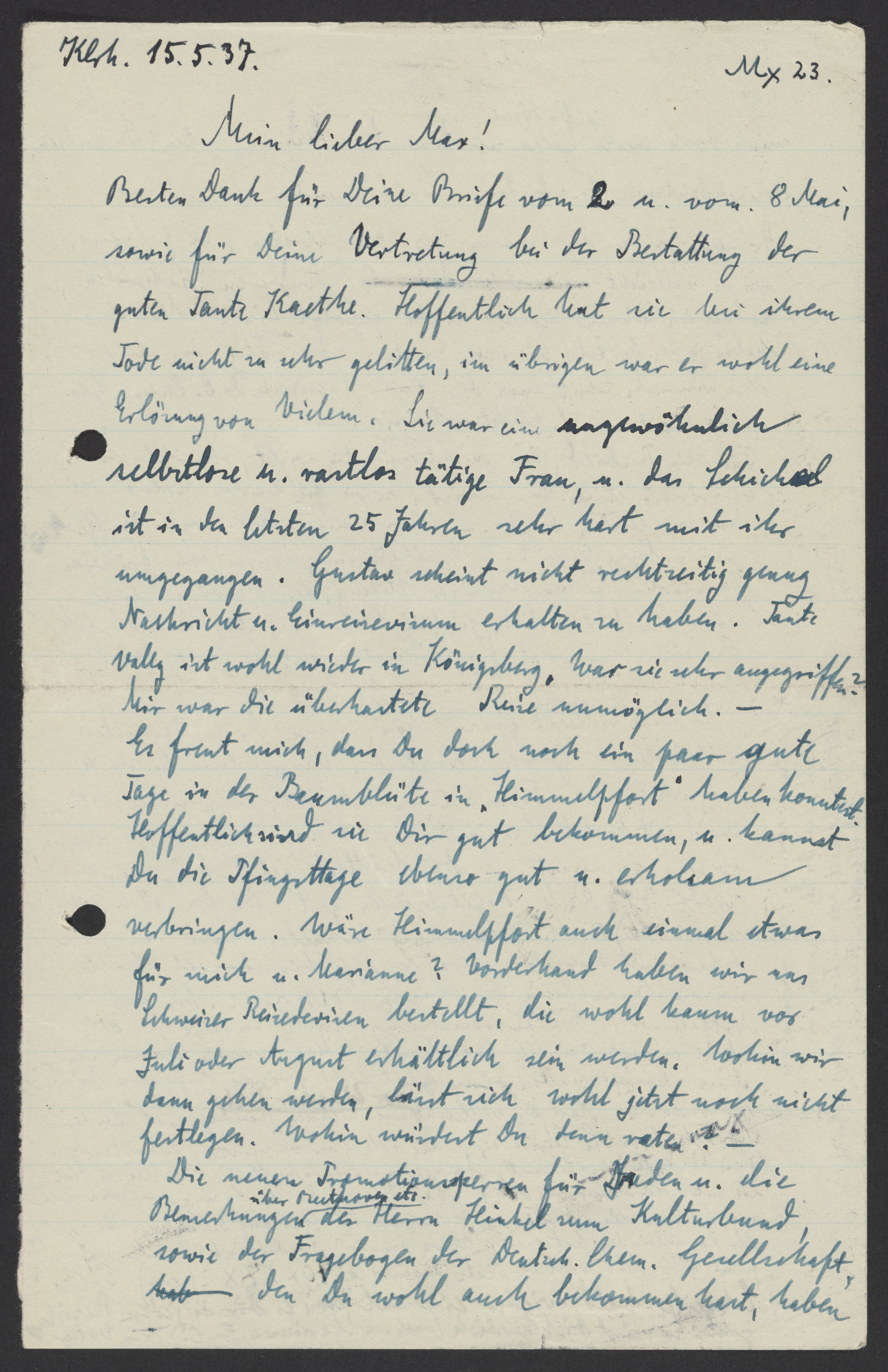 Besten Dank für Deine Briefe vom 2. u. vom 8. Mai, sowie für Deine Vertretung bei der Bestattung der guten Tante Kaethe. Hoffentlich hat sie bei Ihrem Tode nicht zu sehr gelitten, im übrigen war er wohl eine Erlösung von Vielem. Sie war eine ungewöhnliche selsbtlose u. rastlos tätige Frau, u. das Schicksal ist in den letzten 25 Jahren sehr hart mit ihr umgegangen. Gustav scheint nicht rechtzeitig genug Nachricht u. Einreisevisum erhalten zu haben. Tante Vally ist wohl wieder in Königsberg. War sie sehr angegriffen? Mir war die überhartete Reise unmöglich. –