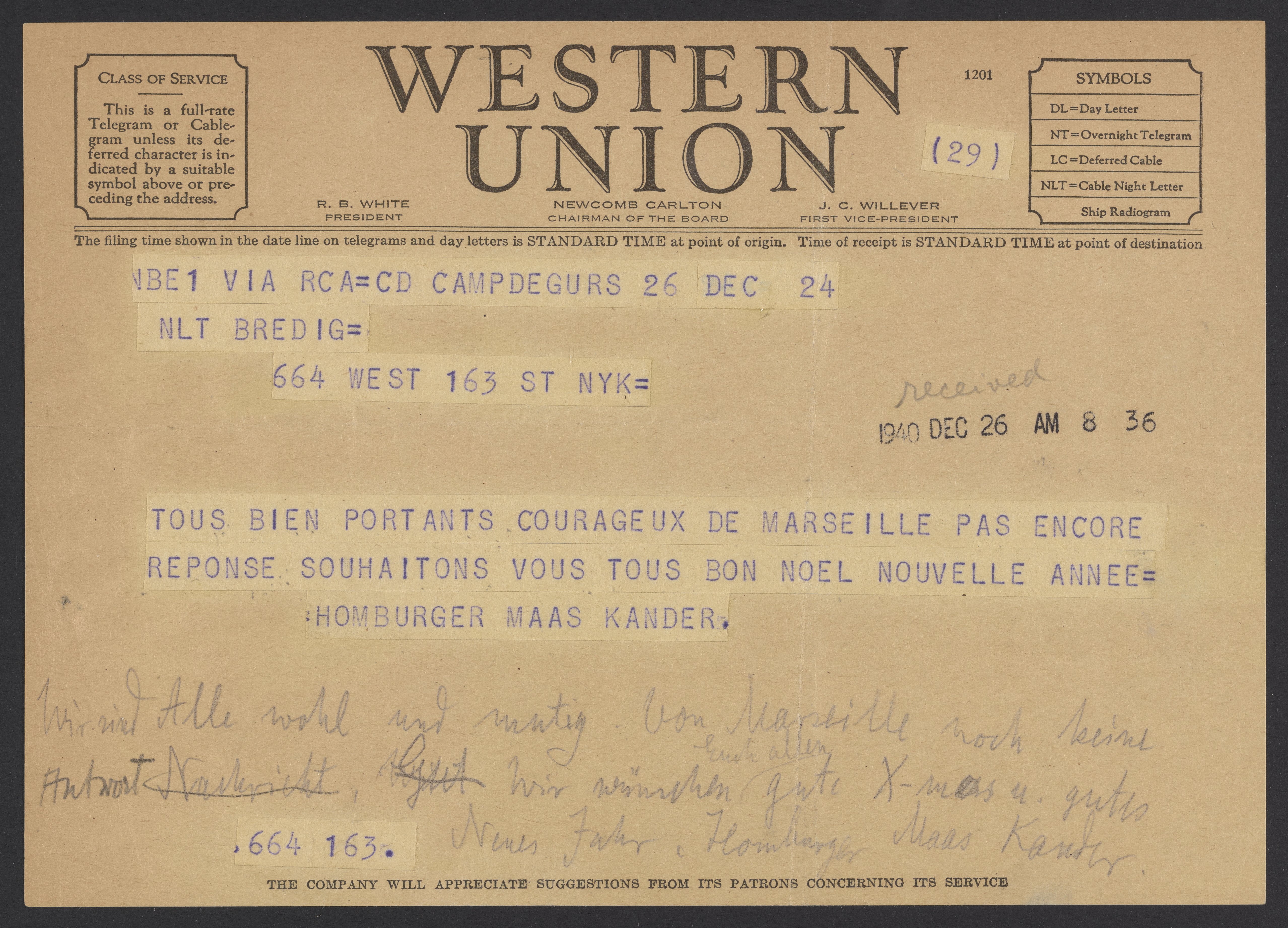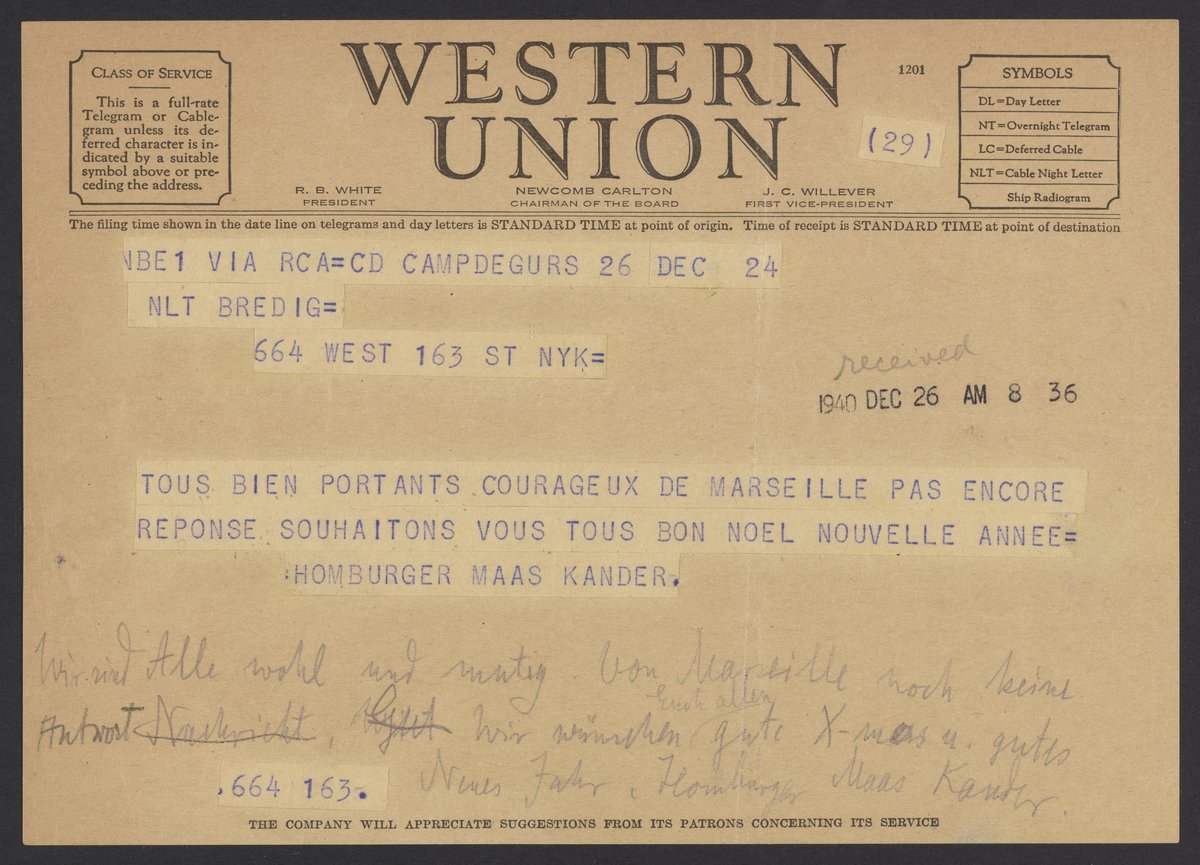 The Homburger Family and their friends send Max Bredig (1902-1977) and Georg Bredig (1888-1968) a telegram in the French language from the Gurs concentration camp to wish them well for the winter holidays. They additionally mention that they have not received an answer from the American consulate in Marseille regarding their visa applications. Georg Bredig includes a German translation of their message.