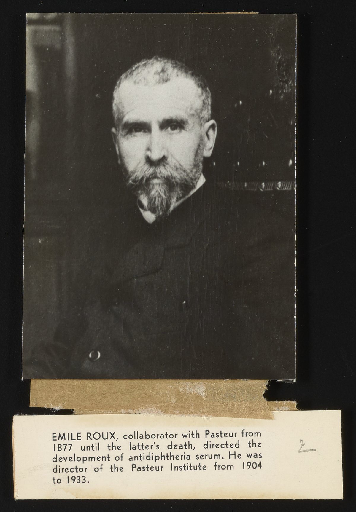 “Portrait of Monsieur (Emile) Roux,” circa 1900. Fisher-Pasteur Memorial Collection, Box 1, Folder 21. Science History Institute. Philadelphia. https://digital.sciencehistory.org/works/zc77sq21g.