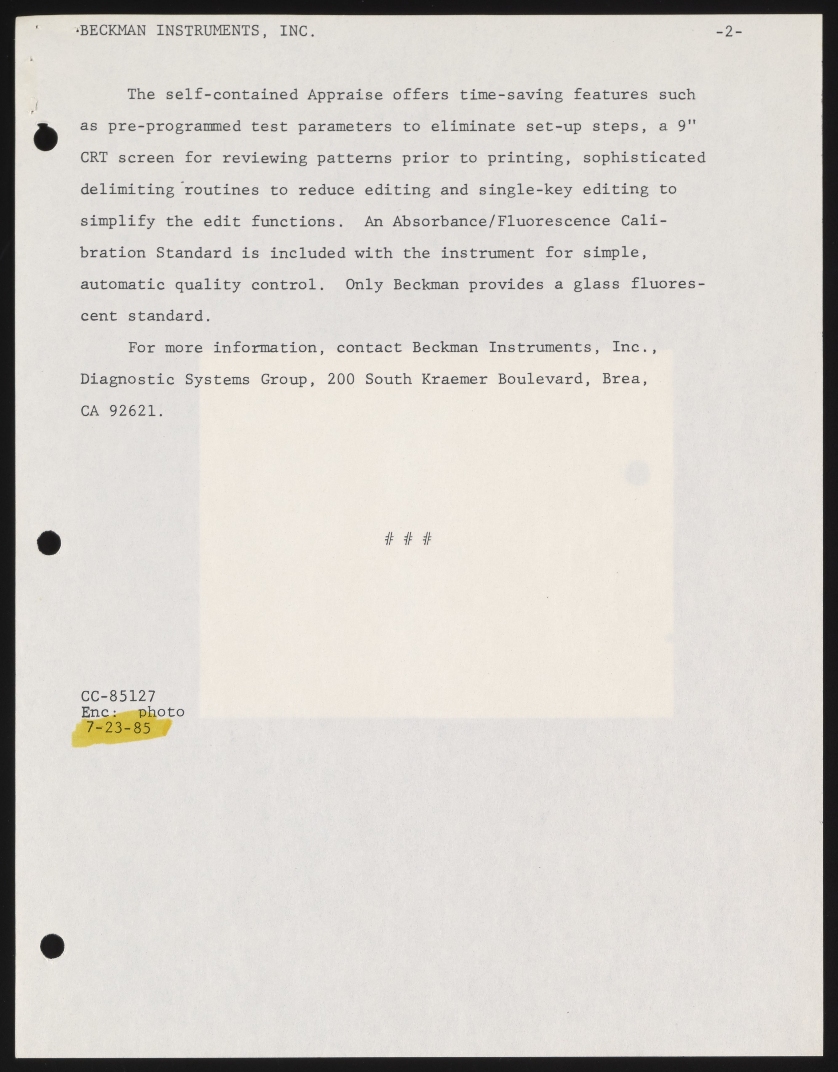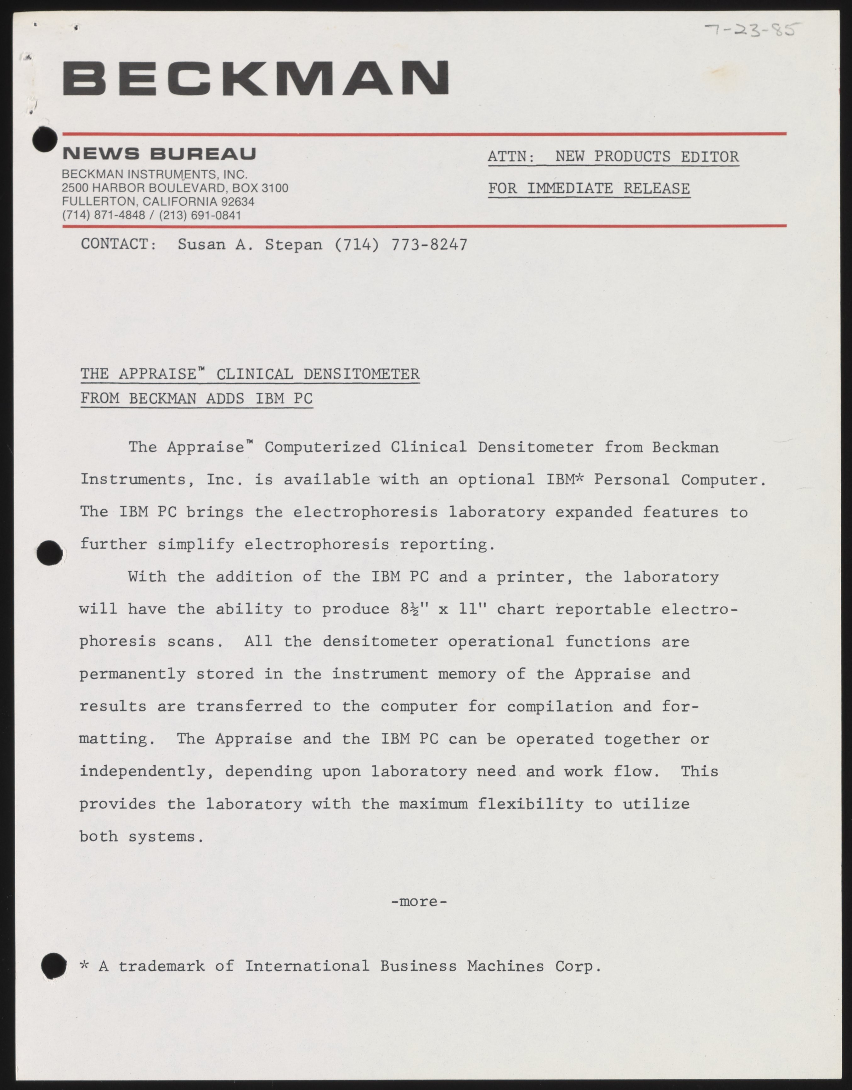 Stepan, Susan A. “The Appraise Clinical Densitometer from Beckman Adds IBM PC,” July 23, 1985. Beckman Historical Collection, Box 58, Folder 70. Science History Institute. Philadelphia. https://digital.sciencehistory.org/works/zc77sq648.