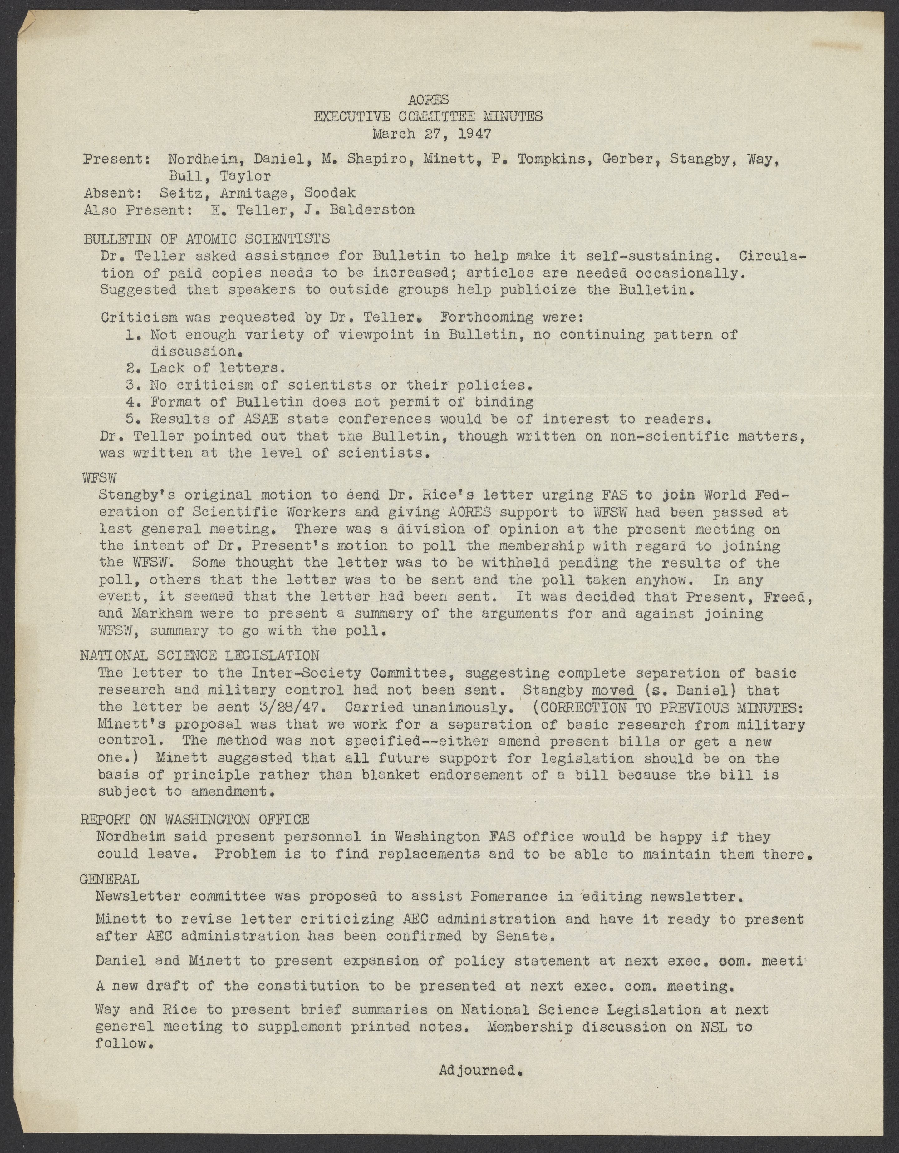 Association of Oak Ridge Engineers and Scientists (AORES) meeting minutes, March 27, 1947
