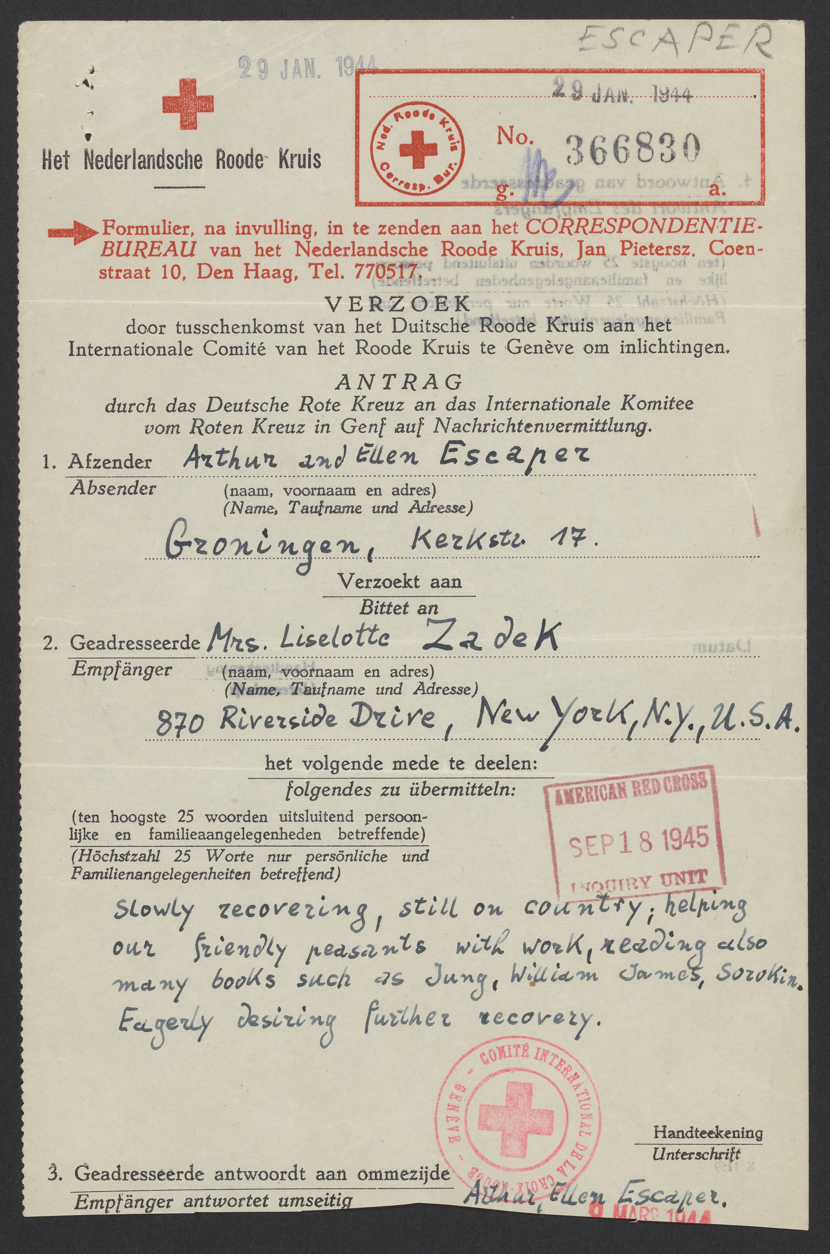 Schnell, Alfred, and Eva Schnell. “Message from Arthur and Ellen Escaper (Alfred and Eva Schnell) to Mrs. Liselotte Zadek, January 29, 1944,” 1944–1945. Papers of Georg and Max Bredig, Box 9, Folder 8. Science History Institute. Philadelphia. https://digital.sciencehistory.org/works/zf8yj1k.