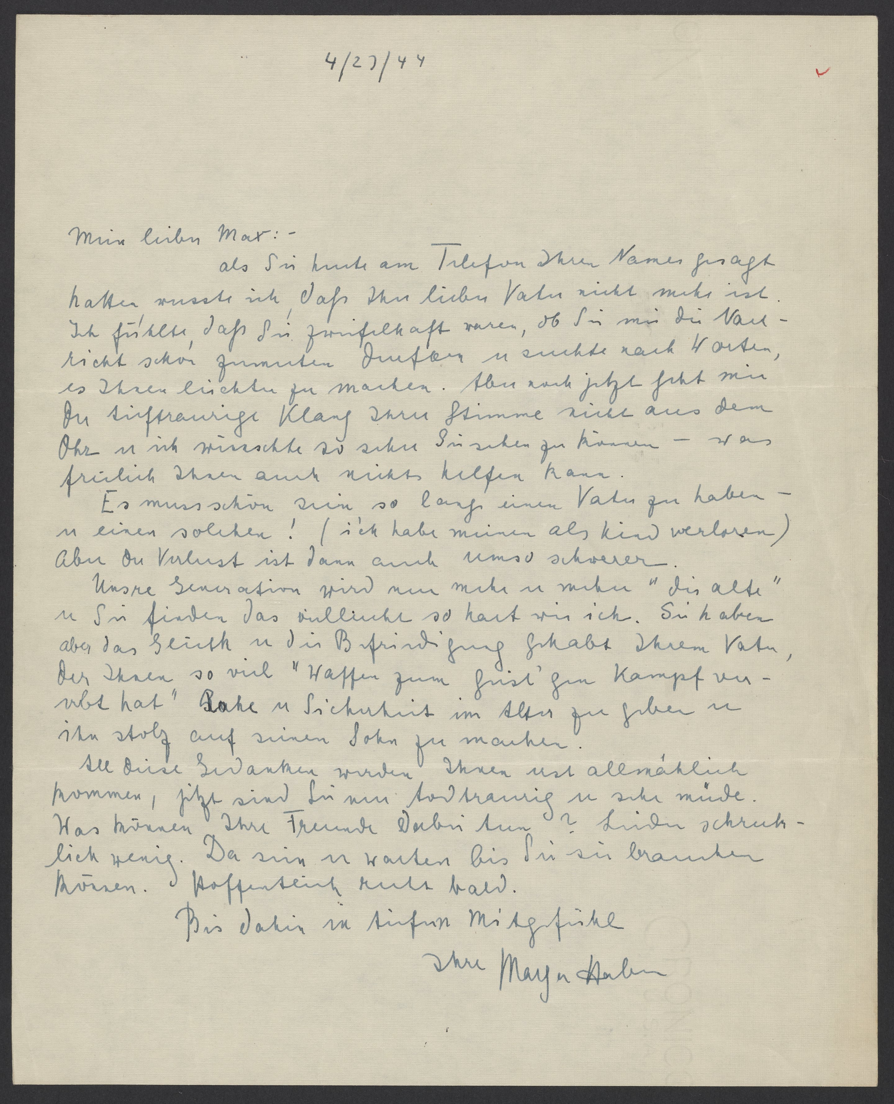 Letter of condolence from Maya Haber to Max Bredig, April 27, 1944