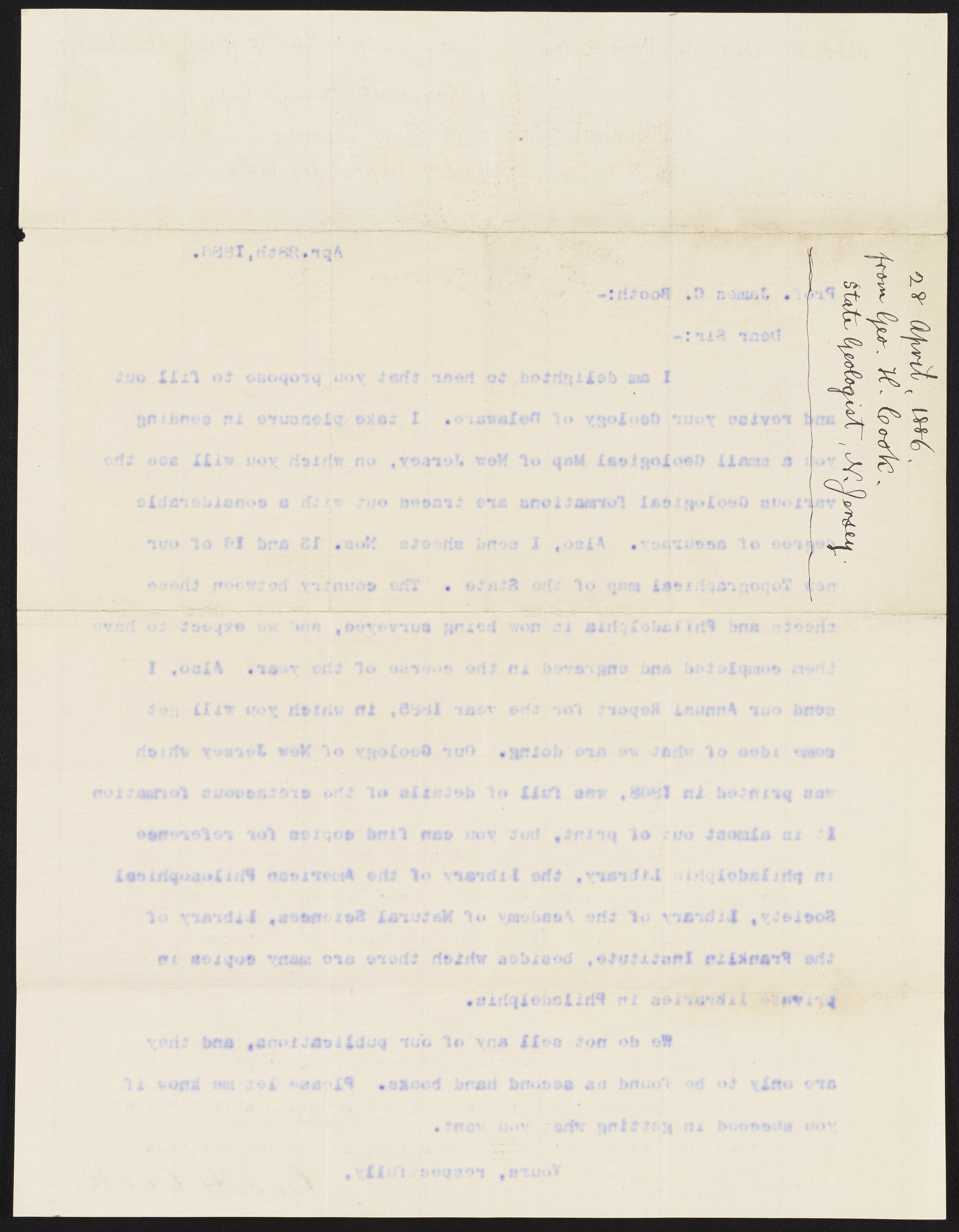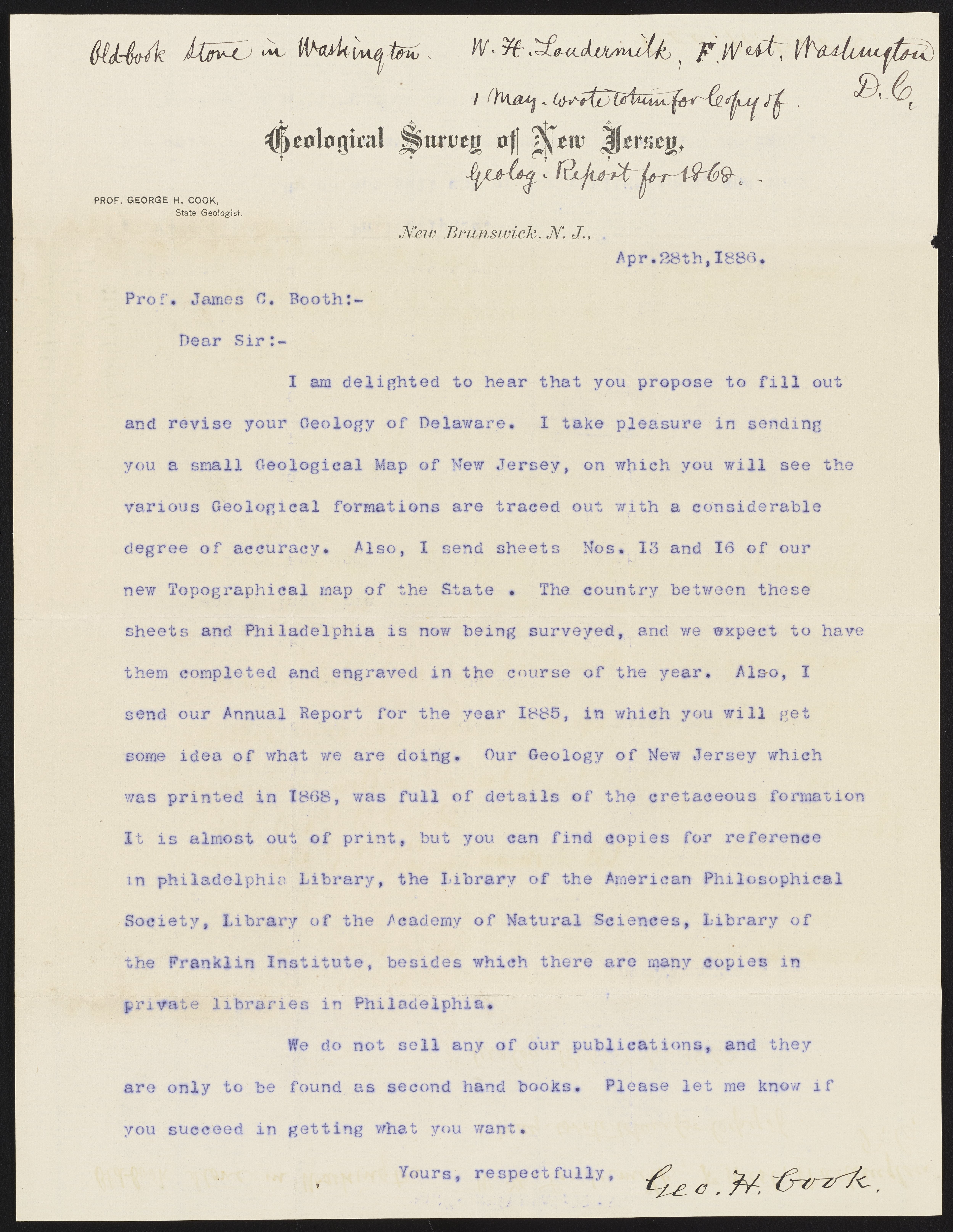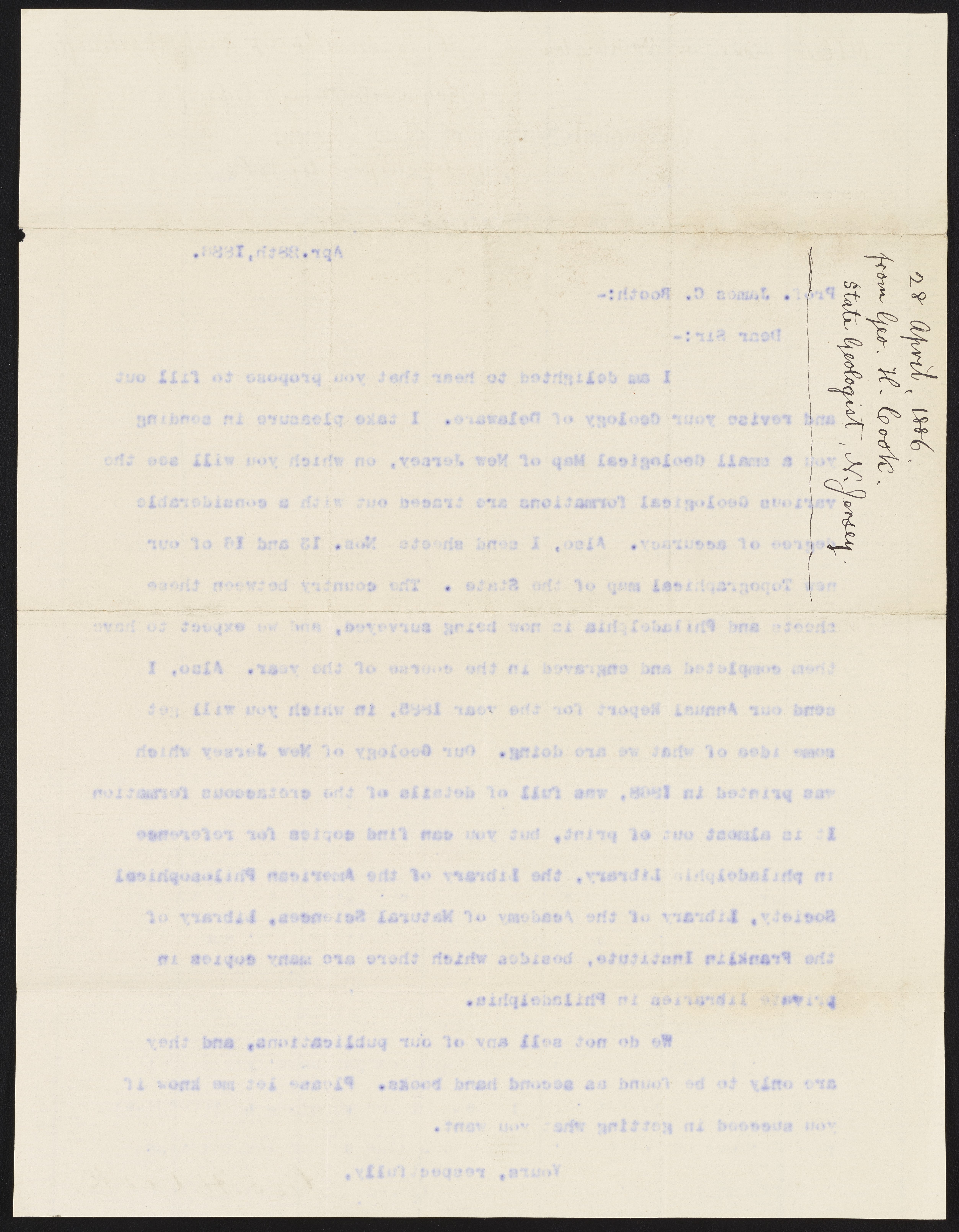 Small JPG1200 x 1551px — 231 KBLarge JPG2880 x 3723px — 1.2 MBFull-sized JPG4996 x 6458px — 3.6 MBOriginal fileTIFF — 4996 x 6458px — 92.4 MBGeorge Hammell Cook (1818-1889) of the Geological Survey of New Jersey, responds to James Curtis Booth's (1810-1888) request to acquire a copy of Cook's Geology of New Jersey (1868).