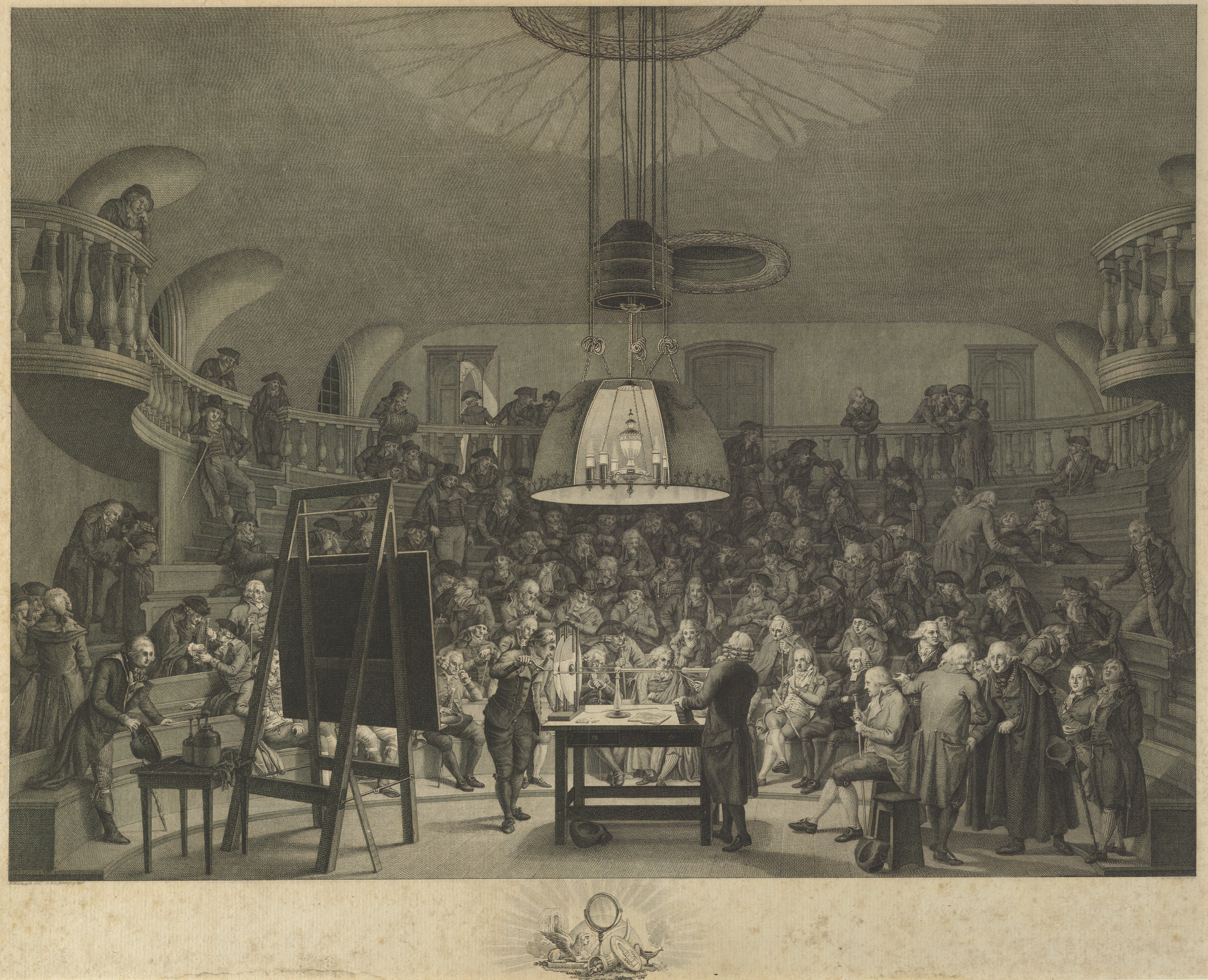 This engraving shows Dutch mathematician and physicist Jean Henri van Swinden (1746–1823) demonstrating the generation of electricity to the Felix Meritis Society in Amsterdam. The Felix Meritis Society was founded in the late 18th century to promote the arts and sciences (Felix Meritis translates as "Happiness through Merit").
