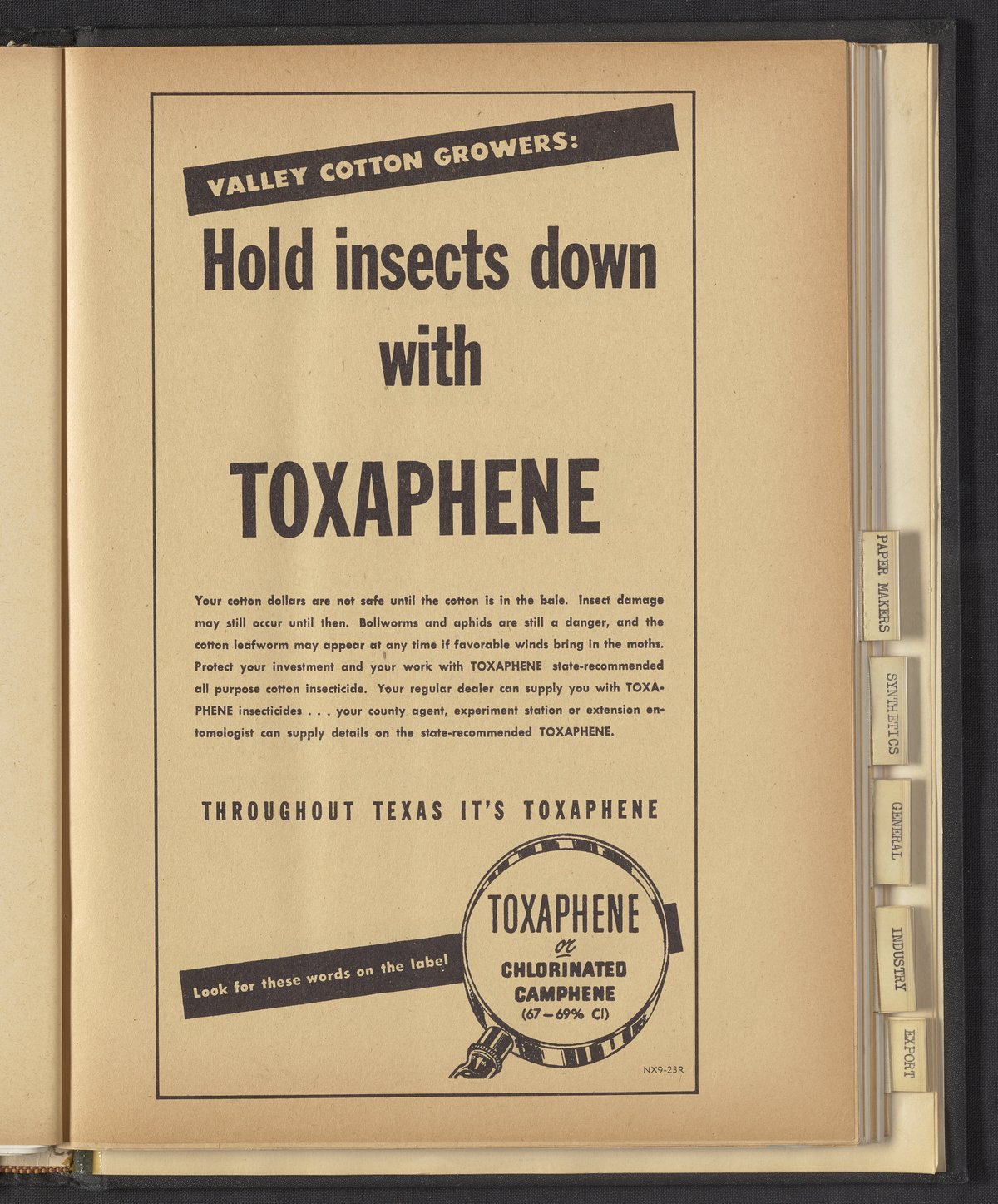 Hercules Incorporated. “Valley Cotton Growers: Hold Insects Down with Toxaphene.” 1949 Hercules Advertisements, 1949. Records of Hercules Incorporated, Volume 1949. Science History Institute. Philadelphia. https://digital.sciencehistory.org/works/zg64tm69w.