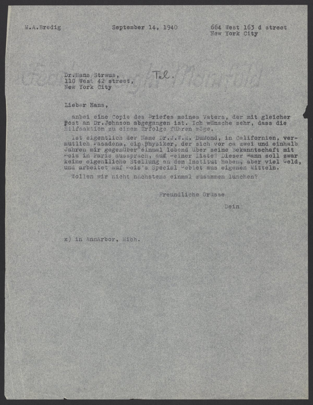 Letter from Max Bredig to Hans Straus, September 14, 1940