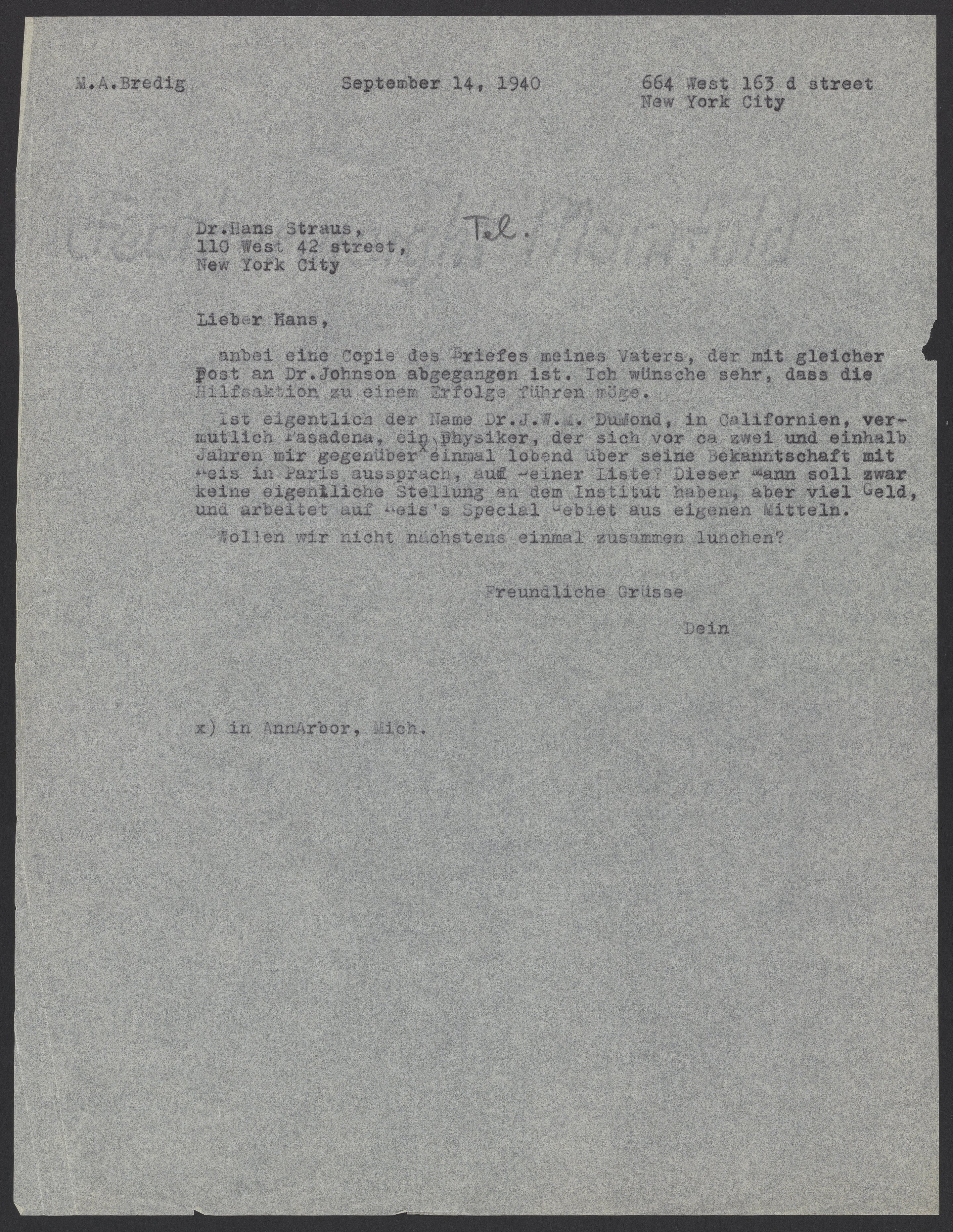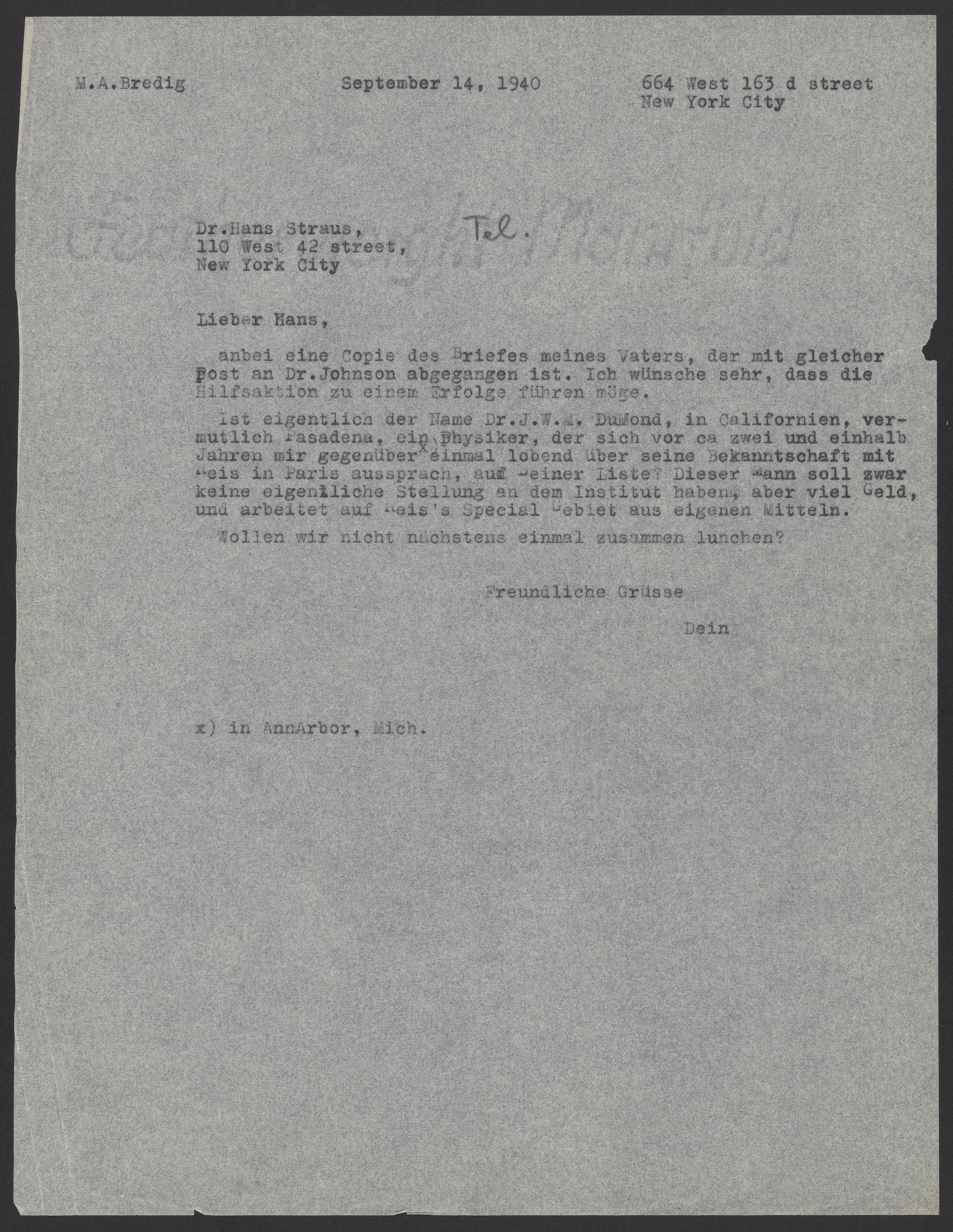 Letter from Max Bredig to Hans Straus, September 14, 1940