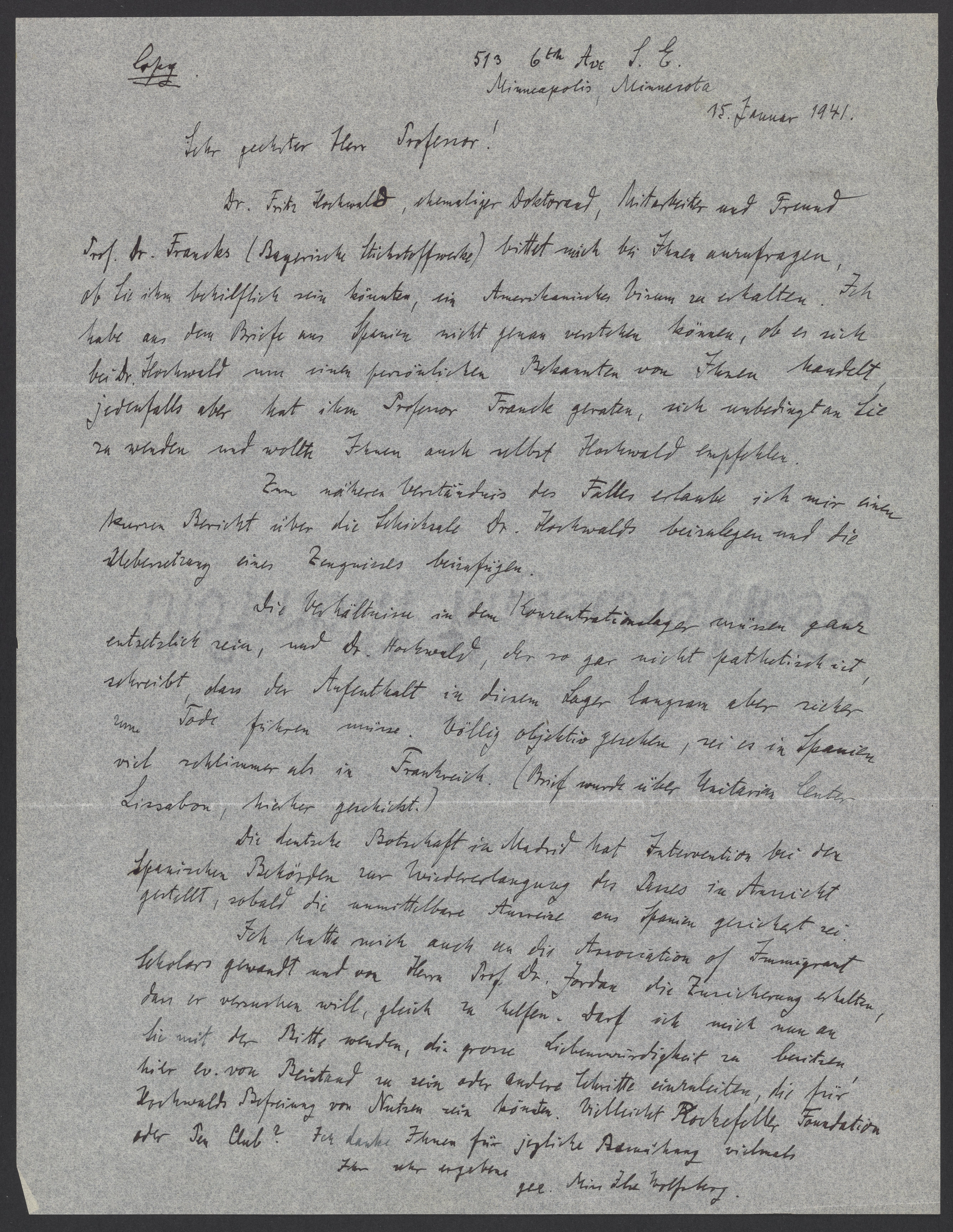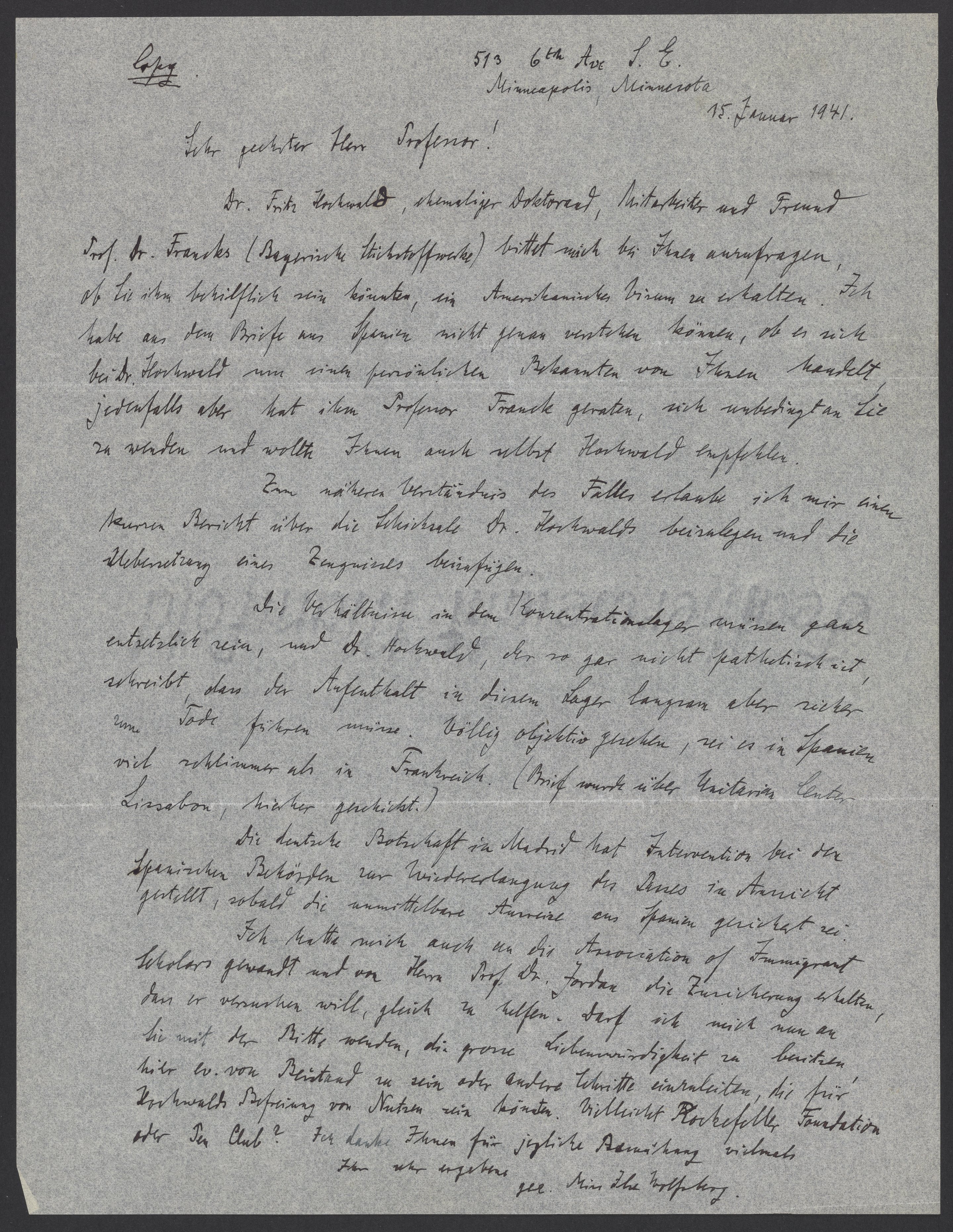 Dr. Fritz Hochwalds, ehemaliger Doktorand, Mitarbeiter und Freund Prof. Dr. Francks (Bayerischer Stickstoffwerke) bittet mir bei Ihnen anzufragen, ob Sie ihm behilflich sein könnten, ein Amerikanisches Visum zu erhalten. Ich habe aus dem Briefe aus Spanien nicht genau verstehen können, ob es sich bei Dr. Hochwald um einen persönlichen Bekannten von Ihnen handelt, jedenfalls aber hat ihm Professor Franck geraten, sich unbedingt an Sie zu wenden und wollte Ihnen auch selbst Hochwald empfehlen.