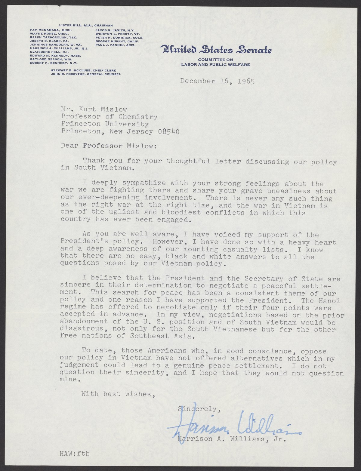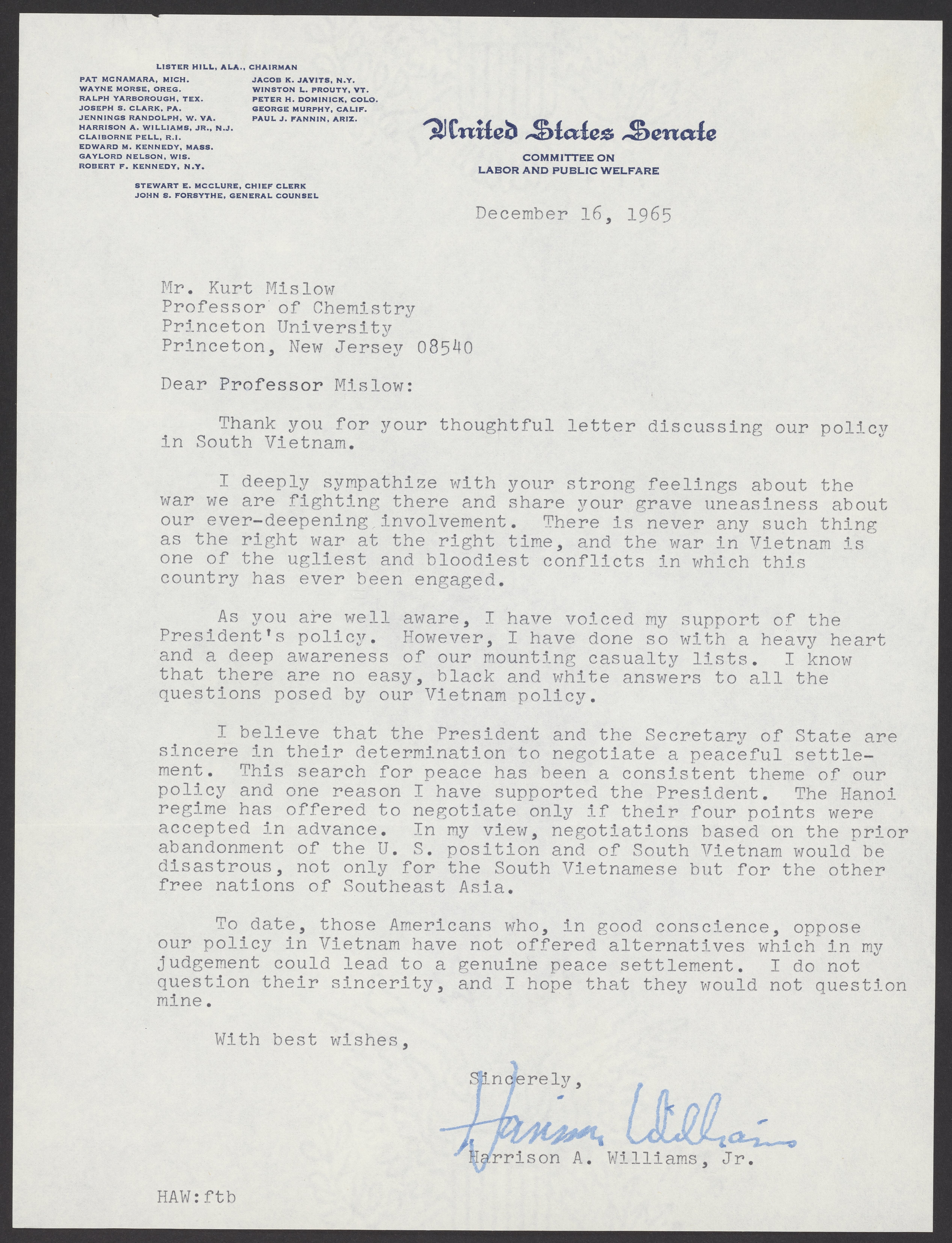 Letter from Senator Harrison A. Williams, Jr. (1919-2001) to Kurt M. Mislow (1923-2017). Williams responds to a previous letter Mislow had written about his thoughts on the Vietnam War.