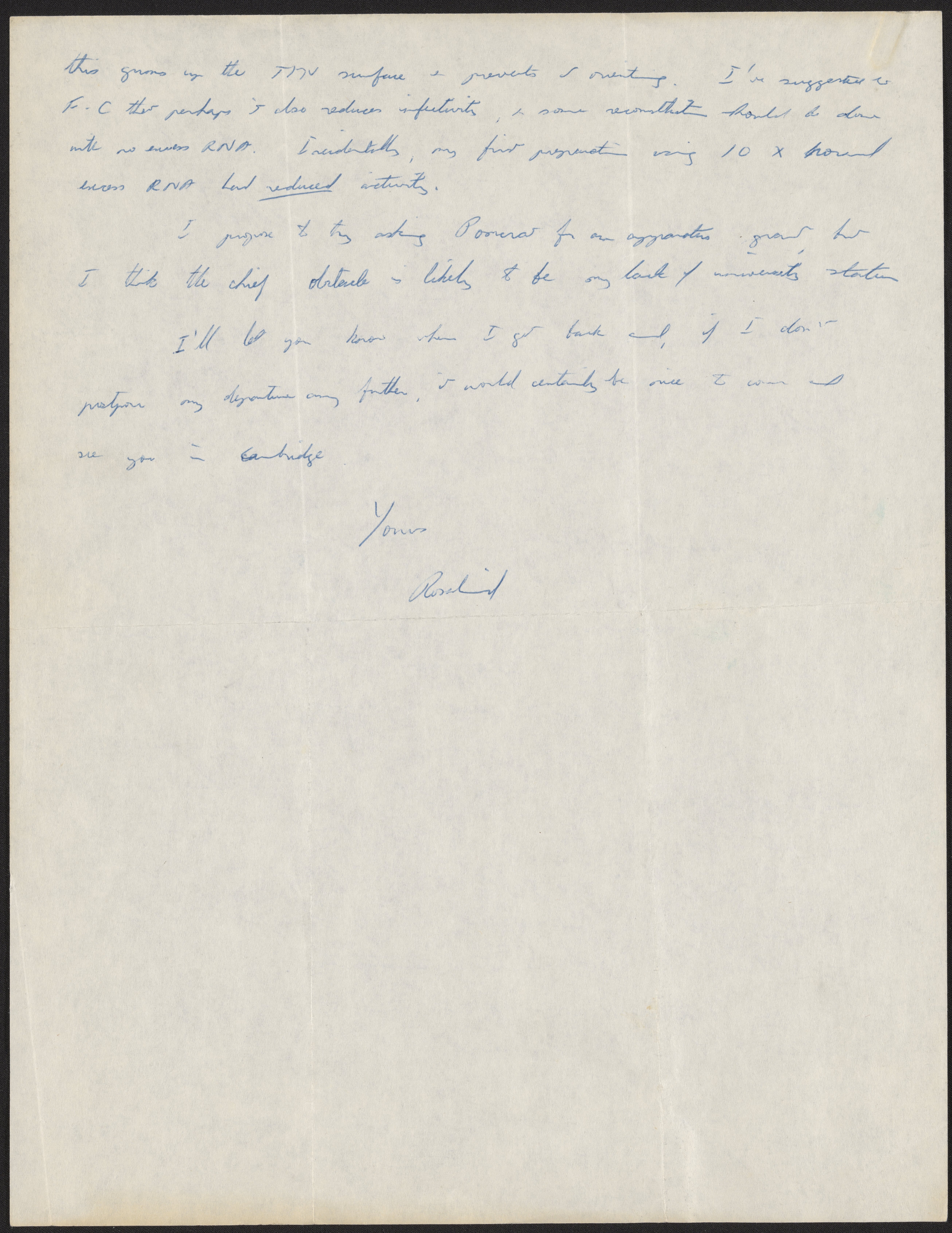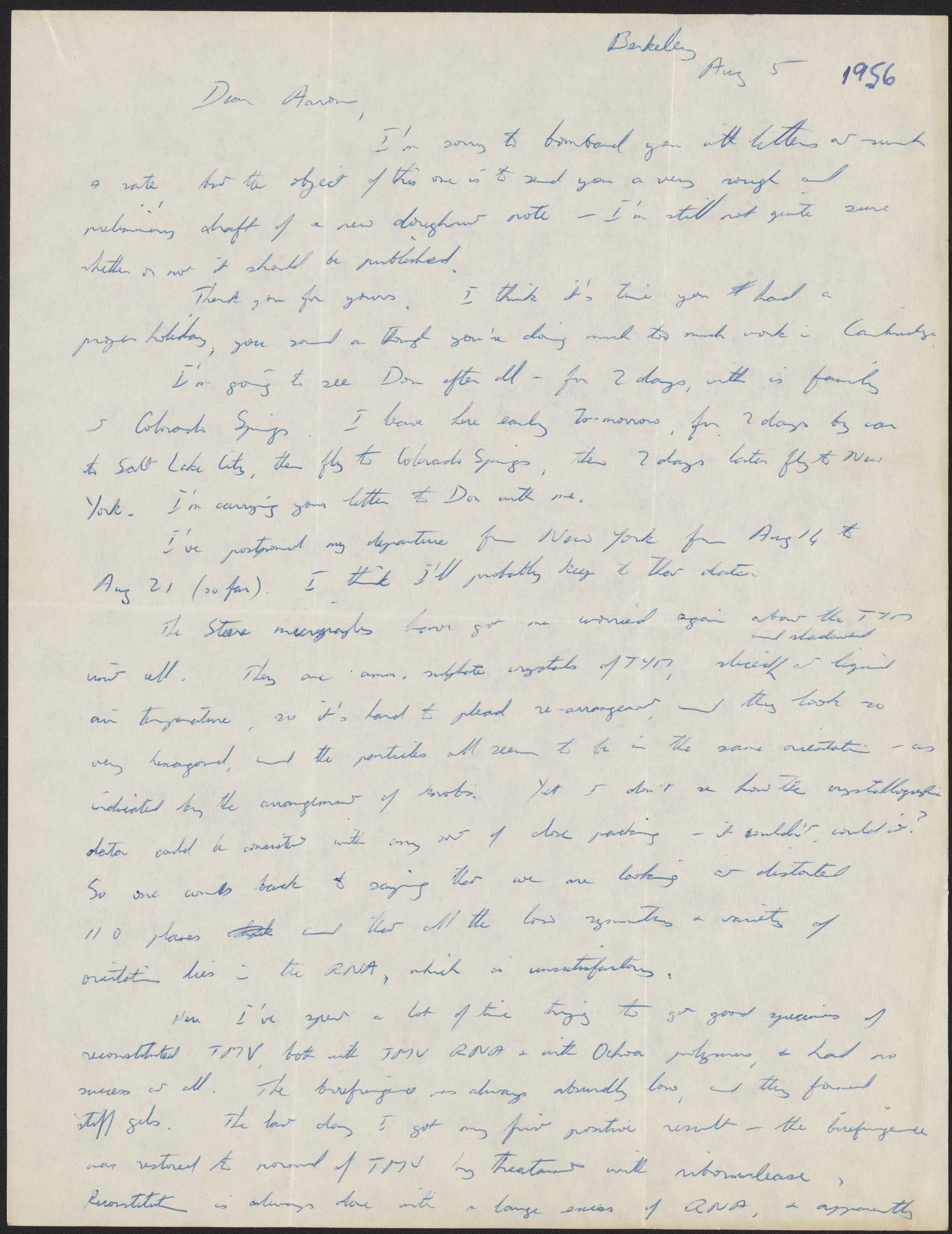 Letter from Rosalind Franklin to Aaron Klug, August 5, 1956