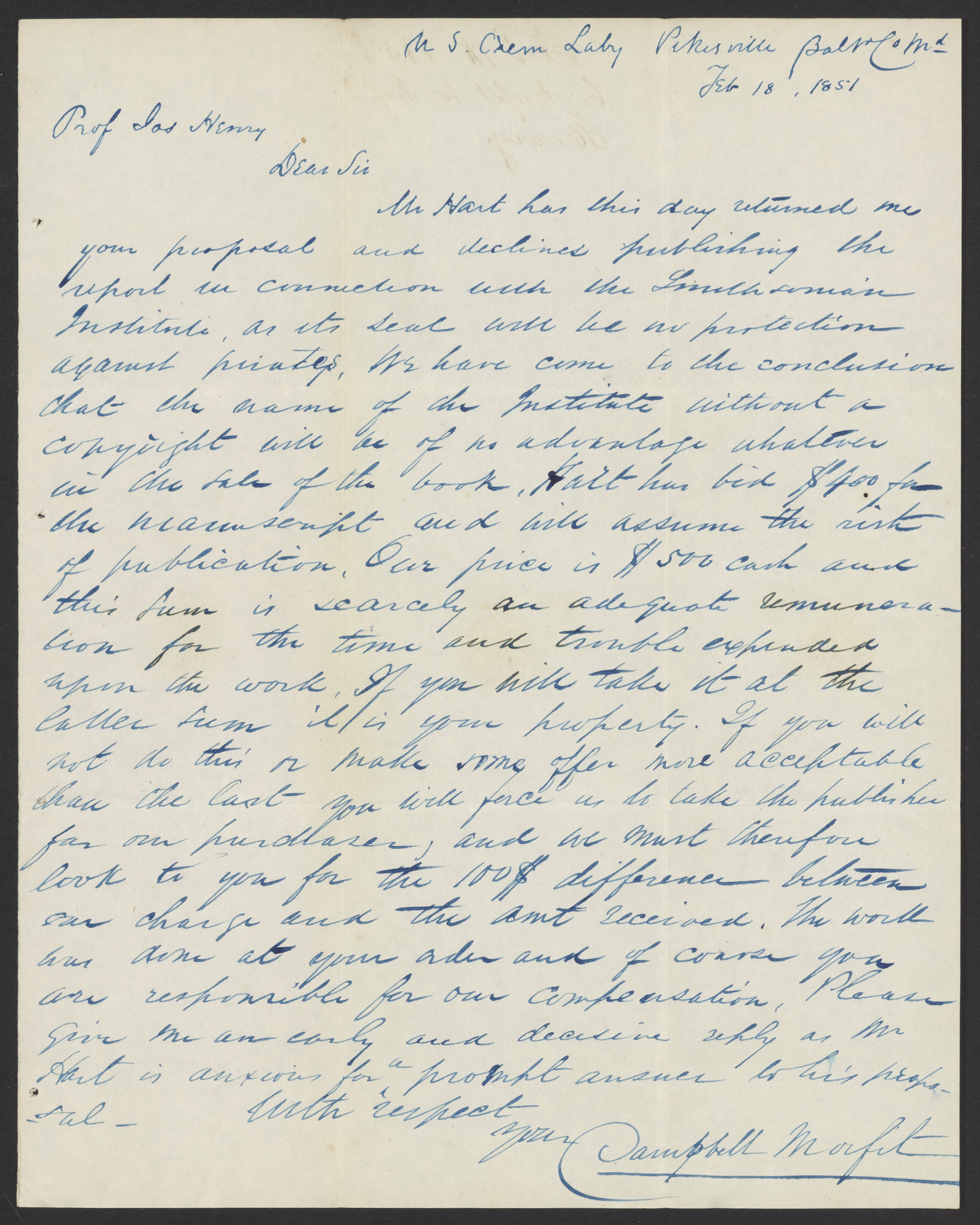 Small JPG1200 x 1499px — 295 KBLarge JPG2880 x 3598px — 1.2 MBFull-sized JPG3285 x 4104px — 1.5 MBOriginal fileTIFF — 3285 x 4104px — 38.6 MBCampbell Morfit (1820-1897), a distinguished chemist and co-editor with James Curtis Booth (1810-1888) of the Encyclopedia of Chemistry (1850), writes to Joseph Henry (1797-1878), Secretary of the Smithsonian Institute, informing him that the Smithsonian Institute has declined to publish a report; in any exchange of letters, Henry upbraids Morfit for contacting him in Booth's stead.