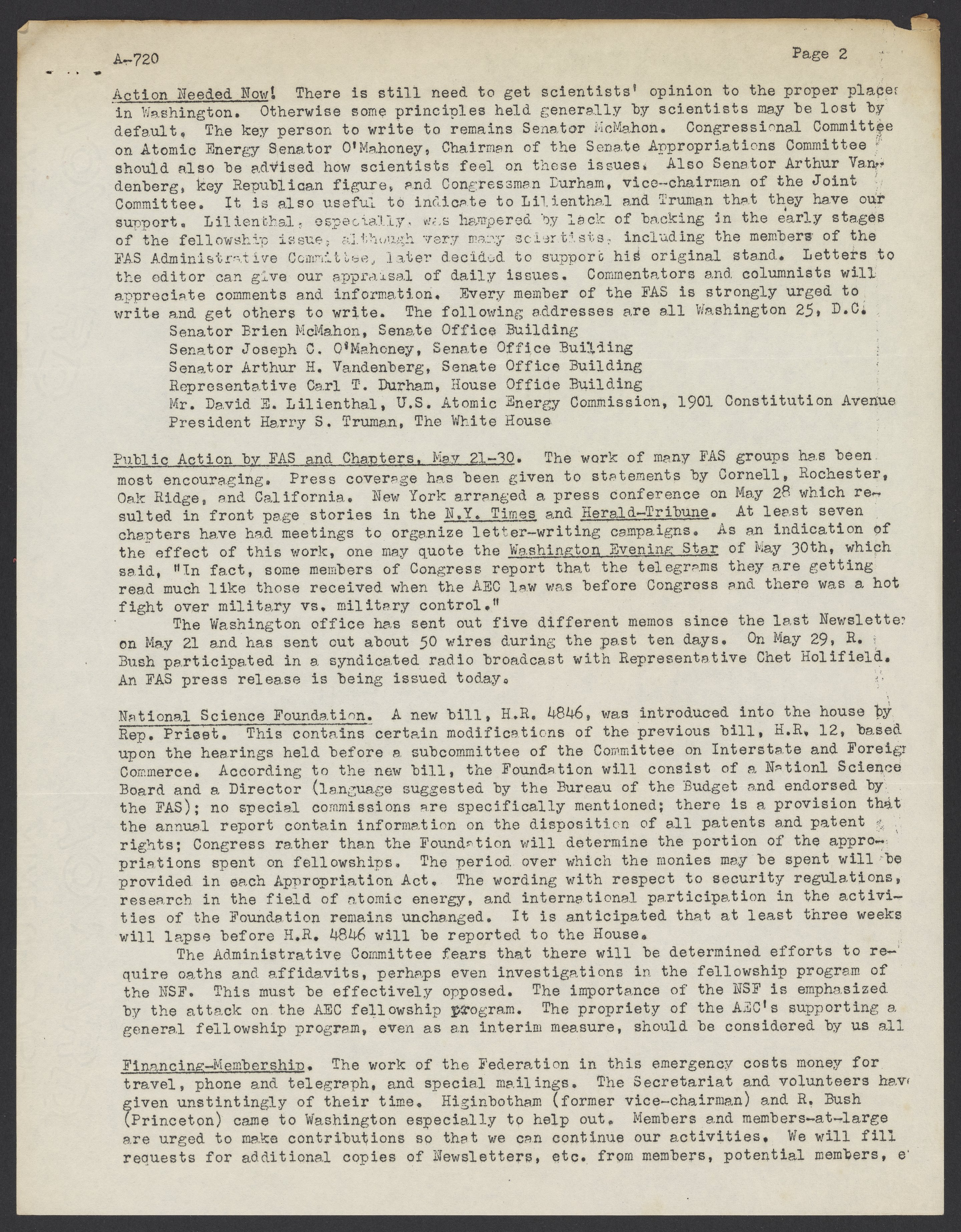 Letter from the Federation of American Scientists, May 30, 1949