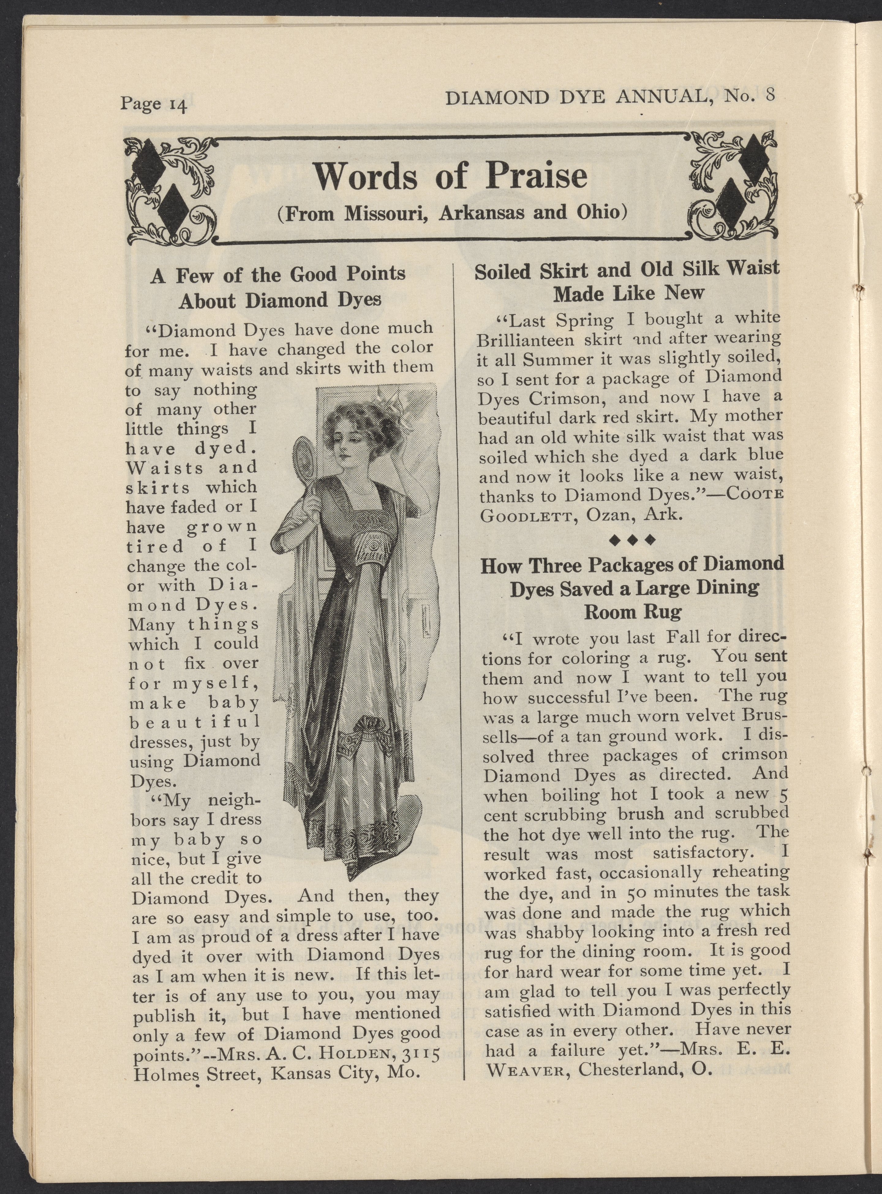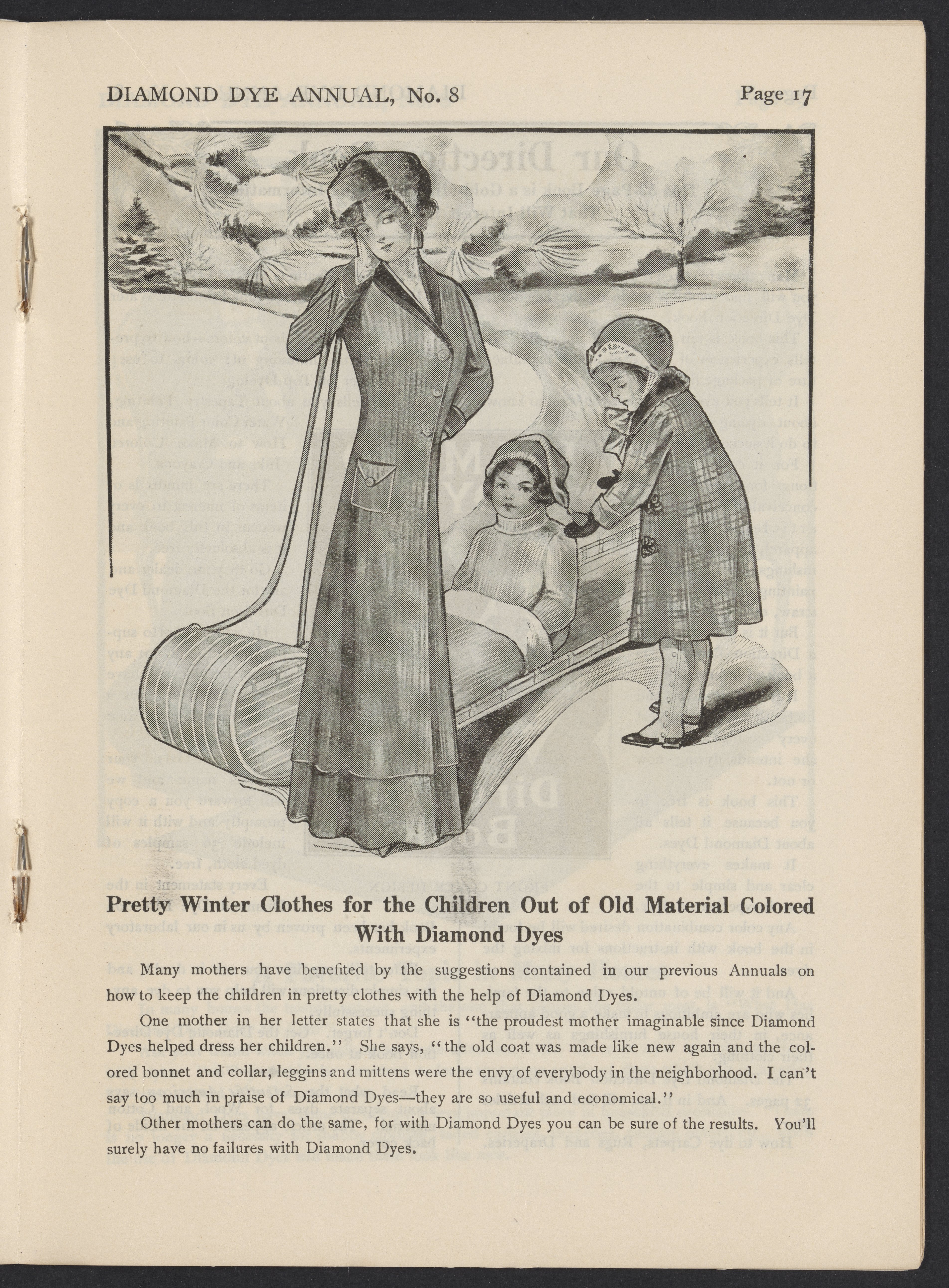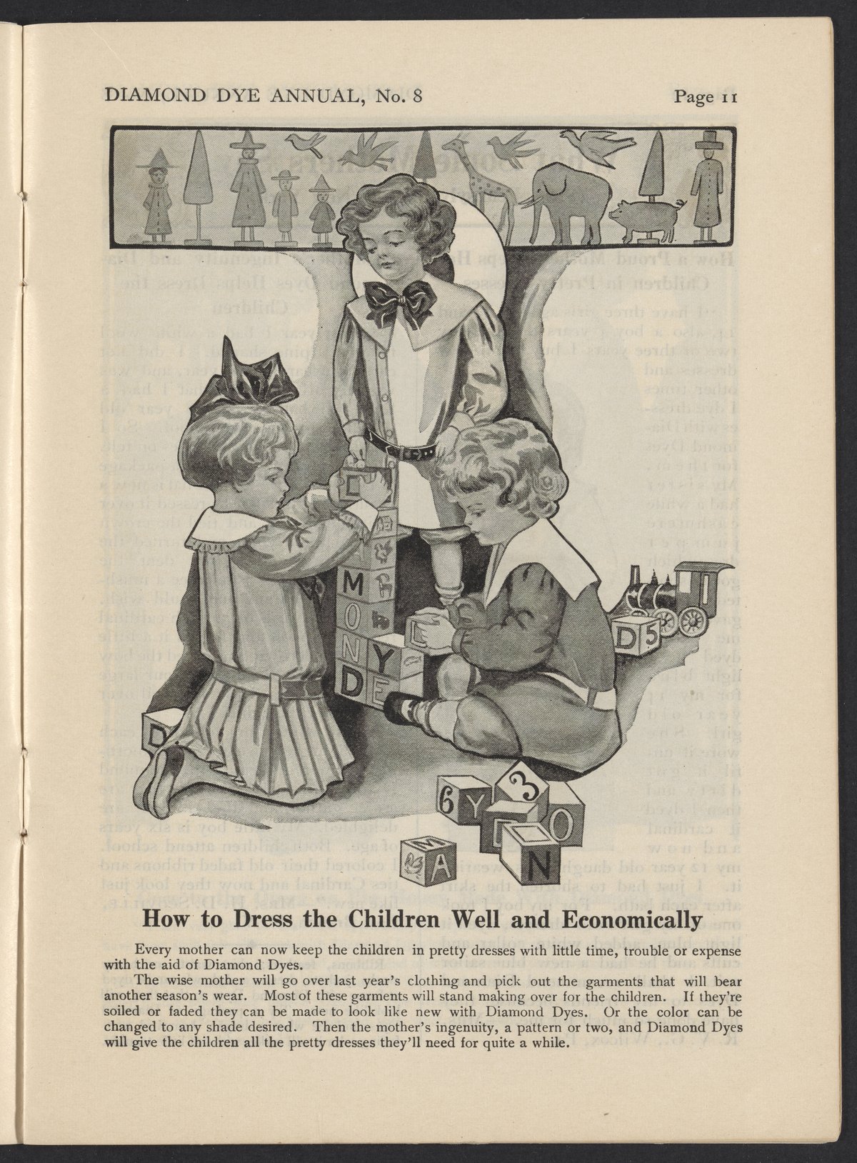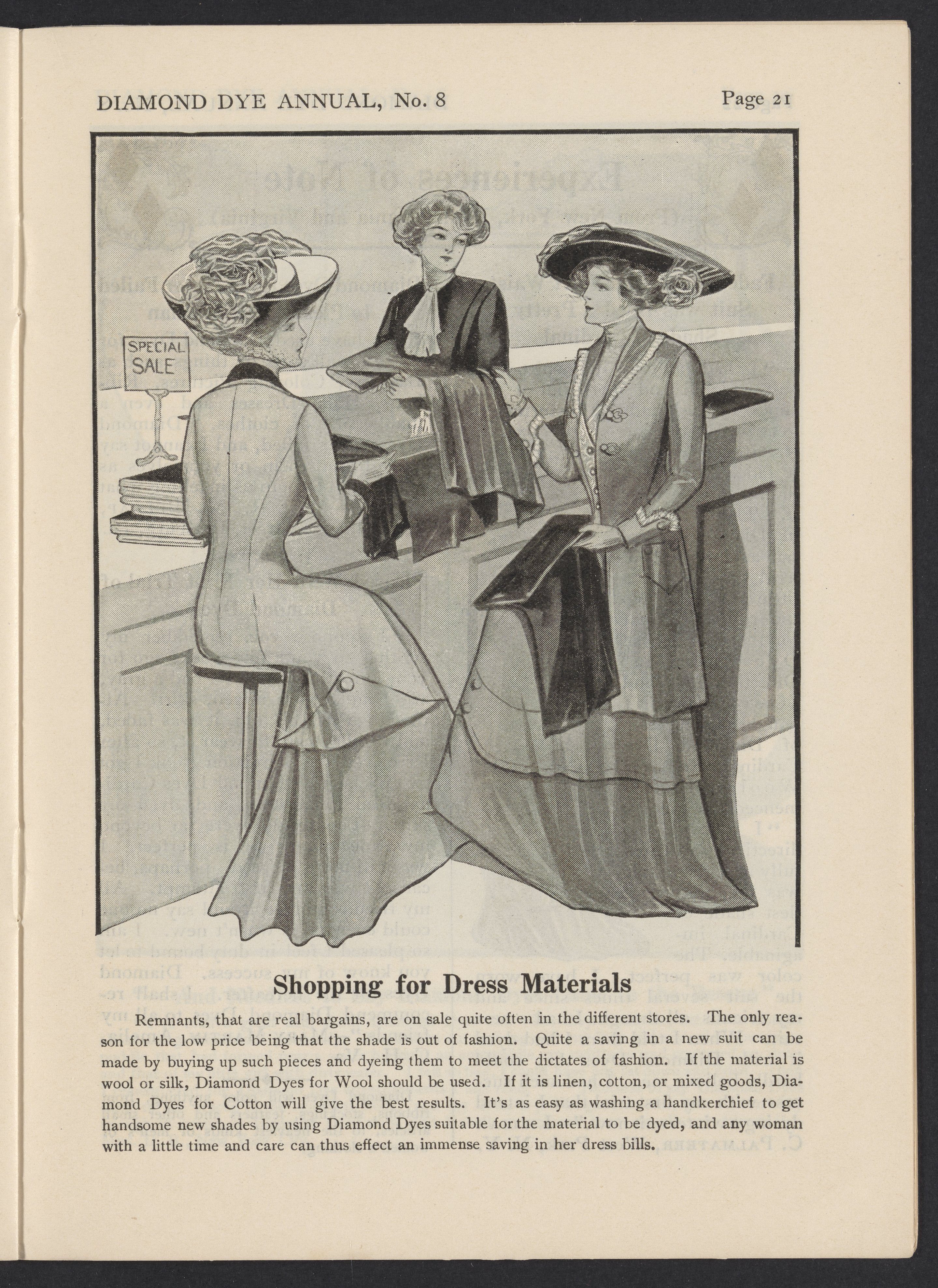 Small JPG1200 x 1619px — 513 KBLarge JPG2880 x 3885px — 2.9 MBFull-sized JPG3846 x 5188px — 4.8 MBOriginal fileTIFF — 3846 x 5188px — 57.1 MB1910-1911 issue of the Diamond Dye Annual, which includes tips and tricks using Diamond Dyes, letters from users, and illustrations.