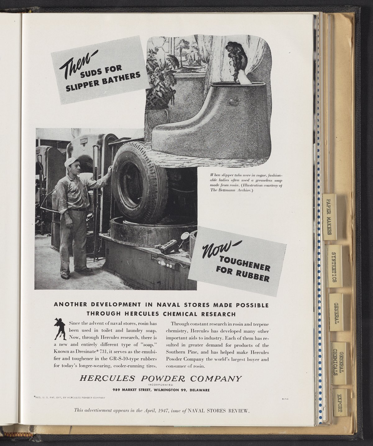 Hercules Incorporated. “Then, Suds for Slipper Bathers...Now, Toughener for Rubber.” 1947 Hercules Advertisements, 1947. Records of Hercules Incorporated, Volume 1947. Science History Institute. Philadelphia. https://digital.sciencehistory.org/works/zk51vh51p.