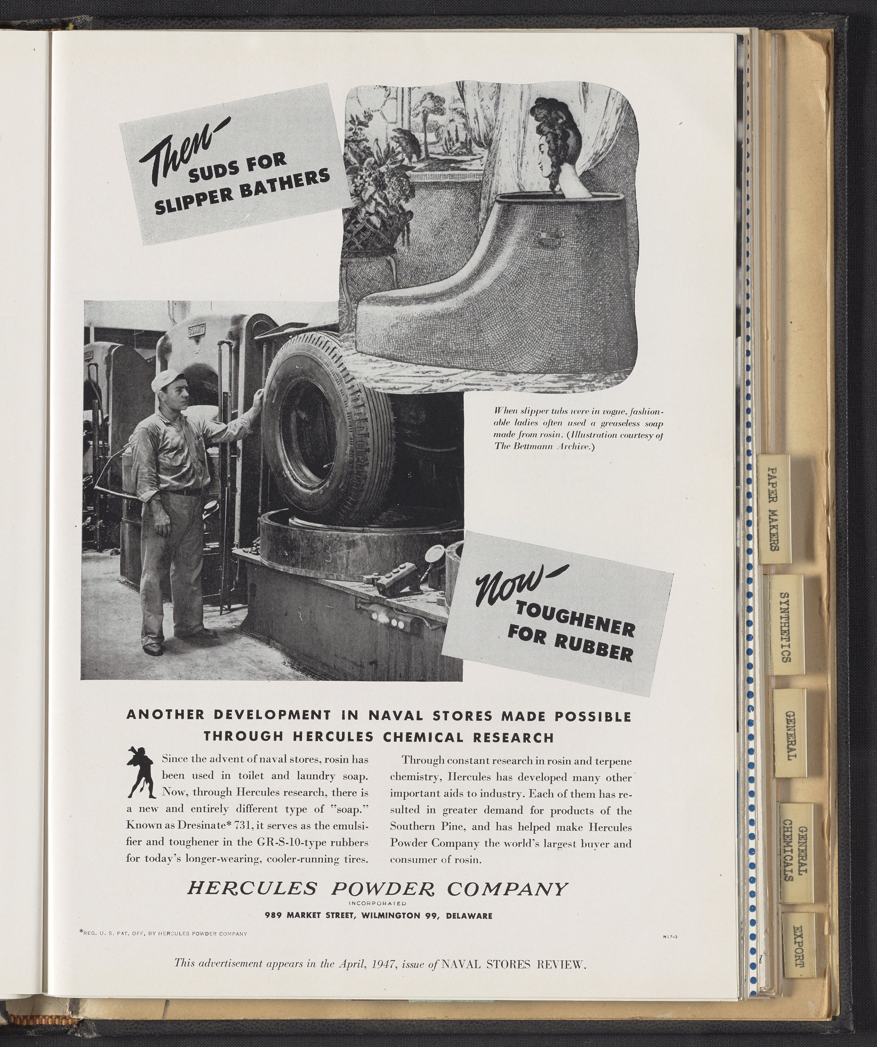 Hercules Incorporated. “Then, Suds for Slipper Bathers...Now, Toughener for Rubber.” 1947 Hercules Advertisements, 1947. Records of Hercules Incorporated, Volume 1947. Science History Institute. Philadelphia. https://digital.sciencehistory.org/works/zk51vh51p.