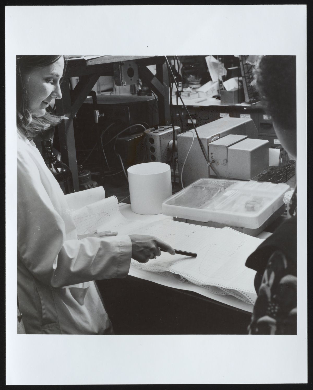 General view of two unidentified chemists discussing the spectrum of a compound analyzed using a Perkin-Elmer fluorescence spectrophotometer in the laboratory of the Biomolecular Sciences Section of the Arthur D. Little Company. Per notations accompanying the photograph, the analysis is used to determine therapeutic indexes of anti-cancer drugs as part of a research program conducted on behalf of the National Cancer Institute.
