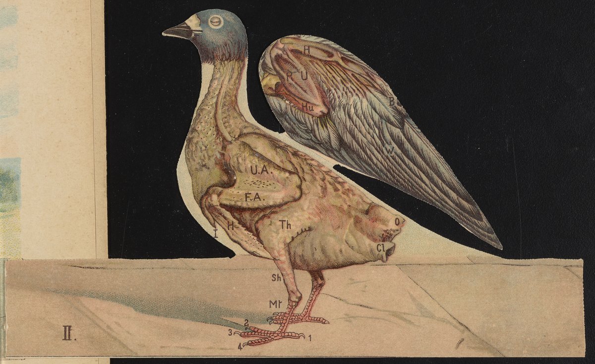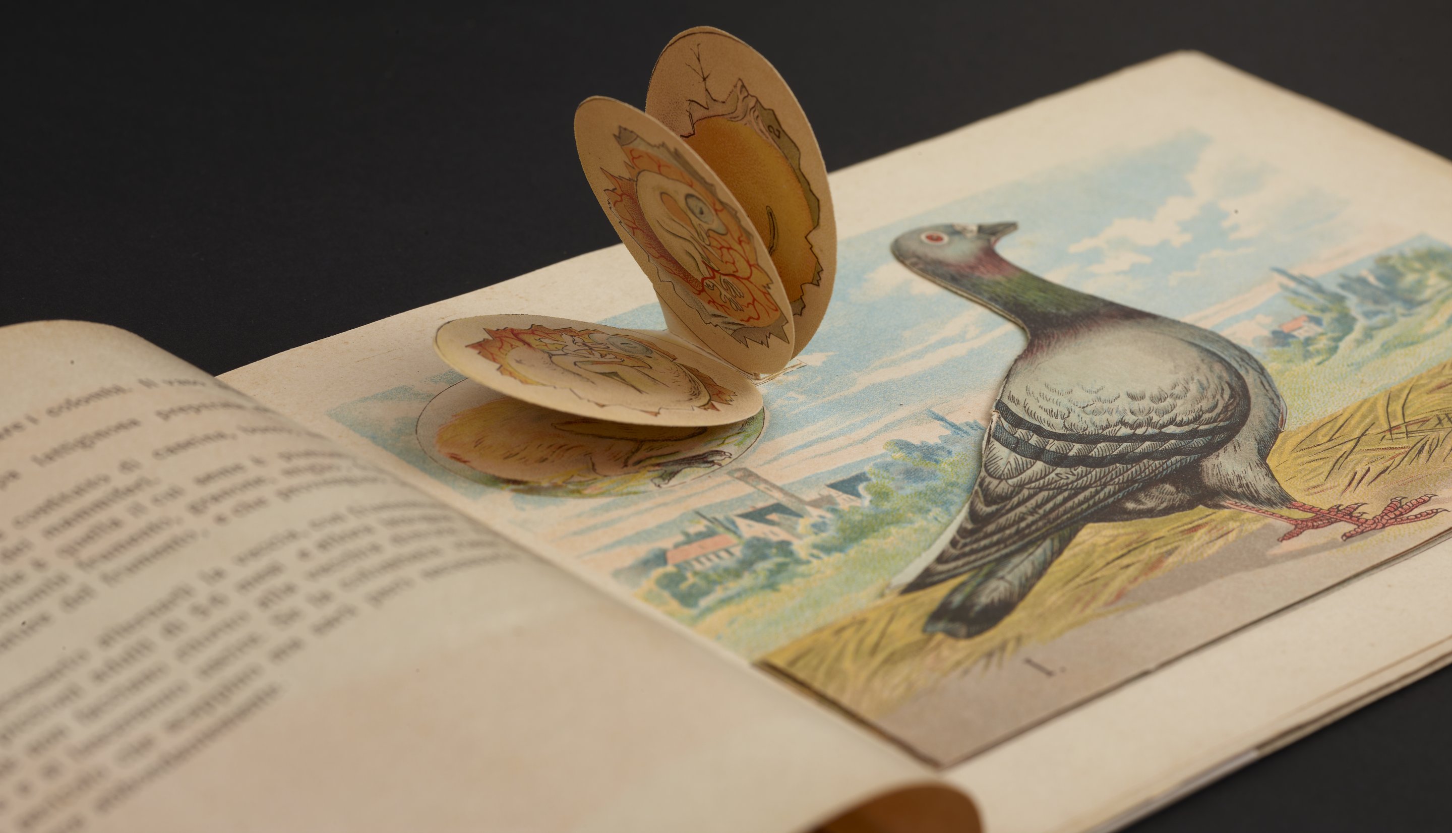 Small JPG1200 x 453px — 85.7 KBLarge JPG2880 x 1087px — 393 KBFull-sized JPG8895 x 3358px — 3.0 MBOriginal fileTIFF — 8895 x 3358px — 85.5 MBItalian-language book on the anatomy of the pigeon. It includes a color illustration of a pigeon and a pigeon egg. The pigeon is composed of two large, double-sided flaps and a series of smaller flaps, each of which lifts to reveal the anatomical layer beneath it, from the pigeon's outer body to its skeleton, vascular system, muscles, and internal organs. The egg is composed of three double-sided flaps that depict the stages of embryonic development.
