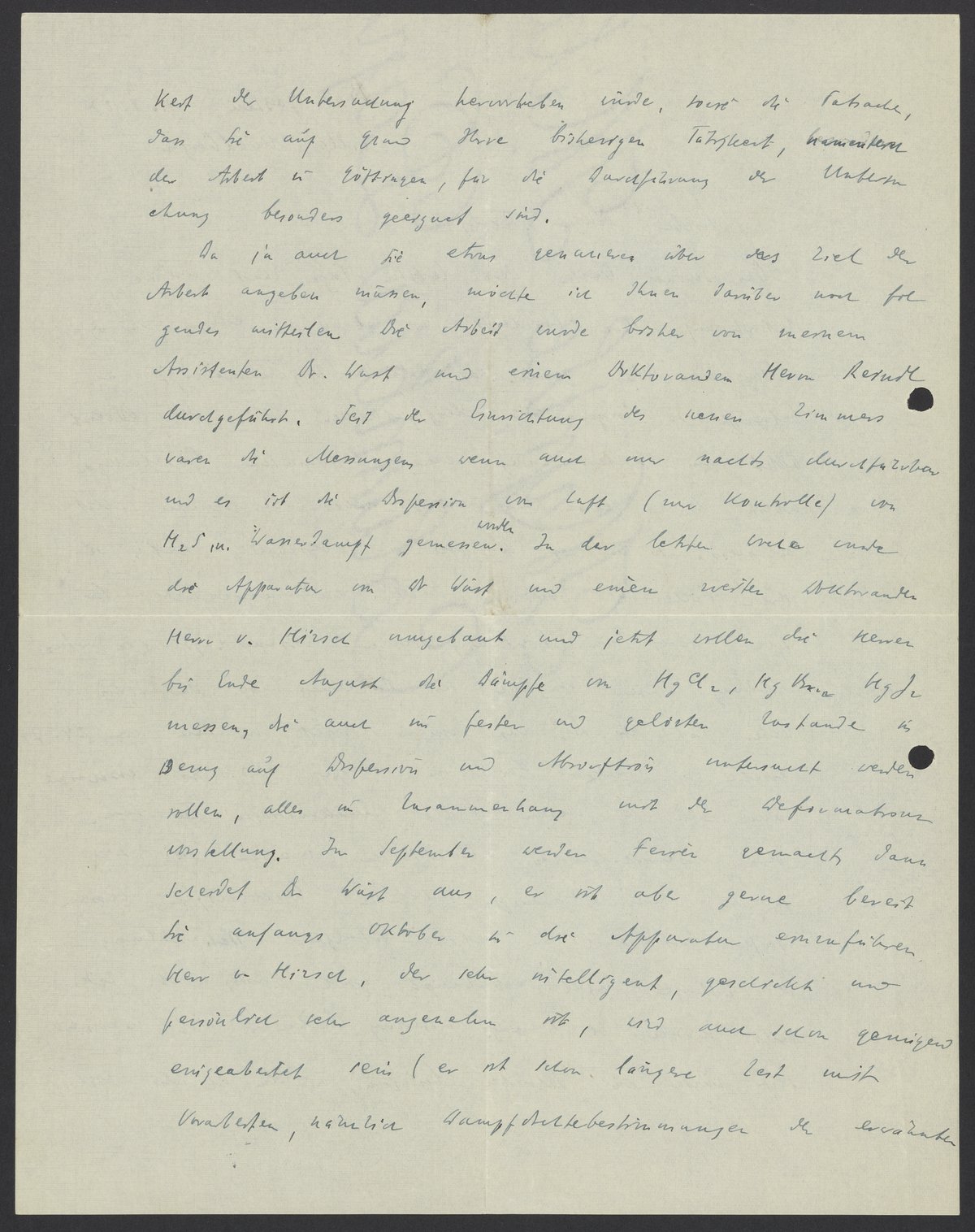 Da ja auch Sie etwas genaueres über das Ziel der Arbeit angeben müssen, möchte ich Ihnen darüber noch folgendes mitteilen. Die Arbeit wurde bisher von meinem Assistenten Dr. Wüst und einem Doktoranden Herrn Reindl durchgeführt. Seit der Einrichtung des neuen Zimmers waren die Messungen wenn auch nur nachts durchzufuhren und es ist die Dispersion von Luft (zur Kontrolle) von H2S in Wasserdampf gemessen wurden. In der letzten Woche wurden die Apparaten von Dr. Wüst und einem zweiten Doktoranden Herrn von Hirsch umgebaut und jetzt wollen die Herren bis Ende August die Dämpfe von HgCl2, HgBr, HgO2 messen, die auch im festen und gelösten Zustande in Bezug auf Dispersion und Absorption untersucht werden sollen, alles in Zusammenhang mit der Deformationsumstellung. Im September werden Ferien gemacht, dann scheidet Dr. Wust aus, er ist aber gerne bereit Sie anfangs Oktober in die Apparaten einzuführen. Herr v. Hirsch, der sehr er sehr intelligent, geschickt und persönlich sehr angenehm ist, wird auch schon genügend eingearbeitet sein (er ist schon längere Zeit mit Vorarbeiten, nämlich Dampfstellebestimmungen der erwähnten