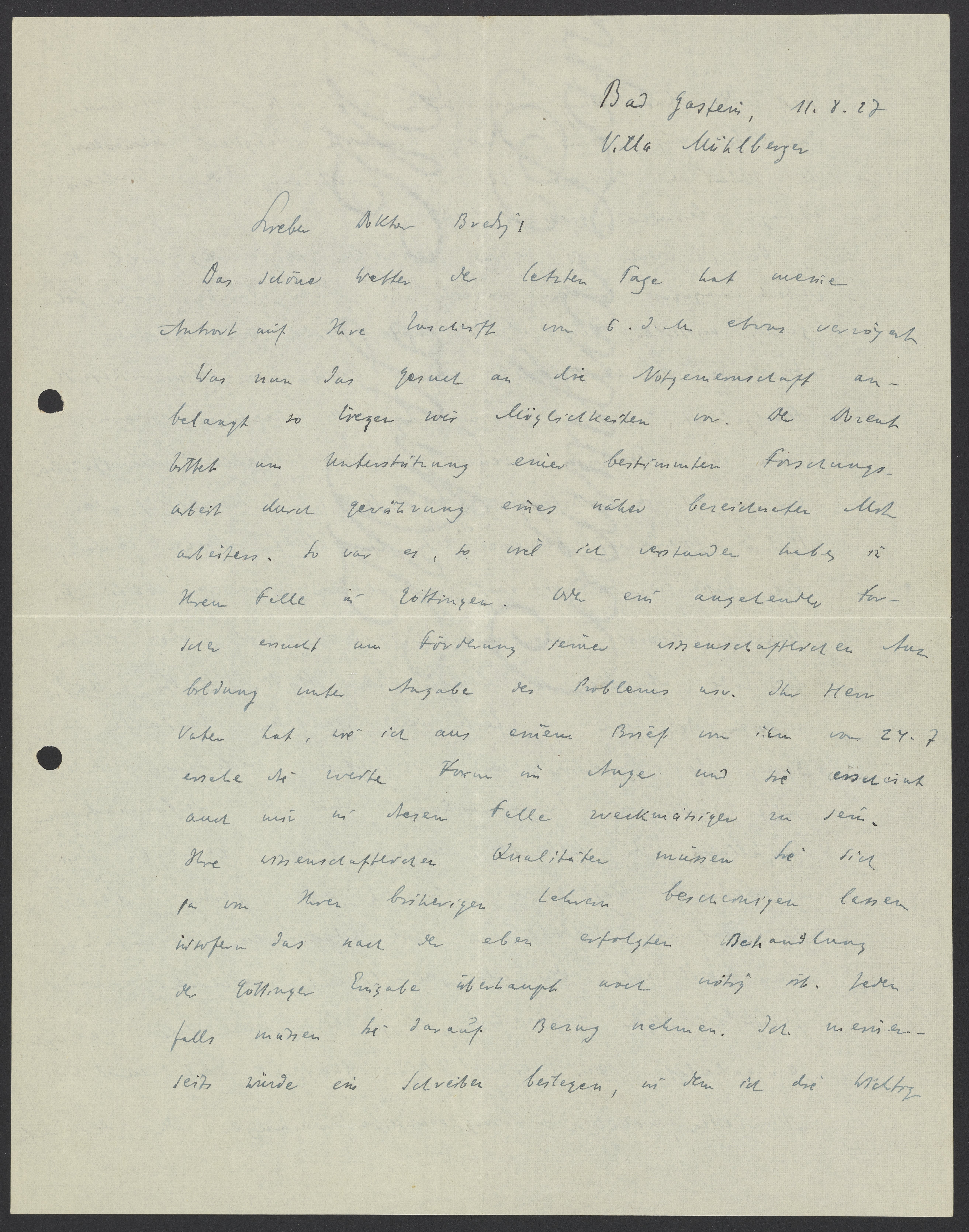 Das schöne Wetter der letzten Tage hat meine Antwort auf Ihre Zuschrift vom 6 d.M. etwas verzögert. Was nun das Gesuch an die Notgemeinschaft anbelangt liegen zwei Möglichkeiten vor. Der Dozent bittet um Unterstützung einer bestimmten Forschungsarbeit durch Gewährung eines näher bezeichneten Mitarbeiters. So war es, so viel ich verstanden habe in Ihrem Falle in Göttingen. Oder ein anzielender Forscher ersucht um Förderung seiner wissenschaftlichen Ausbildung unter Angabe des Problems usw. Ihr Herrn Vater hat, wie ich aus einem Brief von ihm von 24.7. ersehe, die werte Form im Auge und sie auch mir in Ihrem Falle zweckmäßiger zu sein. Ihre wissenschaftlichen Qualitäten müssen Sie sich ja von Ihren bisherigen ja von Ihren bisherigen Lehrern bescheinigen lassen insofern das nach der eben erfolgten Behandlung der Göttingen Eingabe überhaupt noch nötig ist. Jedenfalls müssen Sie darauf Bezug nehmen. Ich meinerseits würde ein Schreiben beilegen, in dem ist die Wichtigkeit