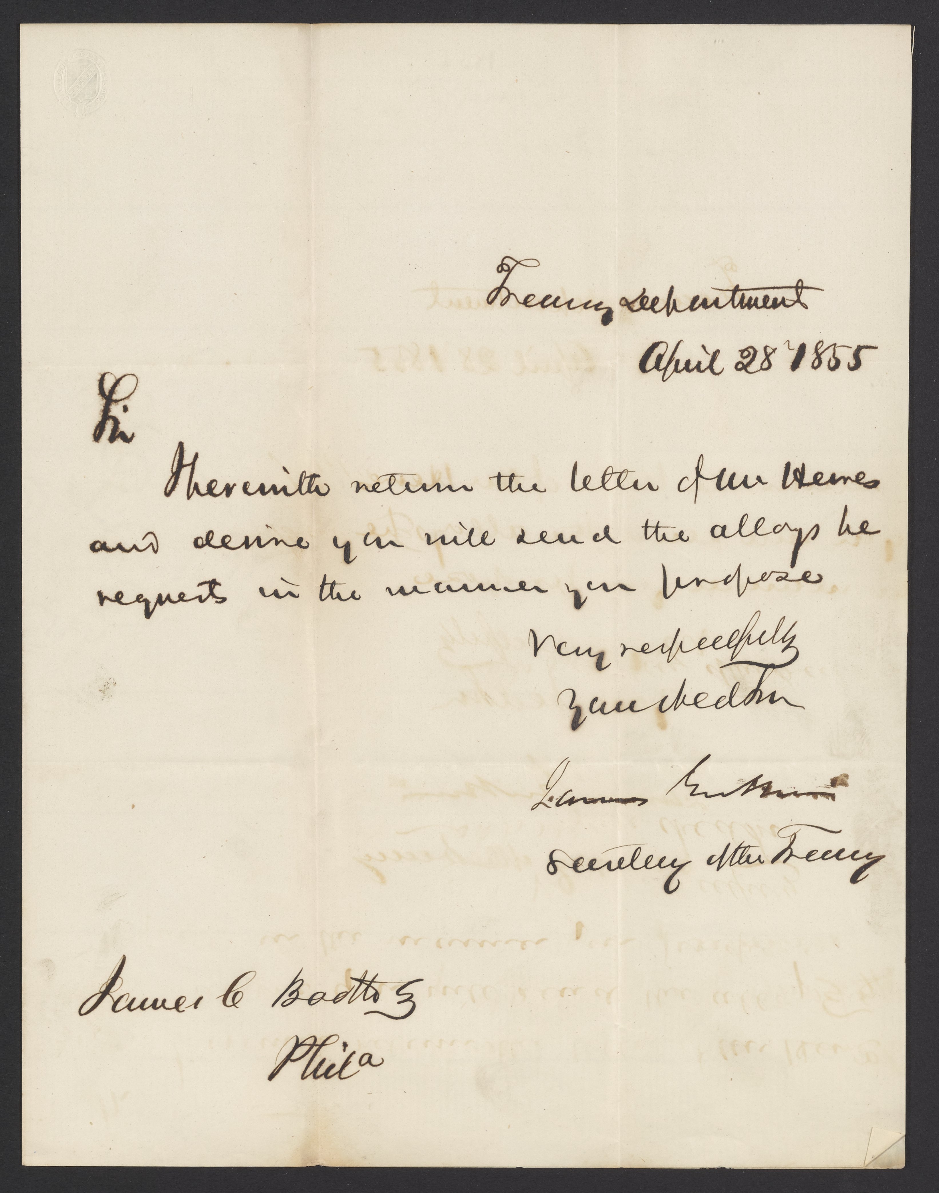 Small JPG1200 x 1523px — 181 KBLarge JPG2880 x 3655px — 1019 KBFull-sized JPG3283 x 4167px — 1.3 MBOriginal fileTIFF — 3283 x 4167px — 39.2 MBJames B. Guthrie (1792 - 1869), United States Secretary of the Treasury from 1853-1857, writes to James Curtis Booth (1810-1888) with an order for fusible alloys.